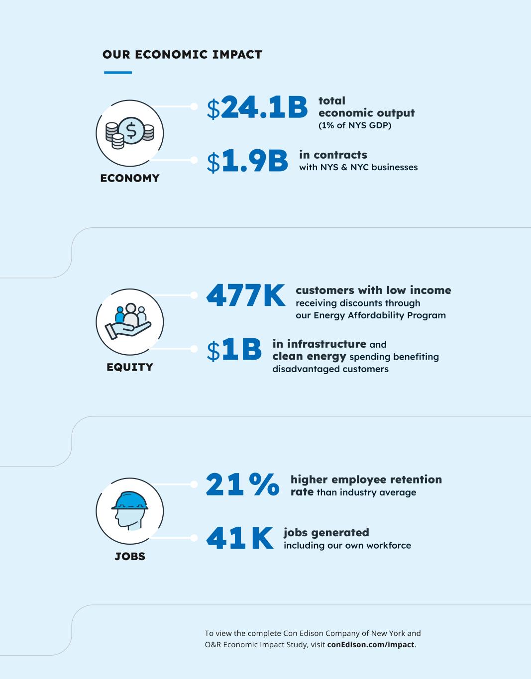 Con Edison Annual Report 2024 ECONOMY EQUITY JOBS $24.1B total economic output (1% of NYS GDP) $1.9B in contracts with NYS & NYC businesses 41K jobs generated including our own workforce in infrastructure and clean energy spending benefiting disadvantaged customers 21% 477K customers with low income receiving discounts through our Energy Affordability Program $1B higher employee retention rate than industry average To view the complete Con Edison Company of New York and O&R Economic Impact Study, visit conEdison.com/impact. OUR ECONOMIC IMPACT 440484_Annual Report-2024_PRESS_N_CVR.indd 4 3/12/25 2:51 PM