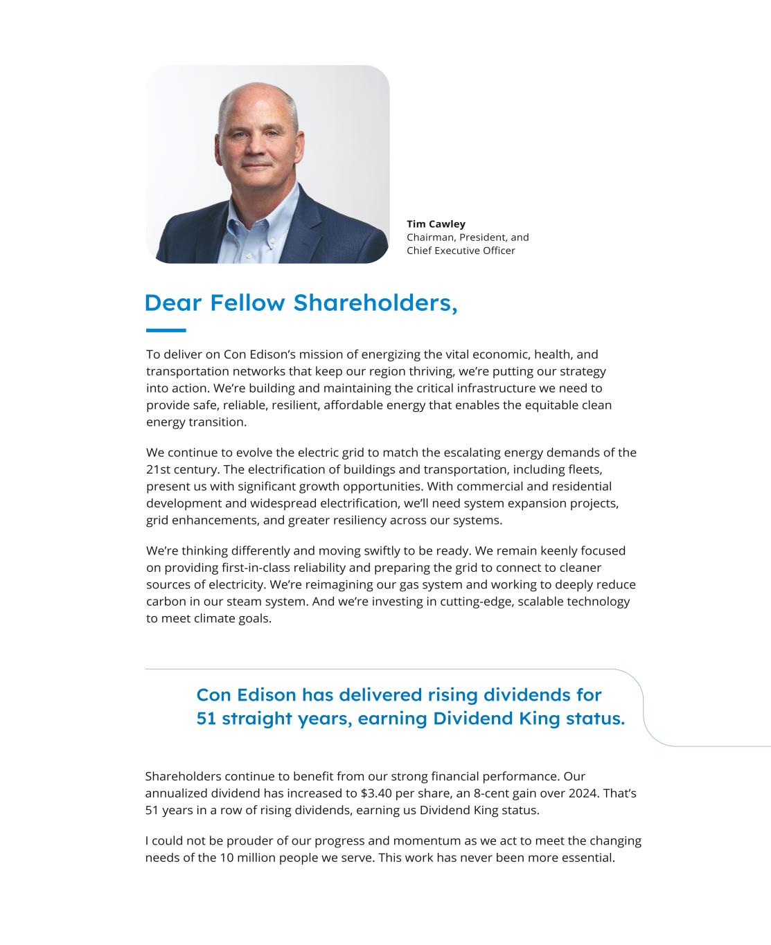 Dear Fellow Shareholders, To deliver on Con Edison’s mission of energizing the vital economic, health, and transportation networks that keep our region thriving, we’re putting our strategy into action. We’re building and maintaining the critical infrastructure we need to provide safe, reliable, resilient, affordable energy that enables the equitable clean energy transition. We continue to evolve the electric grid to match the escalating energy demands of the 21st century. The electrification of buildings and transportation, including fleets, present us with significant growth opportunities. With commercial and residential development and widespread electrification, we’ll need system expansion projects, grid enhancements, and greater resiliency across our systems. We’re thinking differently and moving swiftly to be ready. We remain keenly focused on providing first-in-class reliability and preparing the grid to connect to cleaner sources of electricity. We’re reimagining our gas system and working to deeply reduce carbon in our steam system. And we’re investing in cutting-edge, scalable technology to meet climate goals. Tim Cawley Chairman, President, and Chief Executive Officer Con Edison has delivered rising dividends for 51 straight years, earning Dividend King status. Shareholders continue to benefit from our strong financial performance. Our annualized dividend has increased to $3.40 per share, an 8-cent gain over 2024. That’s 51 years in a row of rising dividends, earning us Dividend King status. I could not be prouder of our progress and momentum as we act to meet the changing needs of the 10 million people we serve. This work has never been more essential. 440484_Annual Report-2024_PRESS_N_NARR.indd 1 3/12/25 1:08 PM