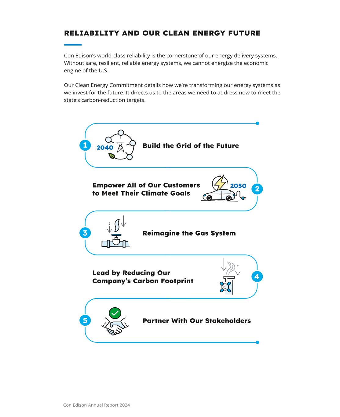 Con Edison Annual Report 2024 Build the Grid of the Future Empower All of Our Customers to Meet Their Climate Goals 2040 2050 1 2 Partner With Our Stakeholders 5 Reimagine the Gas System Lead by Reducing Our Company’s Carbon Footprint 3 4 RELIABILITY AND OUR CLEAN ENERGY FUTURE Con Edison’s world-class reliability is the cornerstone of our energy delivery systems. Without safe, resilient, reliable energy systems, we cannot energize the economic engine of the U.S. Our Clean Energy Commitment details how we’re transforming our energy systems as we invest for the future. It directs us to the areas we need to address now to meet the state’s carbon-reduction targets. 440484_Annual Report-2024_PRESS_N_NARR.indd 2 3/12/25 1:08 PM