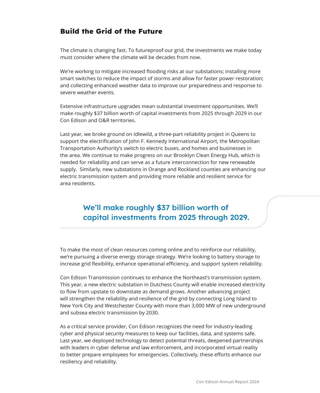 We’re working to mitigate increased flooding risks at our substations; installing more smart switches to reduce the impact of storms and allow for faster power restoration; and collecting enhanced weather data to improve our preparedness and response to severe weather events. Extensive infrastructure upgrades mean substantial investment opportunities. We’ll make roughly $37 billion worth of capital investments from 2025 through 2029 in our Con Edison and O&R territories. Last year, we broke ground on Idlewild, a three-part reliability project in Queens to support the electrification of John F. Kennedy International Airport, the Metropolitan Transportation Authority’s switch to electric buses, and homes and businesses in the area. We continue to make progress on our Brooklyn Clean Energy Hub, which is needed for reliability and can serve as a future interconnection for new renewable supply. Similarly, new substations in Orange and Rockland counties are enhancing our electric transmission system and providing more reliable and resilient service for area residents. Build the Grid of the Future The climate is changing fast. To futureproof our grid, the investments we make today must consider where the climate will be decades from now. We’ll make roughly $37 billion worth of capital investments from 2025 through 2029. To make the most of clean resources coming online and to reinforce our reliability, we’re pursuing a diverse energy storage strategy. We’re looking to battery storage to increase grid flexibility, enhance operational efficiency, and support system reliability. Con Edison Transmission continues to enhance the Northeast’s transmission system. This year, a new electric substation in Dutchess County will enable increased electricity to flow from upstate to downstate as demand grows. Another advancing project will strengthen the reliability and resilience of the grid by connecting Long Island to New York City and Westchester County with more than 3,000 MW of new underground and subsea electric transmission by 2030. As a critical service provider, Con Edison recognizes the need for industry-leading cyber and physical security measures to keep our facilities, data, and systems safe. Last year, we deployed technology to detect potential threats, deepened partnerships with leaders in cyber defense and law enforcement, and incorporated virtual reality to better prepare employees for emergencies. Collectively, these efforts enhance our resiliency and reliability. Con Edison Annual Report 2024 440484_Annual Report-2024_PRESS_N_NARR.indd 3 3/12/25 1:08 PM