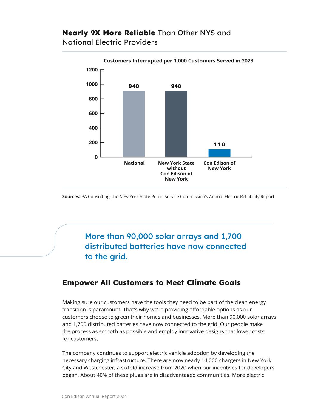 More than 90,000 solar arrays and 1,700 distributed batteries have now connected to the grid. Empower All Customers to Meet Climate Goals Making sure our customers have the tools they need to be part of the clean energy transition is paramount. That’s why we’re providing affordable options as our customers choose to green their homes and businesses. More than 90,000 solar arrays and 1,700 distributed batteries have now connected to the grid. Our people make the process as smooth as possible and employ innovative designs that lower costs for customers. The company continues to support electric vehicle adoption by developing the necessary charging infrastructure. There are now nearly 14,000 chargers in New York City and Westchester, a sixfold increase from 2020 when our incentives for developers began. About 40% of these plugs are in disadvantaged communities. More electric 0 200 400 600 800 1000 1200 National New York State without Con Edison of New York Con Edison of New York Customers Interrupted per 1,000 Customers Served in 2023 940940 110 Nearly 9X Times More Reliable Than Other NYS and National Electric Providers Nearly 9X More Reliable Than Other NYS and National Electric Providers Sources: PA Consulting, the New York State Public Service Commission’s Annual Electric Reliability Report Con Edison Annual Report 2024 440484_Annual Report-2024_PRESS_N_NARR.indd 4 3/12/25 1:08 PM