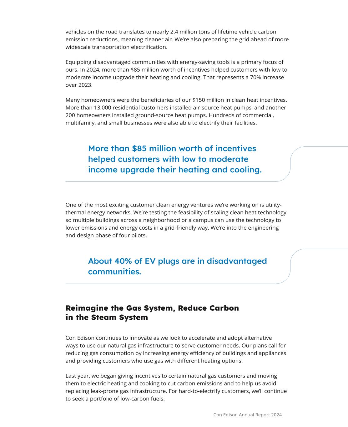 Con Edison Annual Report 2024 Reimagine the Gas System, Reduce Carbon in the Steam System Con Edison continues to innovate as we look to accelerate and adopt alternative ways to use our natural gas infrastructure to serve customer needs. Our plans call for reducing gas consumption by increasing energy efficiency of buildings and appliances and providing customers who use gas with different heating options. Last year, we began giving incentives to certain natural gas customers and moving them to electric heating and cooking to cut carbon emissions and to help us avoid replacing leak-prone gas infrastructure. For hard-to-electrify customers, we’ll continue to seek a portfolio of low-carbon fuels. vehicles on the road translates to nearly 2.4 million tons of lifetime vehicle carbon emission reductions, meaning cleaner air. We’re also preparing the grid ahead of more widescale transportation electrification. Equipping disadvantaged communities with energy-saving tools is a primary focus of ours. In 2024, more than $85 million worth of incentives helped customers with low to moderate income upgrade their heating and cooling. That represents a 70% increase over 2023. Many homeowners were the beneficiaries of our $150 million in clean heat incentives. More than 13,000 residential customers installed air-source heat pumps, and another 200 homeowners installed ground-source heat pumps. Hundreds of commercial, multifamily, and small businesses were also able to electrify their facilities. More than $85 million worth of incentives helped customers with low to moderate income upgrade their heating and cooling. About 40% of EV plugs are in disadvantaged communities. One of the most exciting customer clean energy ventures we’re working on is utility- thermal energy networks. We’re testing the feasibility of scaling clean heat technology so multiple buildings across a neighborhood or a campus can use the technology to lower emissions and energy costs in a grid-friendly way. We’re into the engineering and design phase of four pilots. 440484_Annual Report-2024_PRESS_N_NARR.indd 5 3/12/25 1:08 PM