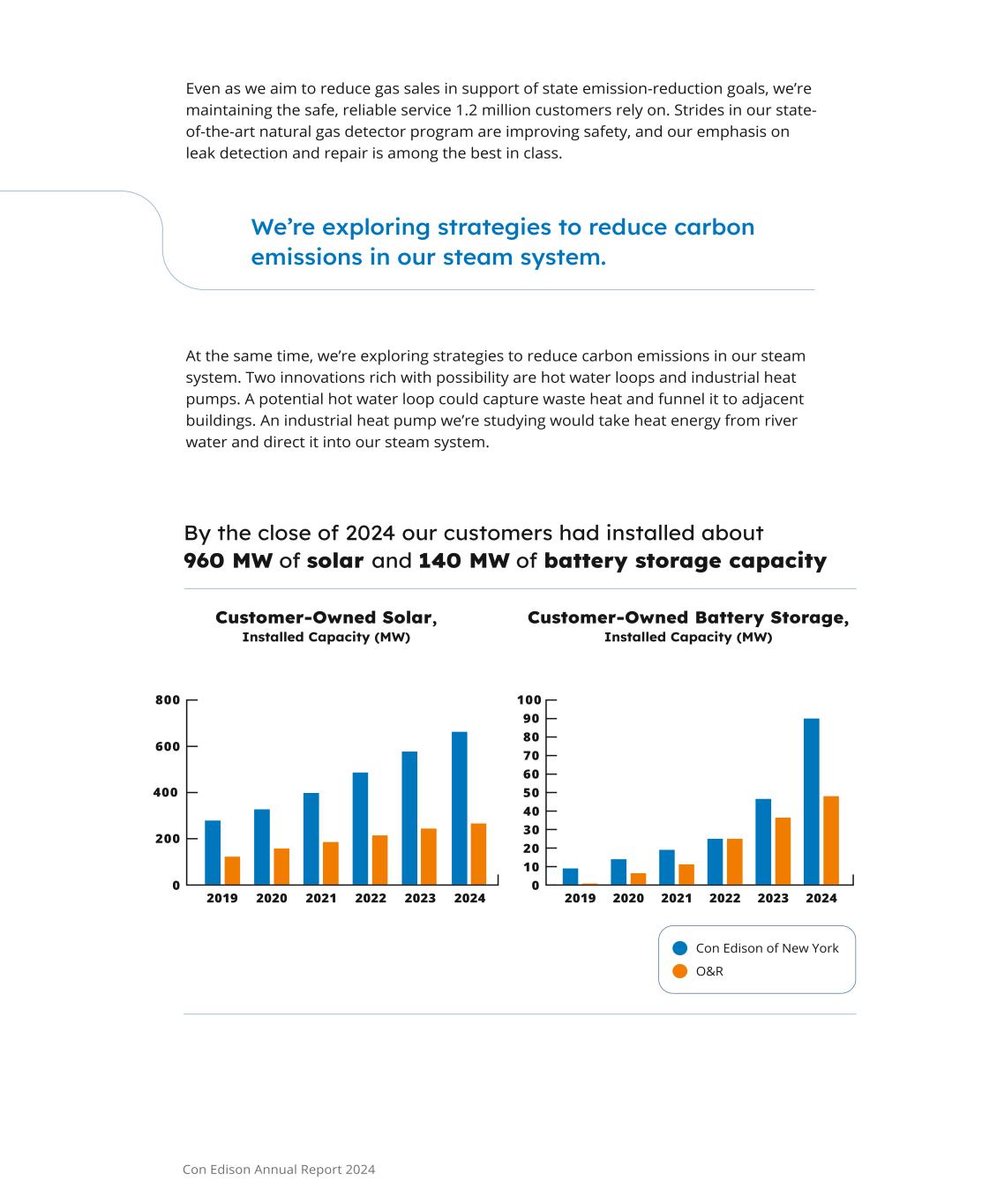 Con Edison Annual Report 2024 By the close of 2024 our customers had installed about 960 MW of solar and 140 MW of battery storage capacity Customer-Owned Solar, Installed Capacity (MW) Customer-Owned Battery Storage, Installed Capacity (MW) 2019 2020 2021 2022 2023 2024 2019 2020 2021 2022 2023 2024 0 200 400 600 800 100 0 10 20 30 40 50 60 70 80 90 Con Edison of New York O&R Even as we aim to reduce gas sales in support of state emission-reduction goals, we’re maintaining the safe, reliable service 1.2 million customers rely on. Strides in our state- of-the-art natural gas detector program are improving safety, and our emphasis on leak detection and repair is among the best in class. We’re exploring strategies to reduce carbon emissions in our steam system. At the same time, we’re exploring strategies to reduce carbon emissions in our steam system. Two innovations rich with possibility are hot water loops and industrial heat pumps. A potential hot water loop could capture waste heat and funnel it to adjacent buildings. An industrial heat pump we’re studying would take heat energy from river water and direct it into our steam system. 440484_Annual Report-2024_PRESS_N_NARR.indd 6 3/12/25 1:08 PM