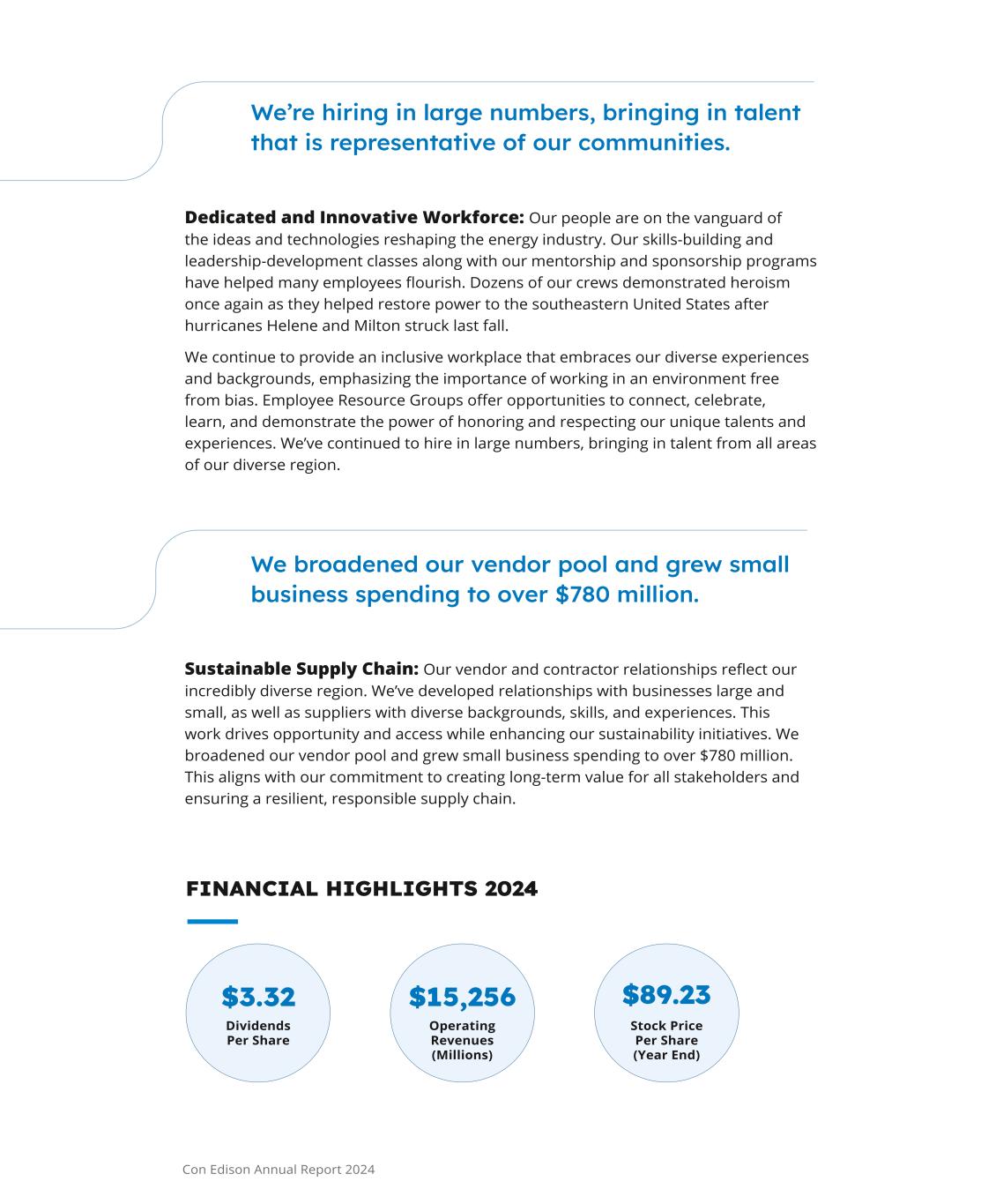 Con Edison Annual Report 2024 Dedicated and Innovative Workforce: Our people are on the vanguard of the ideas and technologies reshaping the energy industry. Our skills-building and leadership-development classes along with our mentorship and sponsorship programs have helped many employees flourish. Dozens of our crews demonstrated heroism once again as they helped restore power to the southeastern United States after hurricanes Helene and Milton struck last fall. We continue to provide an inclusive workplace that embraces our diverse experiences and backgrounds, emphasizing the importance of working in an environment free from bias. Employee Resource Groups offer opportunities to connect, celebrate, learn, and demonstrate the power of honoring and respecting our unique talents and experiences. We’ve continued to hire in large numbers, bringing in talent from all areas of our diverse region. We’re hiring in large numbers, bringing in talent that is representative of our communities. We broadened our vendor pool and grew small business spending to over $780 million. Sustainable Supply Chain: Our vendor and contractor relationships reflect our incredibly diverse region. We’ve developed relationships with businesses large and small, as well as suppliers with diverse backgrounds, skills, and experiences. This work drives opportunity and access while enhancing our sustainability initiatives. We broadened our vendor pool and grew small business spending to over $780 million. This aligns with our commitment to creating long-term value for all stakeholders and ensuring a resilient, responsible supply chain. FINANCIAL HIGHLIGHTS 2024 Dividends Per Share $3.32 Operating Revenues (Millions) $15,256 Stock Price Per Share (Year End) $89.23 440484_Annual Report-2024_PRESS_N_NARR.indd 8 3/12/25 1:08 PM