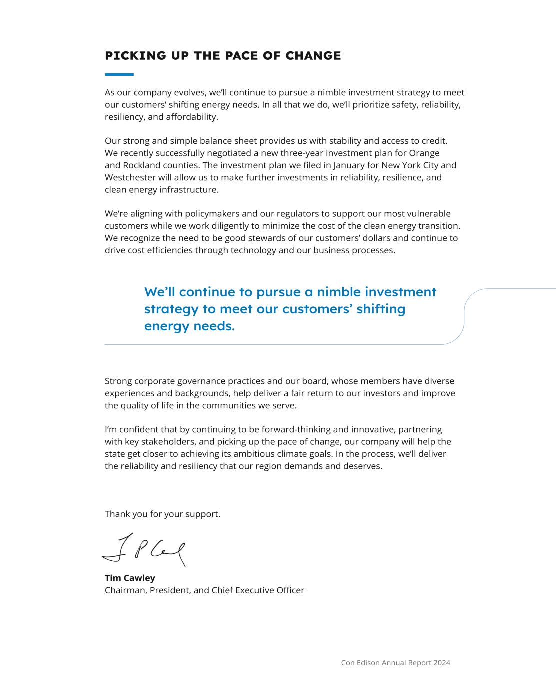 Con Edison Annual Report 2024 PICKING UP THE PACE OF CHANGE As our company evolves, we’ll continue to pursue a nimble investment strategy to meet our customers’ shifting energy needs. In all that we do, we’ll prioritize safety, reliability, resiliency, and affordability. Our strong and simple balance sheet provides us with stability and access to credit. We recently successfully negotiated a new three-year investment plan for Orange and Rockland counties. The investment plan we filed in January for New York City and Westchester will allow us to make further investments in reliability, resilience, and clean energy infrastructure. We’re aligning with policymakers and our regulators to support our most vulnerable customers while we work diligently to minimize the cost of the clean energy transition. We recognize the need to be good stewards of our customers’ dollars and continue to drive cost efficiencies through technology and our business processes. Strong corporate governance practices and our board, whose members have diverse experiences and backgrounds, help deliver a fair return to our investors and improve the quality of life in the communities we serve. I’m confident that by continuing to be forward-thinking and innovative, partnering with key stakeholders, and picking up the pace of change, our company will help the state get closer to achieving its ambitious climate goals. In the process, we’ll deliver the reliability and resiliency that our region demands and deserves. Thank you for your support. Tim Cawley Chairman, President, and Chief Executive Officer We’ll continue to pursue a nimble investment strategy to meet our customers’ shifting energy needs. 440484_Annual Report-2024_PRESS_N_NARR.indd 9 3/12/25 1:08 PM