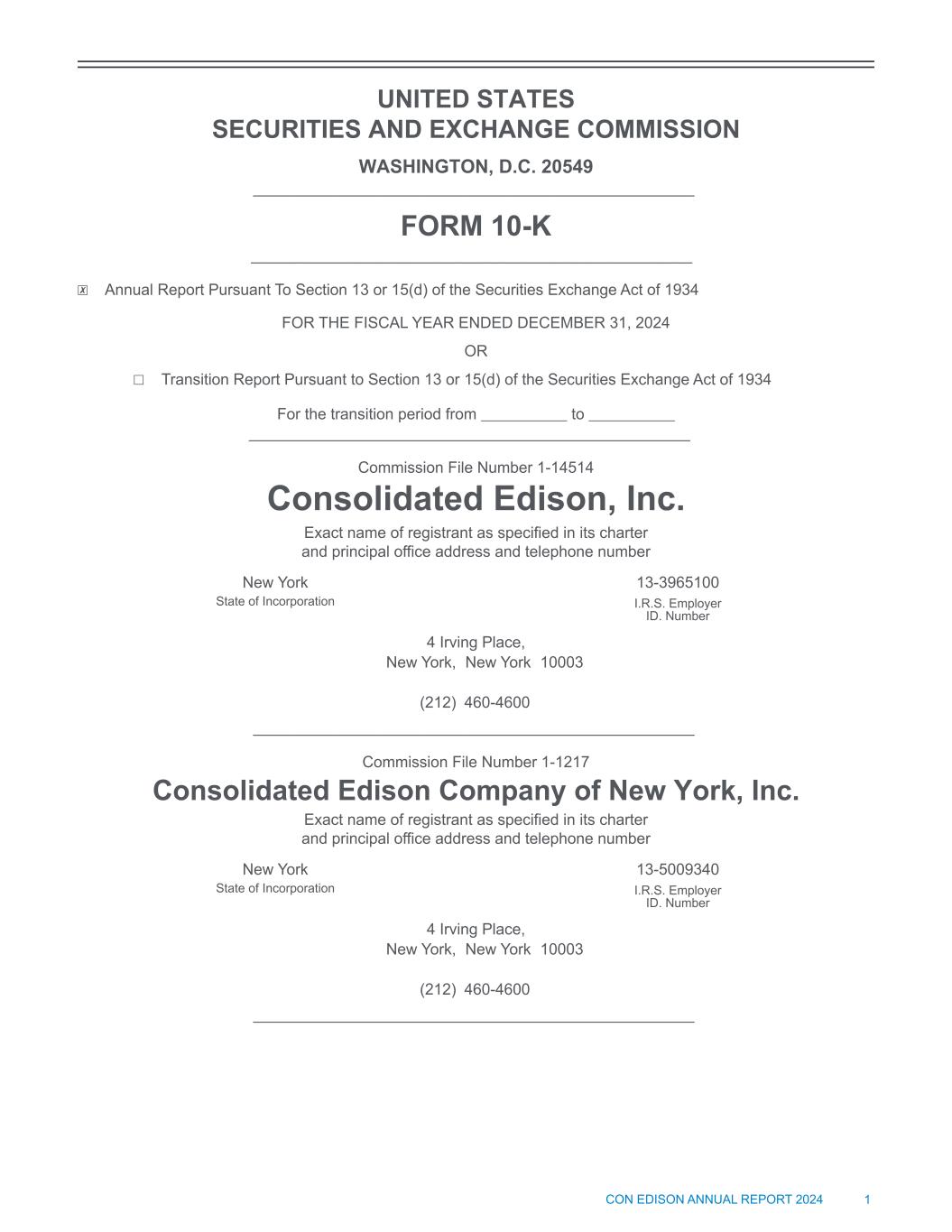 UNITED STATES SECURITIES AND EXCHANGE COMMISSION WASHINGTON, D.C. 20549 ___________________________________________________ FORM 10-K ___________________________________________________ ☒ Annual Report Pursuant To Section 13 or 15(d) of the Securities Exchange Act of 1934 FOR THE FISCAL YEAR ENDED DECEMBER 31, 2024 OR ☐ Transition Report Pursuant to Section 13 or 15(d) of the Securities Exchange Act of 1934 For the transition period from to ___________________________________________________ Commission File Number 1-14514 Consolidated Edison, Inc. Exact name of registrant as specified in its charter and principal office address and telephone number New York 13-3965100 State of Incorporation I.R.S. Employer ID. Number 4 Irving Place, New York, New York 10003 (212) 460-4600 ___________________________________________________ Commission File Number 1-1217 Consolidated Edison Company of New York, Inc. Exact name of registrant as specified in its charter and principal office address and telephone number New York 13-5009340 State of Incorporation I.R.S. Employer ID. Number 4 Irving Place, New York, New York 10003 (212) 460-4600 ___________________________________________________ CON EDISON ANNUAL REPORT 2024 1