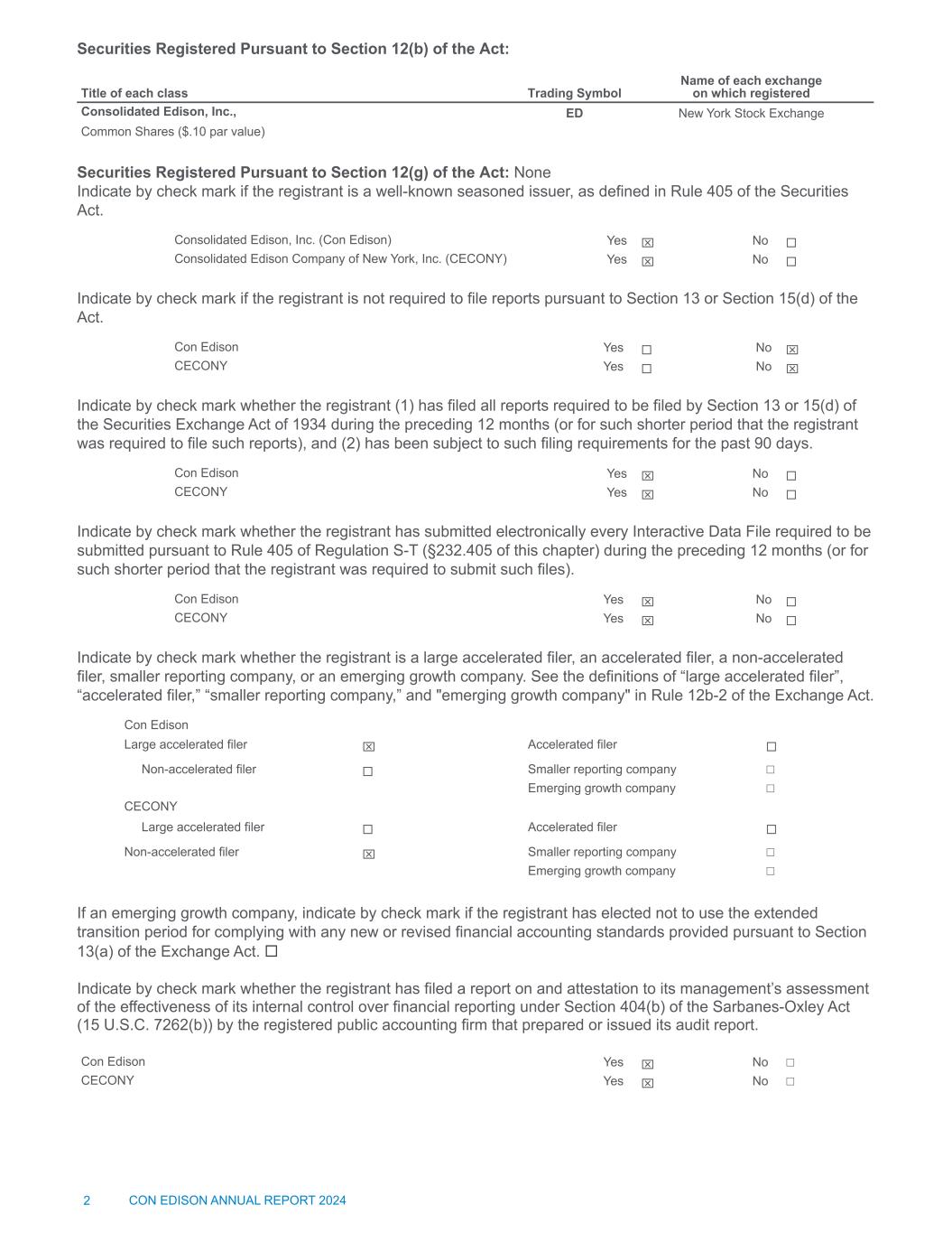 Securities Registered Pursuant to Section 12(b) of the Act: Title of each class Trading Symbol Name of each exchange on which registered Consolidated Edison, Inc., ED New York Stock Exchange Common Shares ($.10 par value) Securities Registered Pursuant to Section 12(g) of the Act: None Indicate by check mark if the registrant is a well-known seasoned issuer, as defined in Rule 405 of the Securities Act. Consolidated Edison, Inc. (Con Edison) Yes x No ¨ Consolidated Edison Company of New York, Inc. (CECONY) Yes x No ¨ Indicate by check mark if the registrant is not required to file reports pursuant to Section 13 or Section 15(d) of the Act. Con Edison Yes ¨ No x CECONY Yes ¨ No x Indicate by check mark whether the registrant (1) has filed all reports required to be filed by Section 13 or 15(d) of the Securities Exchange Act of 1934 during the preceding 12 months (or for such shorter period that the registrant was required to file such reports), and (2) has been subject to such filing requirements for the past 90 days. Con Edison Yes x No ¨ CECONY Yes x No ¨ Indicate by check mark whether the registrant has submitted electronically every Interactive Data File required to be submitted pursuant to Rule 405 of Regulation S-T (§232.405 of this chapter) during the preceding 12 months (or for such shorter period that the registrant was required to submit such files). Con Edison Yes x No ¨ CECONY Yes x No ¨ Indicate by check mark whether the registrant is a large accelerated filer, an accelerated filer, a non-accelerated filer, smaller reporting company, or an emerging growth company. See the definitions of “large accelerated filer”, “accelerated filer,” “smaller reporting company,” and "emerging growth company" in Rule 12b-2 of the Exchange Act. Con Edison Large accelerated filer x Accelerated filer ¨ Non-accelerated filer ¨ Smaller reporting company ☐ Emerging growth company ☐ CECONY Large accelerated filer ¨ Accelerated filer ¨ Non-accelerated filer x Smaller reporting company ☐ Emerging growth company ☐ If an emerging growth company, indicate by check mark if the registrant has elected not to use the extended transition period for complying with any new or revised financial accounting standards provided pursuant to Section 13(a) of the Exchange Act. ¨ Indicate by check mark whether the registrant has filed a report on and attestation to its management’s assessment of the effectiveness of its internal control over financial reporting under Section 404(b) of the Sarbanes-Oxley Act (15 U.S.C. 7262(b)) by the registered public accounting firm that prepared or issued its audit report. Con Edison Yes x No ☐ CECONY Yes x No ☐ 2 CON EDISON ANNUAL REPORT 2024
