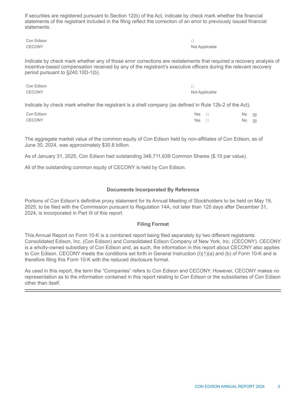 If securities are registered pursuant to Section 12(b) of the Act, indicate by check mark whether the financial statements of the registrant included in the filing reflect the correction of an error to previously issued financial statements. Con Edison ☐ CECONY Not Applicable Indicate by check mark whether any of those error corrections are restatements that required a recovery analysis of incentive-based compensation received by any of the registrant’s executive officers during the relevant recovery period pursuant to §240.10D-1(b). Con Edison ☐ CECONY Not Applicable Indicate by check mark whether the registrant is a shell company (as defined in Rule 12b-2 of the Act). Con Edison Yes ☐ No x CECONY Yes ☐ No x The aggregate market value of the common equity of Con Edison held by non-affiliates of Con Edison, as of June 30, 2024, was approximately $30.8 billion. As of January 31, 2025, Con Edison had outstanding 346,711,639 Common Shares ($.10 par value). All of the outstanding common equity of CECONY is held by Con Edison. Documents Incorporated By Reference Portions of Con Edison’s definitive proxy statement for its Annual Meeting of Stockholders to be held on May 19, 2025, to be filed with the Commission pursuant to Regulation 14A, not later than 120 days after December 31, 2024, is incorporated in Part III of this report. Filing Format This Annual Report on Form 10-K is a combined report being filed separately by two different registrants: Consolidated Edison, Inc. (Con Edison) and Consolidated Edison Company of New York, Inc. (CECONY). CECONY is a wholly-owned subsidiary of Con Edison and, as such, the information in this report about CECONY also applies to Con Edison. CECONY meets the conditions set forth in General Instruction (I)(1)(a) and (b) of Form 10-K and is therefore filing this Form 10-K with the reduced disclosure format. As used in this report, the term the “Companies” refers to Con Edison and CECONY. However, CECONY makes no representation as to the information contained in this report relating to Con Edison or the subsidiaries of Con Edison other than itself. CON EDISON ANNUAL REPORT 2024 3
