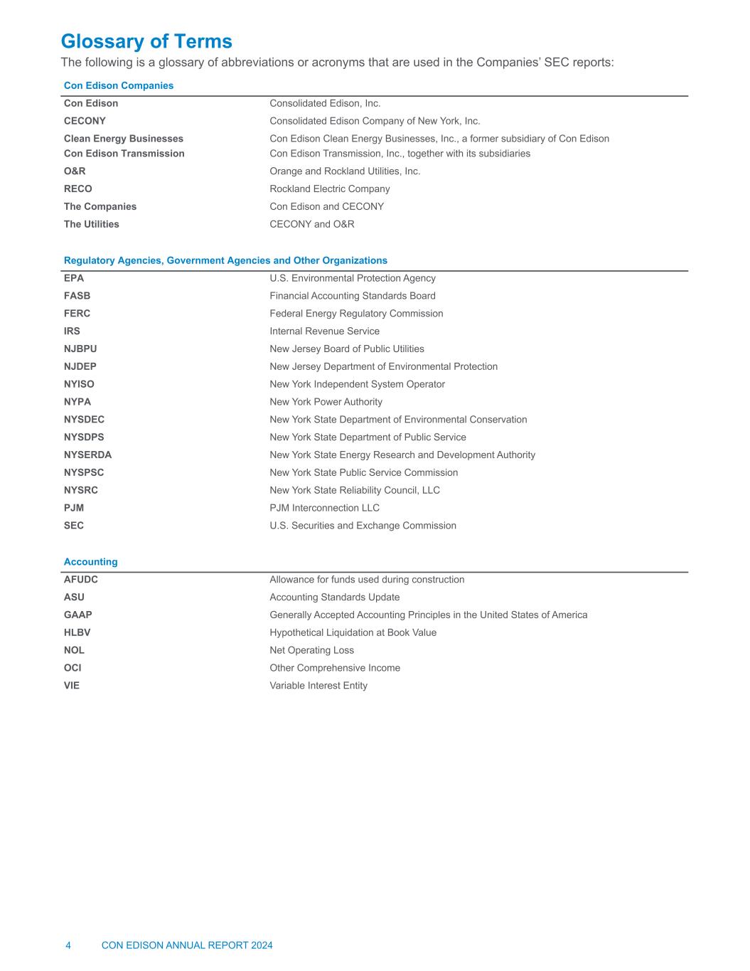 Glossary of Terms The following is a glossary of abbreviations or acronyms that are used in the Companies’ SEC reports: Con Edison Companies Con Edison Consolidated Edison, Inc. CECONY Consolidated Edison Company of New York, Inc. Clean Energy Businesses Con Edison Clean Energy Businesses, Inc., a former subsidiary of Con Edison Con Edison Transmission Con Edison Transmission, Inc., together with its subsidiaries O&R Orange and Rockland Utilities, Inc. RECO Rockland Electric Company The Companies Con Edison and CECONY The Utilities CECONY and O&R Regulatory Agencies, Government Agencies and Other Organizations EPA U.S. Environmental Protection Agency FASB Financial Accounting Standards Board FERC Federal Energy Regulatory Commission IRS Internal Revenue Service NJBPU New Jersey Board of Public Utilities NJDEP New Jersey Department of Environmental Protection NYISO New York Independent System Operator NYPA New York Power Authority NYSDEC New York State Department of Environmental Conservation NYSDPS New York State Department of Public Service NYSERDA New York State Energy Research and Development Authority NYSPSC New York State Public Service Commission NYSRC New York State Reliability Council, LLC PJM PJM Interconnection LLC SEC U.S. Securities and Exchange Commission Accounting AFUDC Allowance for funds used during construction ASU Accounting Standards Update GAAP Generally Accepted Accounting Principles in the United States of America HLBV Hypothetical Liquidation at Book Value NOL Net Operating Loss OCI Other Comprehensive Income VIE Variable Interest Entity 4 CON EDISON ANNUAL REPORT 2024