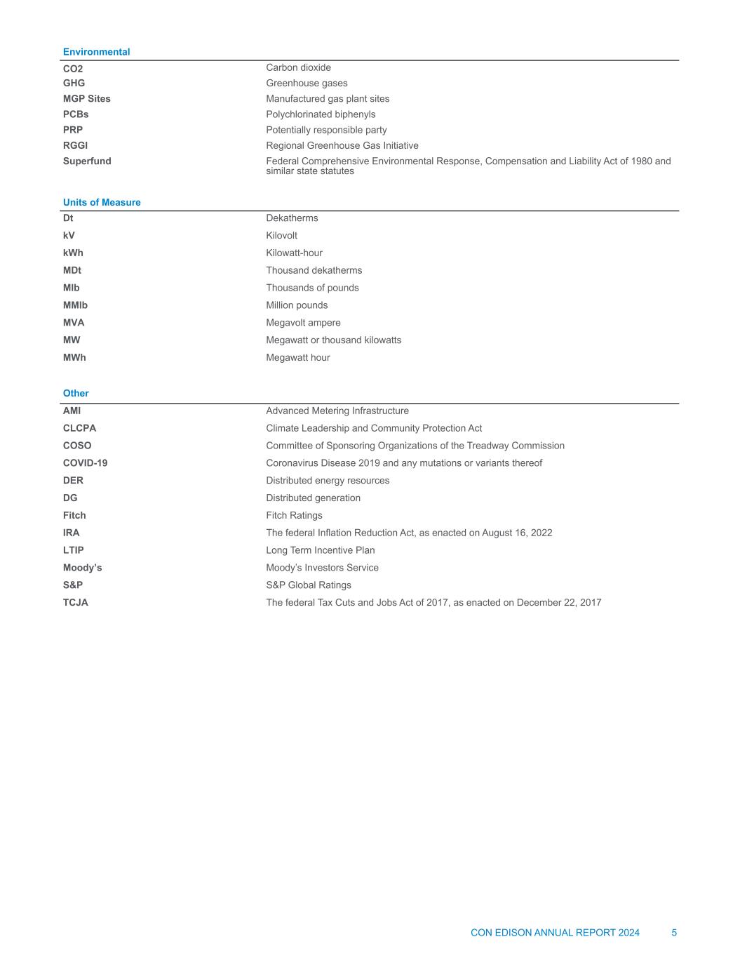 Environmental CO2 Carbon dioxide GHG Greenhouse gases MGP Sites Manufactured gas plant sites PCBs Polychlorinated biphenyls PRP Potentially responsible party RGGI Regional Greenhouse Gas Initiative Superfund Federal Comprehensive Environmental Response, Compensation and Liability Act of 1980 and similar state statutes Units of Measure Dt Dekatherms kV Kilovolt kWh Kilowatt-hour MDt Thousand dekatherms Mlb Thousands of pounds MMlb Million pounds MVA Megavolt ampere MW Megawatt or thousand kilowatts MWh Megawatt hour Other AMI Advanced Metering Infrastructure CLCPA Climate Leadership and Community Protection Act COSO Committee of Sponsoring Organizations of the Treadway Commission COVID-19 Coronavirus Disease 2019 and any mutations or variants thereof DER Distributed energy resources DG Distributed generation Fitch Fitch Ratings IRA The federal Inflation Reduction Act, as enacted on August 16, 2022 LTIP Long Term Incentive Plan Moody’s Moody’s Investors Service S&P S&P Global Ratings TCJA The federal Tax Cuts and Jobs Act of 2017, as enacted on December 22, 2017 CON EDISON ANNUAL REPORT 2024 5