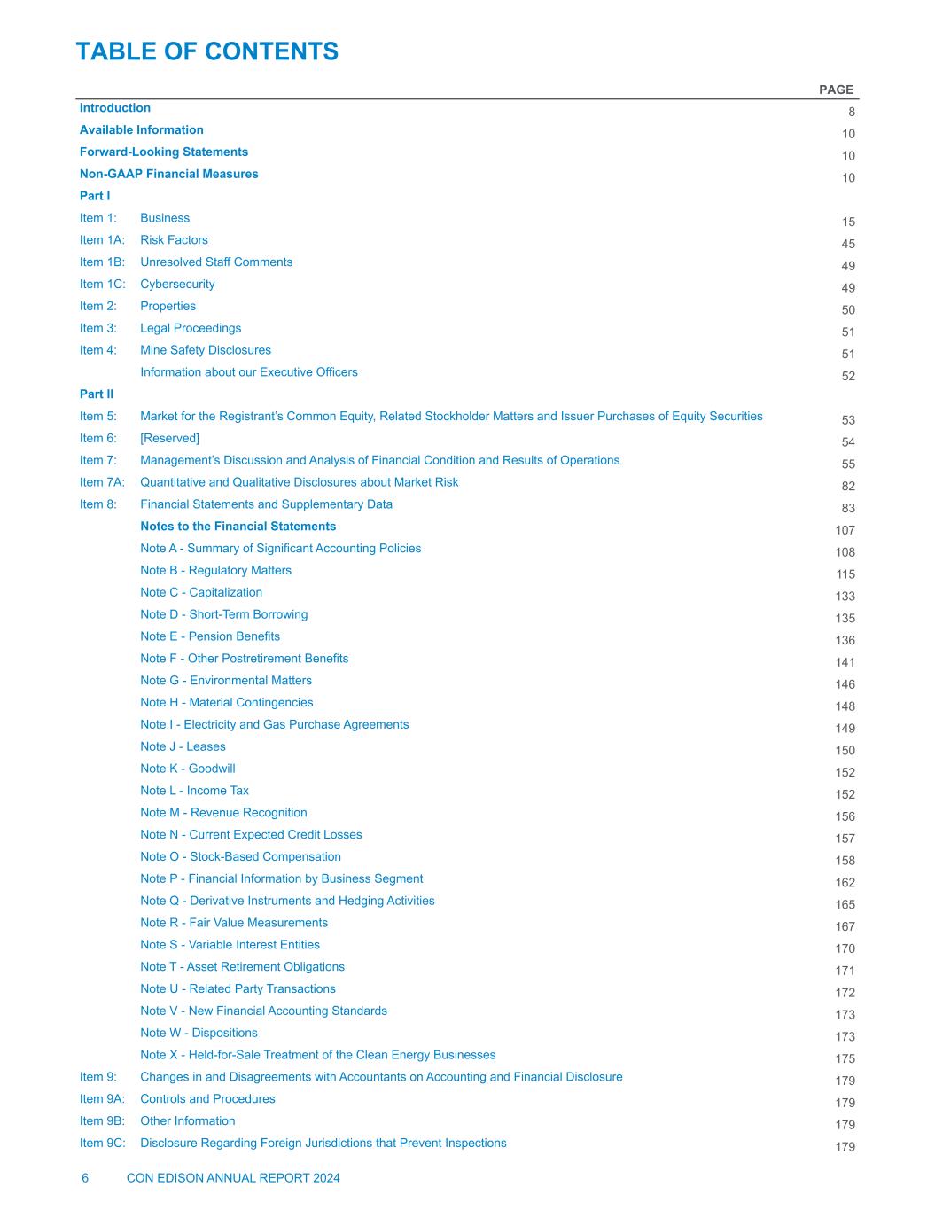TABLE OF CONTENTS PAGE Introduction 8 Available Information 10 Forward-Looking Statements 10 Non-GAAP Financial Measures 10 Part I Item 1: Business 15 Item 1A: Risk Factors 45 Item 1B: Unresolved Staff Comments 49 Item 1C: Cybersecurity 49 Item 2: Properties 50 Item 3: Legal Proceedings 51 Item 4: Mine Safety Disclosures 51 Information about our Executive Officers 52 Part II Item 5: Market for the Registrant’s Common Equity, Related Stockholder Matters and Issuer Purchases of Equity Securities 53 Item 6: [Reserved] 54 Item 7: Management’s Discussion and Analysis of Financial Condition and Results of Operations 55 Item 7A: Quantitative and Qualitative Disclosures about Market Risk 82 Item 8: Financial Statements and Supplementary Data 83 Notes to the Financial Statements 107 Note A - Summary of Significant Accounting Policies 108 Note B - Regulatory Matters 115 Note C - Capitalization 133 Note D - Short-Term Borrowing 135 Note E - Pension Benefits 136 Note F - Other Postretirement Benefits 141 Note G - Environmental Matters 146 Note H - Material Contingencies 148 Note I - Electricity and Gas Purchase Agreements 149 Note J - Leases 150 Note K - Goodwill 152 Note L - Income Tax 152 Note M - Revenue Recognition 156 Note N - Current Expected Credit Losses 157 Note O - Stock-Based Compensation 158 Note P - Financial Information by Business Segment 162 Note Q - Derivative Instruments and Hedging Activities 165 Note R - Fair Value Measurements 167 Note S - Variable Interest Entities 170 Note T - Asset Retirement Obligations 171 Note U - Related Party Transactions 172 Note V - New Financial Accounting Standards 173 Note W - Dispositions 173 Note X - Held-for-Sale Treatment of the Clean Energy Businesses 175 Item 9: Changes in and Disagreements with Accountants on Accounting and Financial Disclosure 179 Item 9A: Controls and Procedures 179 Item 9B: Other Information 179 Item 9C: Disclosure Regarding Foreign Jurisdictions that Prevent Inspections 179 6 CON EDISON ANNUAL REPORT 2024