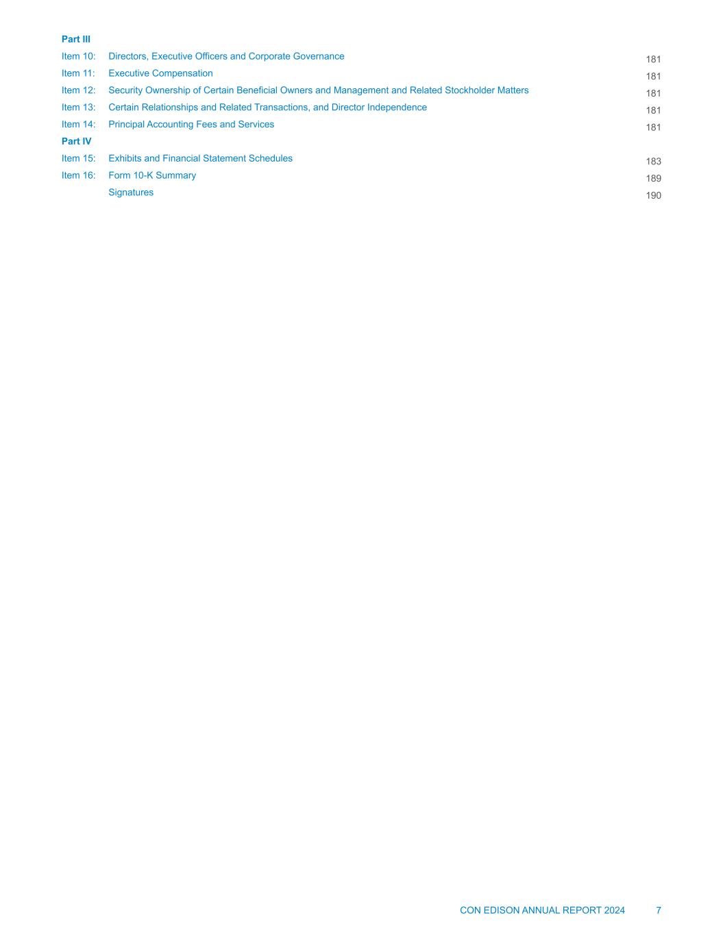 Part III Item 10: Directors, Executive Officers and Corporate Governance 181 Item 11: Executive Compensation 181 Item 12: Security Ownership of Certain Beneficial Owners and Management and Related Stockholder Matters 181 Item 13: Certain Relationships and Related Transactions, and Director Independence 181 Item 14: Principal Accounting Fees and Services 181 Part IV Item 15: Exhibits and Financial Statement Schedules 183 Item 16: Form 10-K Summary 189 Signatures 190 CON EDISON ANNUAL REPORT 2024 7