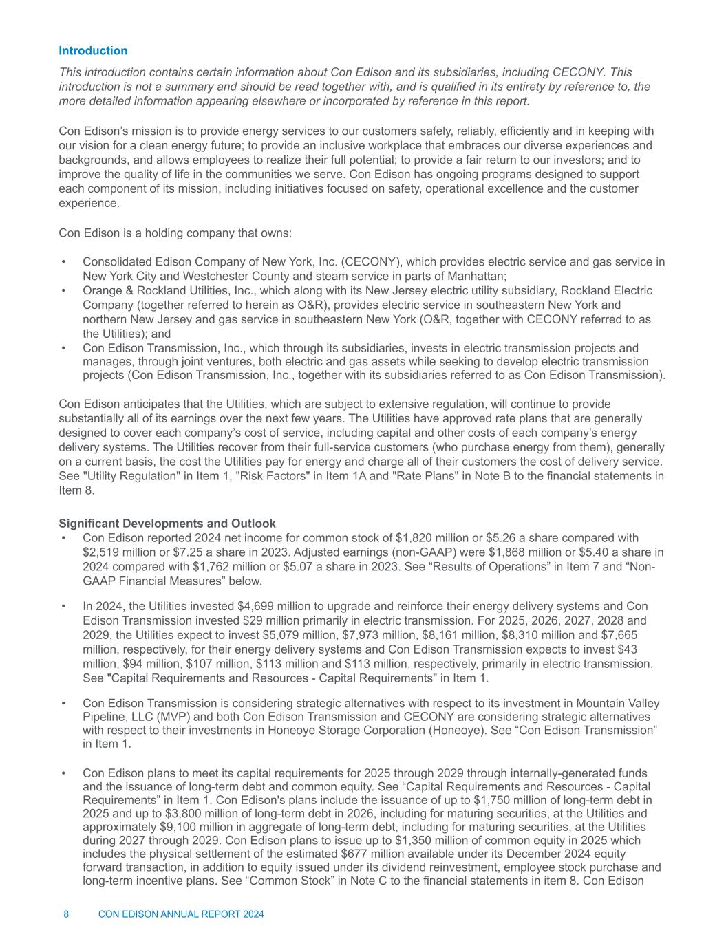 Introduction This introduction contains certain information about Con Edison and its subsidiaries, including CECONY. This introduction is not a summary and should be read together with, and is qualified in its entirety by reference to, the more detailed information appearing elsewhere or incorporated by reference in this report. Con Edison’s mission is to provide energy services to our customers safely, reliably, efficiently and in keeping with our vision for a clean energy future; to provide an inclusive workplace that embraces our diverse experiences and backgrounds, and allows employees to realize their full potential; to provide a fair return to our investors; and to improve the quality of life in the communities we serve. Con Edison has ongoing programs designed to support each component of its mission, including initiatives focused on safety, operational excellence and the customer experience. Con Edison is a holding company that owns: • Consolidated Edison Company of New York, Inc. (CECONY), which provides electric service and gas service in New York City and Westchester County and steam service in parts of Manhattan; • Orange & Rockland Utilities, Inc., which along with its New Jersey electric utility subsidiary, Rockland Electric Company (together referred to herein as O&R), provides electric service in southeastern New York and northern New Jersey and gas service in southeastern New York (O&R, together with CECONY referred to as the Utilities); and • Con Edison Transmission, Inc., which through its subsidiaries, invests in electric transmission projects and manages, through joint ventures, both electric and gas assets while seeking to develop electric transmission projects (Con Edison Transmission, Inc., together with its subsidiaries referred to as Con Edison Transmission). Con Edison anticipates that the Utilities, which are subject to extensive regulation, will continue to provide substantially all of its earnings over the next few years. The Utilities have approved rate plans that are generally designed to cover each company’s cost of service, including capital and other costs of each company’s energy delivery systems. The Utilities recover from their full-service customers (who purchase energy from them), generally on a current basis, the cost the Utilities pay for energy and charge all of their customers the cost of delivery service. See "Utility Regulation" in Item 1, "Risk Factors" in Item 1A and "Rate Plans" in Note B to the financial statements in Item 8. Significant Developments and Outlook • Con Edison reported 2024 net income for common stock of $1,820 million or $5.26 a share compared with $2,519 million or $7.25 a share in 2023. Adjusted earnings (non-GAAP) were $1,868 million or $5.40 a share in 2024 compared with $1,762 million or $5.07 a share in 2023. See “Results of Operations” in Item 7 and “Non- GAAP Financial Measures” below. • In 2024, the Utilities invested $4,699 million to upgrade and reinforce their energy delivery systems and Con Edison Transmission invested $29 million primarily in electric transmission. For 2025, 2026, 2027, 2028 and 2029, the Utilities expect to invest $5,079 million, $7,973 million, $8,161 million, $8,310 million and $7,665 million, respectively, for their energy delivery systems and Con Edison Transmission expects to invest $43 million, $94 million, $107 million, $113 million and $113 million, respectively, primarily in electric transmission. See "Capital Requirements and Resources - Capital Requirements" in Item 1. • Con Edison Transmission is considering strategic alternatives with respect to its investment in Mountain Valley Pipeline, LLC (MVP) and both Con Edison Transmission and CECONY are considering strategic alternatives with respect to their investments in Honeoye Storage Corporation (Honeoye). See “Con Edison Transmission” in Item 1. • Con Edison plans to meet its capital requirements for 2025 through 2029 through internally-generated funds and the issuance of long-term debt and common equity. See “Capital Requirements and Resources - Capital Requirements” in Item 1. Con Edison's plans include the issuance of up to $1,750 million of long-term debt in 2025 and up to $3,800 million of long-term debt in 2026, including for maturing securities, at the Utilities and approximately $9,100 million in aggregate of long-term debt, including for maturing securities, at the Utilities during 2027 through 2029. Con Edison plans to issue up to $1,350 million of common equity in 2025 which includes the physical settlement of the estimated $677 million available under its December 2024 equity forward transaction, in addition to equity issued under its dividend reinvestment, employee stock purchase and long-term incentive plans. See “Common Stock” in Note C to the financial statements in item 8. Con Edison 8 CON EDISON ANNUAL REPORT 2024