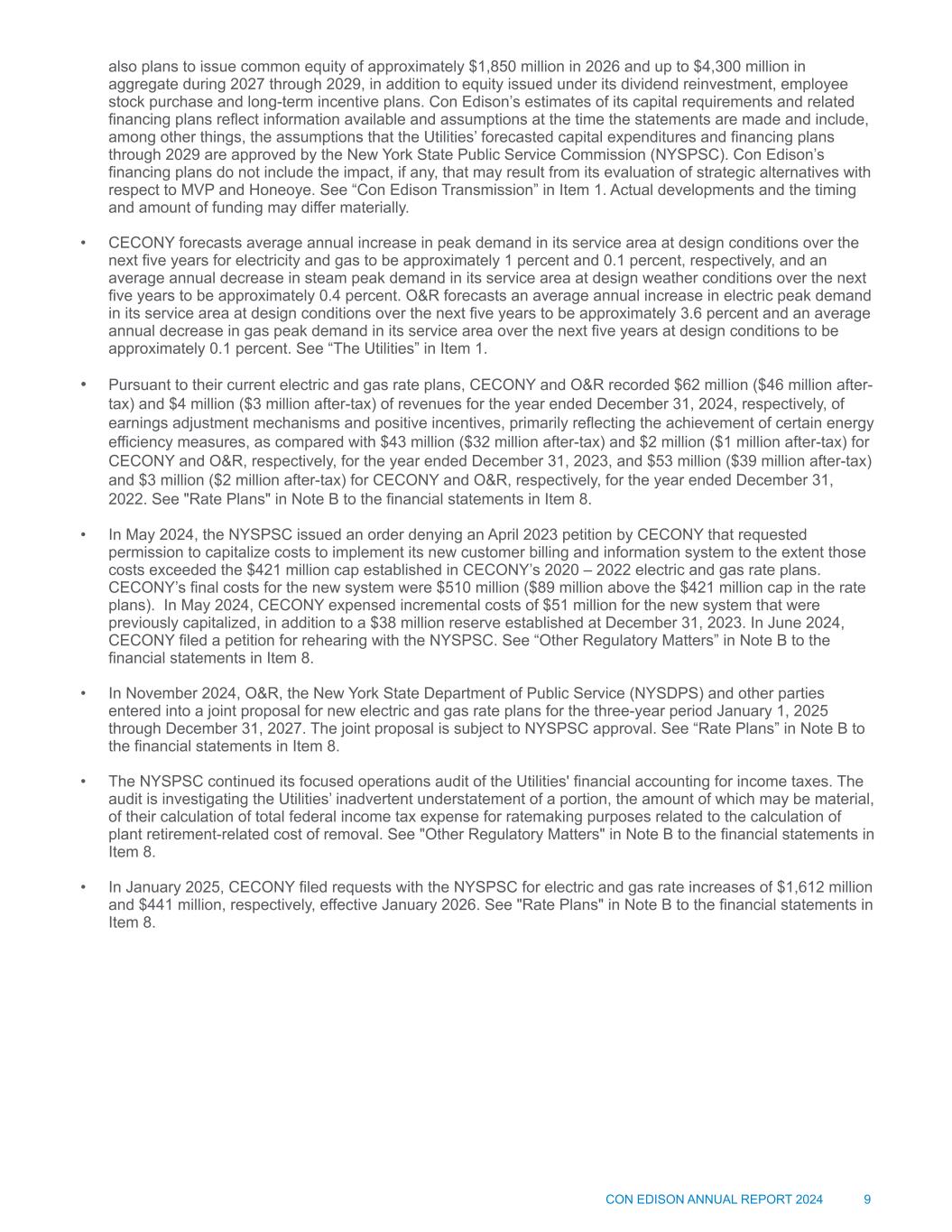 also plans to issue common equity of approximately $1,850 million in 2026 and up to $4,300 million in aggregate during 2027 through 2029, in addition to equity issued under its dividend reinvestment, employee stock purchase and long-term incentive plans. Con Edison’s estimates of its capital requirements and related financing plans reflect information available and assumptions at the time the statements are made and include, among other things, the assumptions that the Utilities’ forecasted capital expenditures and financing plans through 2029 are approved by the New York State Public Service Commission (NYSPSC). Con Edison’s financing plans do not include the impact, if any, that may result from its evaluation of strategic alternatives with respect to MVP and Honeoye. See “Con Edison Transmission” in Item 1. Actual developments and the timing and amount of funding may differ materially. • CECONY forecasts average annual increase in peak demand in its service area at design conditions over the next five years for electricity and gas to be approximately 1 percent and 0.1 percent, respectively, and an average annual decrease in steam peak demand in its service area at design weather conditions over the next five years to be approximately 0.4 percent. O&R forecasts an average annual increase in electric peak demand in its service area at design conditions over the next five years to be approximately 3.6 percent and an average annual decrease in gas peak demand in its service area over the next five years at design conditions to be approximately 0.1 percent. See “The Utilities” in Item 1. • Pursuant to their current electric and gas rate plans, CECONY and O&R recorded $62 million ($46 million after- tax) and $4 million ($3 million after-tax) of revenues for the year ended December 31, 2024, respectively, of earnings adjustment mechanisms and positive incentives, primarily reflecting the achievement of certain energy efficiency measures, as compared with $43 million ($32 million after-tax) and $2 million ($1 million after-tax) for CECONY and O&R, respectively, for the year ended December 31, 2023, and $53 million ($39 million after-tax) and $3 million ($2 million after-tax) for CECONY and O&R, respectively, for the year ended December 31, 2022. See "Rate Plans" in Note B to the financial statements in Item 8. • In May 2024, the NYSPSC issued an order denying an April 2023 petition by CECONY that requested permission to capitalize costs to implement its new customer billing and information system to the extent those costs exceeded the $421 million cap established in CECONY’s 2020 – 2022 electric and gas rate plans. CECONY’s final costs for the new system were $510 million ($89 million above the $421 million cap in the rate plans). In May 2024, CECONY expensed incremental costs of $51 million for the new system that were previously capitalized, in addition to a $38 million reserve established at December 31, 2023. In June 2024, CECONY filed a petition for rehearing with the NYSPSC. See “Other Regulatory Matters” in Note B to the financial statements in Item 8. • In November 2024, O&R, the New York State Department of Public Service (NYSDPS) and other parties entered into a joint proposal for new electric and gas rate plans for the three-year period January 1, 2025 through December 31, 2027. The joint proposal is subject to NYSPSC approval. See “Rate Plans” in Note B to the financial statements in Item 8. • The NYSPSC continued its focused operations audit of the Utilities' financial accounting for income taxes. The audit is investigating the Utilities’ inadvertent understatement of a portion, the amount of which may be material, of their calculation of total federal income tax expense for ratemaking purposes related to the calculation of plant retirement-related cost of removal. See "Other Regulatory Matters" in Note B to the financial statements in Item 8. • In January 2025, CECONY filed requests with the NYSPSC for electric and gas rate increases of $1,612 million and $441 million, respectively, effective January 2026. See "Rate Plans" in Note B to the financial statements in Item 8. CON EDISON ANNUAL REPORT 2024 9