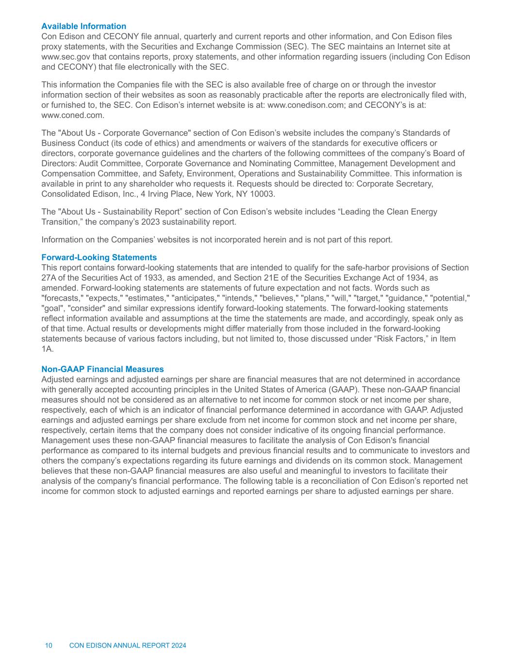 Available Information Con Edison and CECONY file annual, quarterly and current reports and other information, and Con Edison files proxy statements, with the Securities and Exchange Commission (SEC). The SEC maintains an Internet site at www.sec.gov that contains reports, proxy statements, and other information regarding issuers (including Con Edison and CECONY) that file electronically with the SEC. This information the Companies file with the SEC is also available free of charge on or through the investor information section of their websites as soon as reasonably practicable after the reports are electronically filed with, or furnished to, the SEC. Con Edison’s internet website is at: www.conedison.com; and CECONY’s is at: www.coned.com. The "About Us - Corporate Governance" section of Con Edison’s website includes the company’s Standards of Business Conduct (its code of ethics) and amendments or waivers of the standards for executive officers or directors, corporate governance guidelines and the charters of the following committees of the company’s Board of Directors: Audit Committee, Corporate Governance and Nominating Committee, Management Development and Compensation Committee, and Safety, Environment, Operations and Sustainability Committee. This information is available in print to any shareholder who requests it. Requests should be directed to: Corporate Secretary, Consolidated Edison, Inc., 4 Irving Place, New York, NY 10003. The "About Us - Sustainability Report” section of Con Edison’s website includes “Leading the Clean Energy Transition,” the company’s 2023 sustainability report. Information on the Companies’ websites is not incorporated herein and is not part of this report. Forward-Looking Statements This report contains forward-looking statements that are intended to qualify for the safe-harbor provisions of Section 27A of the Securities Act of 1933, as amended, and Section 21E of the Securities Exchange Act of 1934, as amended. Forward-looking statements are statements of future expectation and not facts. Words such as "forecasts," "expects," "estimates," "anticipates," "intends," "believes," "plans," "will," "target," "guidance," "potential," "goal", "consider" and similar expressions identify forward-looking statements. The forward-looking statements reflect information available and assumptions at the time the statements are made, and accordingly, speak only as of that time. Actual results or developments might differ materially from those included in the forward-looking statements because of various factors including, but not limited to, those discussed under “Risk Factors,” in Item 1A. Non-GAAP Financial Measures Adjusted earnings and adjusted earnings per share are financial measures that are not determined in accordance with generally accepted accounting principles in the United States of America (GAAP). These non-GAAP financial measures should not be considered as an alternative to net income for common stock or net income per share, respectively, each of which is an indicator of financial performance determined in accordance with GAAP. Adjusted earnings and adjusted earnings per share exclude from net income for common stock and net income per share, respectively, certain items that the company does not consider indicative of its ongoing financial performance. Management uses these non-GAAP financial measures to facilitate the analysis of Con Edison's financial performance as compared to its internal budgets and previous financial results and to communicate to investors and others the company’s expectations regarding its future earnings and dividends on its common stock. Management believes that these non-GAAP financial measures are also useful and meaningful to investors to facilitate their analysis of the company's financial performance. The following table is a reconciliation of Con Edison’s reported net income for common stock to adjusted earnings and reported earnings per share to adjusted earnings per share. 10 CON EDISON ANNUAL REPORT 2024