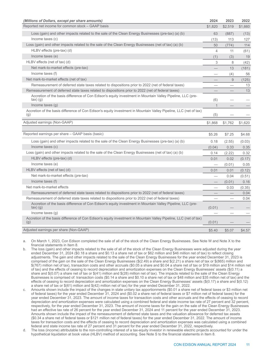 (Millions of Dollars, except per share amounts) 2024 2023 2022 Reported net income for common stock – GAAP basis $1,820 $2,519 $1,660 Loss (gain) and other impacts related to the sale of the Clean Energy Businesses (pre-tax) (a) (b) 63 (887) (13) Income taxes (c) (13) 113 127 Loss (gain) and other impacts related to the sale of the Clean Energy Businesses (net of tax) (a) (b) 50 (774) 114 HLBV effects (pre-tax) (d) 4 11 (61) Income taxes (e) (1) (3) 19 HLBV effects (net of tax) (d) 3 8 (42) Net mark-to-market effects (pre-tax) — 13 (181) Income taxes (f) — (4) 56 Net mark-to-market effects (net of tax) — 9 (125) Remeasurement of deferred state taxes related to dispositions prior to 2022 (net of federal taxes) — — 13 Remeasurement of deferred state taxes related to dispositions prior to 2022 (net of federal taxes) — — 13 Accretion of the basis difference of Con Edison's equity investment in Mountain Valley Pipeline, LLC (pre- tax) (g) (6) — — Income taxes (g) 1 — — Accretion of the basis difference of Con Edison's equity investment in Mountain Valley Pipeline, LLC (net of tax) (g) (5) — — Adjusted earnings (Non-GAAP) $1,868 $1,762 $1,620 Reported earnings per share – GAAP basis (basic) $5.26 $7.25 $4.68 Loss (gain) and other impacts related to the sale of the Clean Energy Businesses (pre-tax) (a) (b) 0.18 (2.55) (0.03) Income taxes (c) (0.04) 0.33 0.35 Loss (gain) and other impacts related to the sale of the Clean Energy Businesses (net of tax) (a) (b) 0.14 (2.22) 0.32 HLBV effects (pre-tax) (d) 0.01 0.02 (0.17) Income taxes (e) — (0.01) 0.05 HLBV effects (net of tax) (d) 0.01 0.01 (0.12) Net mark-to-market effects (pre-tax) — 0.04 (0.51) Income taxes (f) — (0.01) 0.16 Net mark-to-market effects — 0.03 (0.35) Remeasurement of deferred state taxes related to dispositions prior to 2022 (net of federal taxes) — — 0.04 Remeasurement of deferred state taxes related to dispositions prior to 2022 (net of federal taxes) — — 0.04 Accretion of the basis difference of Con Edison's equity investment in Mountain Valley Pipeline, LLC (pre- tax) (g) (0.01) — — Income taxes (g) — — — Accretion of the basis difference of Con Edison's equity investment in Mountain Valley Pipeline, LLC (net of tax) (g) (0.01) — — Adjusted earnings per share (Non-GAAP) $5.40 $5.07 $4.57 a. On March 1, 2023, Con Edison completed the sale of all of the stock of the Clean Energy Businesses. See Note W and Note X to the financial statements in Item 8. b. The loss (gain) and other impacts related to the sale of all of the stock of the Clean Energy Businesses were adjusted during the year ended December 31, 2024 ($0.18 a share and $0.13 a share net of tax or $62 million and $46 million net of tax) to reflect closing adjustments. The gain and other impacts related to the sale of the Clean Energy Businesses for the year ended December 31, 2023 is comprised of the gain on the sale of the Clean Energy Businesses ($(2.49) a share and $(2.21) a share net of tax or $(865) million and $(767) million net of tax), transaction costs and other accruals ($0.05 a share and $0.04 a share net of tax or $19 million and $14 million net of tax) and the effects of ceasing to record depreciation and amortization expenses on the Clean Energy Businesses’ assets ($(0.11) a share and $(0.07) a share net of tax or $(41) million and $(28) million net of tax). The impacts related to the sale of the Clean Energy Businesses is comprised of: transaction costs ($0.14 a share and $0.10 a share net of tax or $48 million and $35 million net of tax) and the effects of ceasing to record depreciation and amortization expenses on the Clean Energy Businesses’ assets ($(0.17) a share and $(0.12) a share net of tax or $(61) million and $(42) million net of tax) for the year ended December 31, 2022. c. Amounts shown include the impact of the changes in state unitary tax apportionments ($0.01 a share net of federal taxes or $3 million net of federal taxes) for the year ended December 31, 2024 and ($0.02 a share net of federal taxes or $7 million net of federal taxes) for the year ended December 31, 2023. The amount of income taxes for transaction costs and other accruals and the effects of ceasing to record depreciation and amortization expenses were calculated using a combined federal and state income tax rate of 27 percent and 32 percent, respectively, for the year ended December 31, 2023. The amount of income taxes for the gain on the sale of the Clean Energy Businesses had an effective tax rate of 26 percent for the year ended December 31, 2024 and 11 percent for the year ended December 31, 2023. Amounts shown include the impact of the remeasurement of deferred state taxes and the valuation allowance for deferred tax assets ($0.34 a share net of federal taxes or $121 million net of federal taxes) for the year ended December 31, 2022. The amount of income taxes for transaction costs and the effects of ceasing to record depreciation and amortization expenses was calculated using a combined federal and state income tax rate of 27 percent and 31 percent for the year ended December 31, 2022, respectively. d. The loss (income) attributable to the non-controlling interest of a tax-equity investor in renewable electric projects accounted for under the hypothetical liquidation at book value (HLBV) method of accounting. See Note S to the financial statements in Item 8. CON EDISON ANNUAL REPORT 2024 11