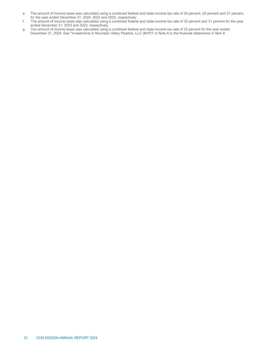 e. The amount of income taxes was calculated using a combined federal and state income tax rate of 24 percent, 25 percent and 31 percent, for the year ended December 31, 2024, 2023 and 2022, respectively. f. The amount of income taxes was calculated using a combined federal and state income tax rate of 32 percent and 31 percent for the year ended December 31, 2023 and 2022, respectively. g. The amount of income taxes was calculated using a combined federal and state income tax rate of 22 percent for the year ended December 31, 2024. See "Investments in Mountain Valley Pipeline, LLC (MVP)" in Note A to the financial statements in Item 8. 12 CON EDISON ANNUAL REPORT 2024