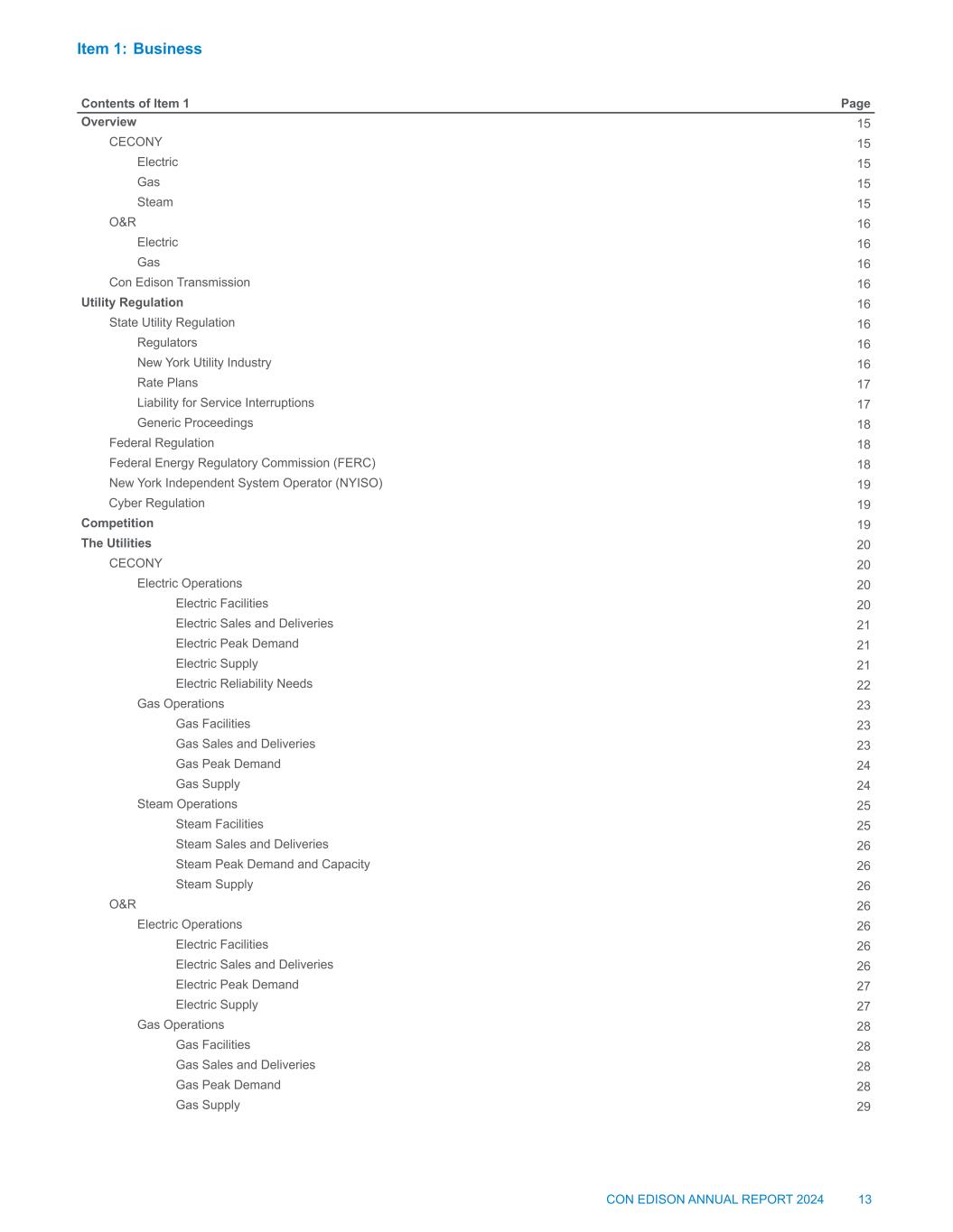 Item 1: Business Contents of Item 1 Page Overview 15 CECONY 15 Electric 15 Gas 15 Steam 15 O&R 16 Electric 16 Gas 16 Con Edison Transmission 16 Utility Regulation 16 State Utility Regulation 16 Regulators 16 New York Utility Industry 16 Rate Plans 17 Liability for Service Interruptions 17 Generic Proceedings 18 Federal Regulation 18 Federal Energy Regulatory Commission (FERC) 18 New York Independent System Operator (NYISO) 19 Cyber Regulation 19 Competition 19 The Utilities 20 CECONY 20 Electric Operations 20 Electric Facilities 20 Electric Sales and Deliveries 21 Electric Peak Demand 21 Electric Supply 21 Electric Reliability Needs 22 Gas Operations 23 Gas Facilities 23 Gas Sales and Deliveries 23 Gas Peak Demand 24 Gas Supply 24 Steam Operations 25 Steam Facilities 25 Steam Sales and Deliveries 26 Steam Peak Demand and Capacity 26 Steam Supply 26 O&R 26 Electric Operations 26 Electric Facilities 26 Electric Sales and Deliveries 26 Electric Peak Demand 27 Electric Supply 27 Gas Operations 28 Gas Facilities 28 Gas Sales and Deliveries 28 Gas Peak Demand 28 Gas Supply 29 CON EDISON ANNUAL REPORT 2024 13