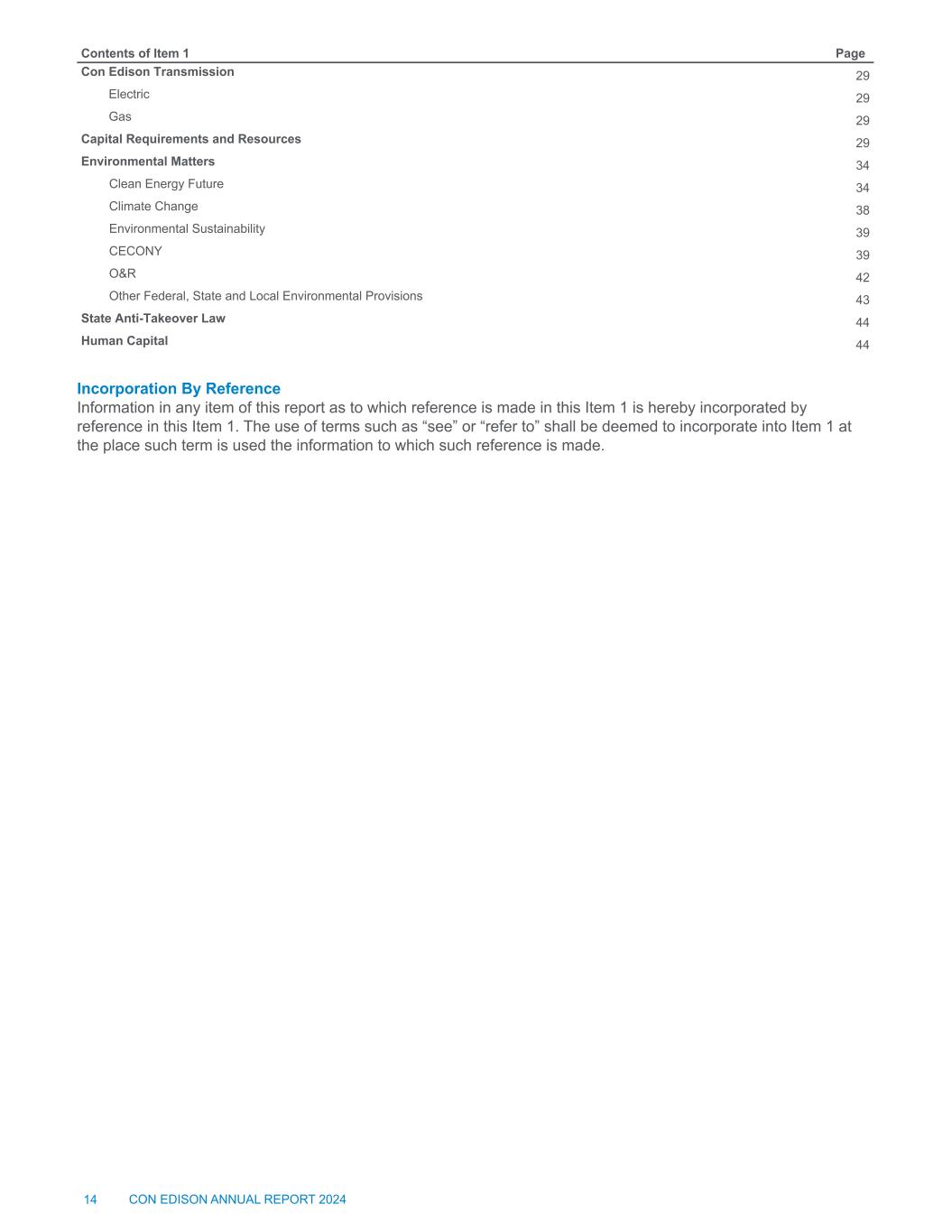 Contents of Item 1 Page Con Edison Transmission 29 Electric 29 Gas 29 Capital Requirements and Resources 29 Environmental Matters 34 Clean Energy Future 34 Climate Change 38 Environmental Sustainability 39 CECONY 39 O&R 42 Other Federal, State and Local Environmental Provisions 43 State Anti-Takeover Law 44 Human Capital 44 Incorporation By Reference Information in any item of this report as to which reference is made in this Item 1 is hereby incorporated by reference in this Item 1. The use of terms such as “see” or “refer to” shall be deemed to incorporate into Item 1 at the place such term is used the information to which such reference is made. 14 CON EDISON ANNUAL REPORT 2024