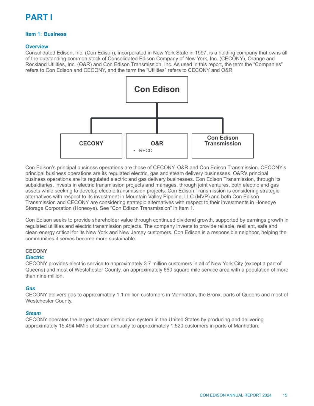 PART I Item 1: Business Overview Consolidated Edison, Inc. (Con Edison), incorporated in New York State in 1997, is a holding company that owns all of the outstanding common stock of Consolidated Edison Company of New York, Inc. (CECONY), Orange and Rockland Utilities, Inc. (O&R) and Con Edison Transmission, Inc. As used in this report, the term the “Companies” refers to Con Edison and CECONY, and the term the “Utilities” refers to CECONY and O&R. Con Edison CECONY O&R Con Edison Transmission • RECO Con Edison’s principal business operations are those of CECONY, O&R and Con Edison Transmission. CECONY’s principal business operations are its regulated electric, gas and steam delivery businesses. O&R’s principal business operations are its regulated electric and gas delivery businesses. Con Edison Transmission, through its subsidiaries, invests in electric transmission projects and manages, through joint ventures, both electric and gas assets while seeking to develop electric transmission projects. Con Edison Transmission is considering strategic alternatives with respect to its investment in Mountain Valley Pipeline, LLC (MVP) and both Con Edison Transmission and CECONY are considering strategic alternatives with respect to their investments in Honeoye Storage Corporation (Honeoye). See “Con Edison Transmission” in Item 1. Con Edison seeks to provide shareholder value through continued dividend growth, supported by earnings growth in regulated utilities and electric transmission projects. The company invests to provide reliable, resilient, safe and clean energy critical for its New York and New Jersey customers. Con Edison is a responsible neighbor, helping the communities it serves become more sustainable. CECONY Electric CECONY provides electric service to approximately 3.7 million customers in all of New York City (except a part of Queens) and most of Westchester County, an approximately 660 square mile service area with a population of more than nine million. Gas CECONY delivers gas to approximately 1.1 million customers in Manhattan, the Bronx, parts of Queens and most of Westchester County. Steam CECONY operates the largest steam distribution system in the United States by producing and delivering approximately 15,494 MMlb of steam annually to approximately 1,520 customers in parts of Manhattan. CON EDISON ANNUAL REPORT 2024 15