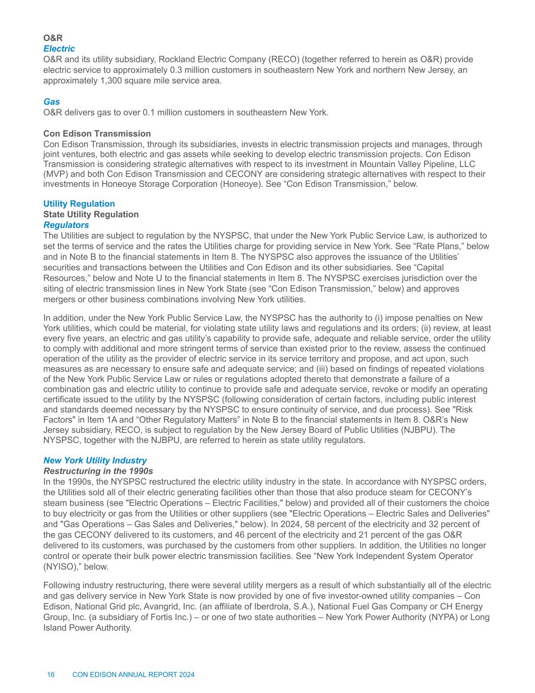 O&R Electric O&R and its utility subsidiary, Rockland Electric Company (RECO) (together referred to herein as O&R) provide electric service to approximately 0.3 million customers in southeastern New York and northern New Jersey, an approximately 1,300 square mile service area. Gas O&R delivers gas to over 0.1 million customers in southeastern New York. Con Edison Transmission Con Edison Transmission, through its subsidiaries, invests in electric transmission projects and manages, through joint ventures, both electric and gas assets while seeking to develop electric transmission projects. Con Edison Transmission is considering strategic alternatives with respect to its investment in Mountain Valley Pipeline, LLC (MVP) and both Con Edison Transmission and CECONY are considering strategic alternatives with respect to their investments in Honeoye Storage Corporation (Honeoye). See “Con Edison Transmission,” below. Utility Regulation State Utility Regulation Regulators The Utilities are subject to regulation by the NYSPSC, that under the New York Public Service Law, is authorized to set the terms of service and the rates the Utilities charge for providing service in New York. See “Rate Plans,” below and in Note B to the financial statements in Item 8. The NYSPSC also approves the issuance of the Utilities’ securities and transactions between the Utilities and Con Edison and its other subsidiaries. See “Capital Resources,” below and Note U to the financial statements in Item 8. The NYSPSC exercises jurisdiction over the siting of electric transmission lines in New York State (see “Con Edison Transmission,” below) and approves mergers or other business combinations involving New York utilities. In addition, under the New York Public Service Law, the NYSPSC has the authority to (i) impose penalties on New York utilities, which could be material, for violating state utility laws and regulations and its orders; (ii) review, at least every five years, an electric and gas utility’s capability to provide safe, adequate and reliable service, order the utility to comply with additional and more stringent terms of service than existed prior to the review, assess the continued operation of the utility as the provider of electric service in its service territory and propose, and act upon, such measures as are necessary to ensure safe and adequate service; and (iii) based on findings of repeated violations of the New York Public Service Law or rules or regulations adopted thereto that demonstrate a failure of a combination gas and electric utility to continue to provide safe and adequate service, revoke or modify an operating certificate issued to the utility by the NYSPSC (following consideration of certain factors, including public interest and standards deemed necessary by the NYSPSC to ensure continuity of service, and due process). See "Risk Factors" in Item 1A and “Other Regulatory Matters” in Note B to the financial statements in Item 8. O&R’s New Jersey subsidiary, RECO, is subject to regulation by the New Jersey Board of Public Utilities (NJBPU). The NYSPSC, together with the NJBPU, are referred to herein as state utility regulators. New York Utility Industry Restructuring in the 1990s In the 1990s, the NYSPSC restructured the electric utility industry in the state. In accordance with NYSPSC orders, the Utilities sold all of their electric generating facilities other than those that also produce steam for CECONY’s steam business (see "Electric Operations – Electric Facilities," below) and provided all of their customers the choice to buy electricity or gas from the Utilities or other suppliers (see "Electric Operations – Electric Sales and Deliveries" and "Gas Operations – Gas Sales and Deliveries," below). In 2024, 58 percent of the electricity and 32 percent of the gas CECONY delivered to its customers, and 46 percent of the electricity and 21 percent of the gas O&R delivered to its customers, was purchased by the customers from other suppliers. In addition, the Utilities no longer control or operate their bulk power electric transmission facilities. See “New York Independent System Operator (NYISO),” below. Following industry restructuring, there were several utility mergers as a result of which substantially all of the electric and gas delivery service in New York State is now provided by one of five investor-owned utility companies – Con Edison, National Grid plc, Avangrid, Inc. (an affiliate of Iberdrola, S.A.), National Fuel Gas Company or CH Energy Group, Inc. (a subsidiary of Fortis Inc.) – or one of two state authorities – New York Power Authority (NYPA) or Long Island Power Authority. 16 CON EDISON ANNUAL REPORT 2024