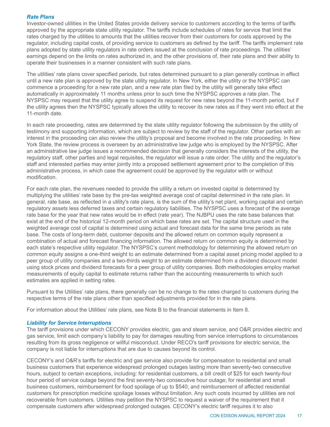 Rate Plans Investor-owned utilities in the United States provide delivery service to customers according to the terms of tariffs approved by the appropriate state utility regulator. The tariffs include schedules of rates for service that limit the rates charged by the utilities to amounts that the utilities recover from their customers for costs approved by the regulator, including capital costs, of providing service to customers as defined by the tariff. The tariffs implement rate plans adopted by state utility regulators in rate orders issued at the conclusion of rate proceedings. The utilities’ earnings depend on the limits on rates authorized in, and the other provisions of, their rate plans and their ability to operate their businesses in a manner consistent with such rate plans. The utilities’ rate plans cover specified periods, but rates determined pursuant to a plan generally continue in effect until a new rate plan is approved by the state utility regulator. In New York, either the utility or the NYSPSC can commence a proceeding for a new rate plan, and a new rate plan filed by the utility will generally take effect automatically in approximately 11 months unless prior to such time the NYSPSC approves a rate plan. The NYSPSC may request that the utility agree to suspend its request for new rates beyond the 11-month period, but if the utility agrees then the NYSPSC typically allows the utility to recover its new rates as if they went into effect at the 11-month date. In each rate proceeding, rates are determined by the state utility regulator following the submission by the utility of testimony and supporting information, which are subject to review by the staff of the regulator. Other parties with an interest in the proceeding can also review the utility’s proposal and become involved in the rate proceeding. In New York State, the review process is overseen by an administrative law judge who is employed by the NYSPSC. After an administrative law judge issues a recommended decision that generally considers the interests of the utility, the regulatory staff, other parties and legal requisites, the regulator will issue a rate order. The utility and the regulator’s staff and interested parties may enter jointly into a proposed settlement agreement prior to the completion of this administrative process, in which case the agreement could be approved by the regulator with or without modification. For each rate plan, the revenues needed to provide the utility a return on invested capital is determined by multiplying the utilities’ rate base by the pre-tax weighted average cost of capital determined in the rate plan. In general, rate base, as reflected in a utility's rate plans, is the sum of the utility’s net plant, working capital and certain regulatory assets less deferred taxes and certain regulatory liabilities. The NYSPSC uses a forecast of the average rate base for the year that new rates would be in effect (rate year). The NJBPU uses the rate base balances that exist at the end of the historical 12-month period on which base rates are set. The capital structure used in the weighted average cost of capital is determined using actual and forecast data for the same time periods as rate base. The costs of long-term debt, customer deposits and the allowed return on common equity represent a combination of actual and forecast financing information. The allowed return on common equity is determined by each state’s respective utility regulator. The NYSPSC’s current methodology for determining the allowed return on common equity assigns a one-third weight to an estimate determined from a capital asset pricing model applied to a peer group of utility companies and a two-thirds weight to an estimate determined from a dividend discount model using stock prices and dividend forecasts for a peer group of utility companies. Both methodologies employ market measurements of equity capital to estimate returns rather than the accounting measurements to which such estimates are applied in setting rates. Pursuant to the Utilities’ rate plans, there generally can be no change to the rates charged to customers during the respective terms of the rate plans other than specified adjustments provided for in the rate plans. For information about the Utilities’ rate plans, see Note B to the financial statements in Item 8. Liability for Service Interruptions The tariff provisions under which CECONY provides electric, gas and steam service, and O&R provides electric and gas service, limit each company’s liability to pay for damages resulting from service interruptions to circumstances resulting from its gross negligence or willful misconduct. Under RECO's tariff provisions for electric service, the company is not liable for interruptions that are due to causes beyond its control. CECONY’s and O&R’s tariffs for electric and gas service also provide for compensation to residential and small business customers that experience widespread prolonged outages lasting more than seventy-two consecutive hours, subject to certain exceptions, including: for residential customers, a bill credit of $25 for each twenty-four hour period of service outage beyond the first seventy-two consecutive hour outage; for residential and small business customers, reimbursement for food spoilage of up to $540; and reimbursement of affected residential customers for prescription medicine spoilage losses without limitation. Any such costs incurred by utilities are not recoverable from customers. Utilities may petition the NYSPSC to request a waiver of the requirement that it compensate customers after widespread prolonged outages. CECONY’s electric tariff requires it to also CON EDISON ANNUAL REPORT 2024 17