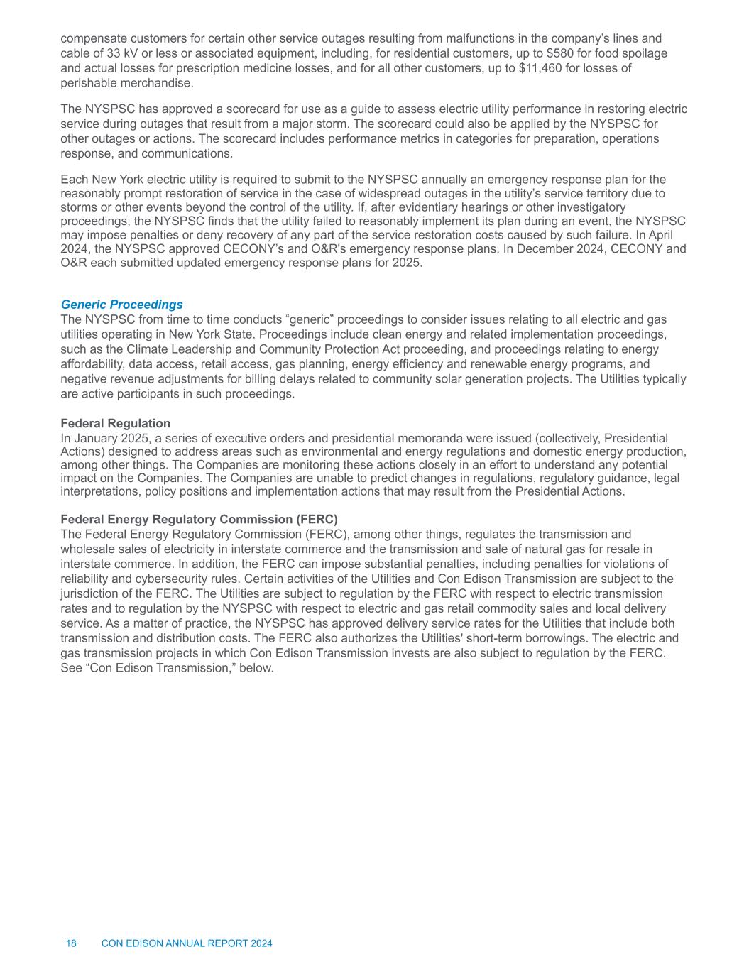 compensate customers for certain other service outages resulting from malfunctions in the company’s lines and cable of 33 kV or less or associated equipment, including, for residential customers, up to $580 for food spoilage and actual losses for prescription medicine losses, and for all other customers, up to $11,460 for losses of perishable merchandise. The NYSPSC has approved a scorecard for use as a guide to assess electric utility performance in restoring electric service during outages that result from a major storm. The scorecard could also be applied by the NYSPSC for other outages or actions. The scorecard includes performance metrics in categories for preparation, operations response, and communications. Each New York electric utility is required to submit to the NYSPSC annually an emergency response plan for the reasonably prompt restoration of service in the case of widespread outages in the utility’s service territory due to storms or other events beyond the control of the utility. If, after evidentiary hearings or other investigatory proceedings, the NYSPSC finds that the utility failed to reasonably implement its plan during an event, the NYSPSC may impose penalties or deny recovery of any part of the service restoration costs caused by such failure. In April 2024, the NYSPSC approved CECONY’s and O&R's emergency response plans. In December 2024, CECONY and O&R each submitted updated emergency response plans for 2025. Generic Proceedings The NYSPSC from time to time conducts “generic” proceedings to consider issues relating to all electric and gas utilities operating in New York State. Proceedings include clean energy and related implementation proceedings, such as the Climate Leadership and Community Protection Act proceeding, and proceedings relating to energy affordability, data access, retail access, gas planning, energy efficiency and renewable energy programs, and negative revenue adjustments for billing delays related to community solar generation projects. The Utilities typically are active participants in such proceedings. Federal Regulation In January 2025, a series of executive orders and presidential memoranda were issued (collectively, Presidential Actions) designed to address areas such as environmental and energy regulations and domestic energy production, among other things. The Companies are monitoring these actions closely in an effort to understand any potential impact on the Companies. The Companies are unable to predict changes in regulations, regulatory guidance, legal interpretations, policy positions and implementation actions that may result from the Presidential Actions. Federal Energy Regulatory Commission (FERC) The Federal Energy Regulatory Commission (FERC), among other things, regulates the transmission and wholesale sales of electricity in interstate commerce and the transmission and sale of natural gas for resale in interstate commerce. In addition, the FERC can impose substantial penalties, including penalties for violations of reliability and cybersecurity rules. Certain activities of the Utilities and Con Edison Transmission are subject to the jurisdiction of the FERC. The Utilities are subject to regulation by the FERC with respect to electric transmission rates and to regulation by the NYSPSC with respect to electric and gas retail commodity sales and local delivery service. As a matter of practice, the NYSPSC has approved delivery service rates for the Utilities that include both transmission and distribution costs. The FERC also authorizes the Utilities' short-term borrowings. The electric and gas transmission projects in which Con Edison Transmission invests are also subject to regulation by the FERC. See “Con Edison Transmission,” below. 18 CON EDISON ANNUAL REPORT 2024