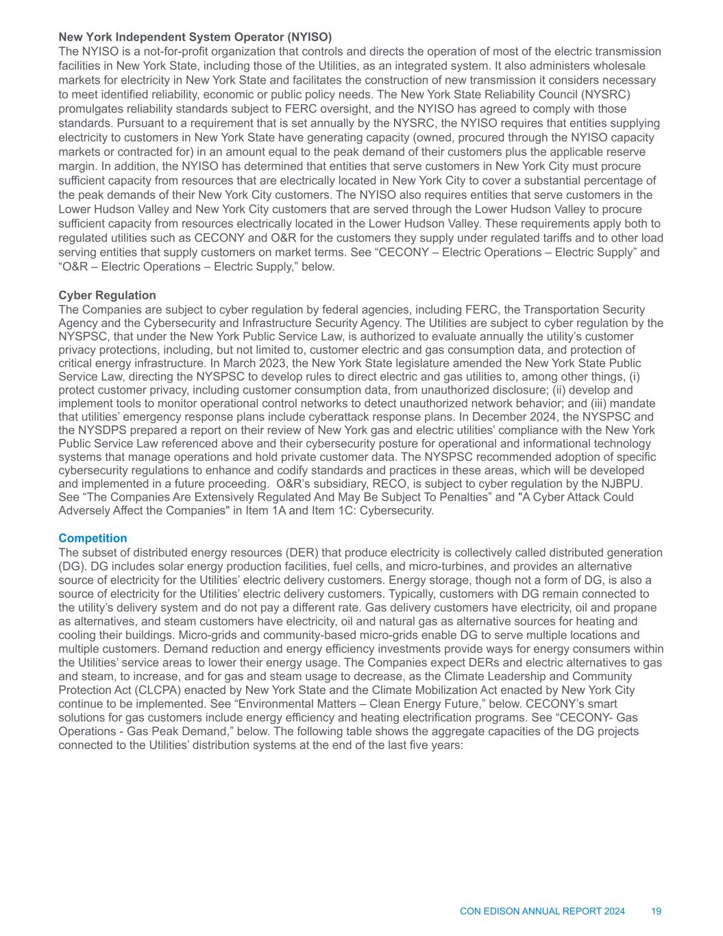 New York Independent System Operator (NYISO) The NYISO is a not-for-profit organization that controls and directs the operation of most of the electric transmission facilities in New York State, including those of the Utilities, as an integrated system. It also administers wholesale markets for electricity in New York State and facilitates the construction of new transmission it considers necessary to meet identified reliability, economic or public policy needs. The New York State Reliability Council (NYSRC) promulgates reliability standards subject to FERC oversight, and the NYISO has agreed to comply with those standards. Pursuant to a requirement that is set annually by the NYSRC, the NYISO requires that entities supplying electricity to customers in New York State have generating capacity (owned, procured through the NYISO capacity markets or contracted for) in an amount equal to the peak demand of their customers plus the applicable reserve margin. In addition, the NYISO has determined that entities that serve customers in New York City must procure sufficient capacity from resources that are electrically located in New York City to cover a substantial percentage of the peak demands of their New York City customers. The NYISO also requires entities that serve customers in the Lower Hudson Valley and New York City customers that are served through the Lower Hudson Valley to procure sufficient capacity from resources electrically located in the Lower Hudson Valley. These requirements apply both to regulated utilities such as CECONY and O&R for the customers they supply under regulated tariffs and to other load serving entities that supply customers on market terms. See “CECONY – Electric Operations – Electric Supply” and “O&R – Electric Operations – Electric Supply,” below. Cyber Regulation The Companies are subject to cyber regulation by federal agencies, including FERC, the Transportation Security Agency and the Cybersecurity and Infrastructure Security Agency. The Utilities are subject to cyber regulation by the NYSPSC, that under the New York Public Service Law, is authorized to evaluate annually the utility’s customer privacy protections, including, but not limited to, customer electric and gas consumption data, and protection of critical energy infrastructure. In March 2023, the New York State legislature amended the New York State Public Service Law, directing the NYSPSC to develop rules to direct electric and gas utilities to, among other things, (i) protect customer privacy, including customer consumption data, from unauthorized disclosure; (ii) develop and implement tools to monitor operational control networks to detect unauthorized network behavior; and (iii) mandate that utilities’ emergency response plans include cyberattack response plans. In December 2024, the NYSPSC and the NYSDPS prepared a report on their review of New York gas and electric utilities’ compliance with the New York Public Service Law referenced above and their cybersecurity posture for operational and informational technology systems that manage operations and hold private customer data. The NYSPSC recommended adoption of specific cybersecurity regulations to enhance and codify standards and practices in these areas, which will be developed and implemented in a future proceeding. O&R’s subsidiary, RECO, is subject to cyber regulation by the NJBPU. See “The Companies Are Extensively Regulated And May Be Subject To Penalties” and "A Cyber Attack Could Adversely Affect the Companies" in Item 1A and Item 1C: Cybersecurity. Competition The subset of distributed energy resources (DER) that produce electricity is collectively called distributed generation (DG). DG includes solar energy production facilities, fuel cells, and micro-turbines, and provides an alternative source of electricity for the Utilities’ electric delivery customers. Energy storage, though not a form of DG, is also a source of electricity for the Utilities’ electric delivery customers. Typically, customers with DG remain connected to the utility’s delivery system and do not pay a different rate. Gas delivery customers have electricity, oil and propane as alternatives, and steam customers have electricity, oil and natural gas as alternative sources for heating and cooling their buildings. Micro-grids and community-based micro-grids enable DG to serve multiple locations and multiple customers. Demand reduction and energy efficiency investments provide ways for energy consumers within the Utilities’ service areas to lower their energy usage. The Companies expect DERs and electric alternatives to gas and steam, to increase, and for gas and steam usage to decrease, as the Climate Leadership and Community Protection Act (CLCPA) enacted by New York State and the Climate Mobilization Act enacted by New York City continue to be implemented. See “Environmental Matters – Clean Energy Future,” below. CECONY’s smart solutions for gas customers include energy efficiency and heating electrification programs. See “CECONY- Gas Operations - Gas Peak Demand,” below. The following table shows the aggregate capacities of the DG projects connected to the Utilities’ distribution systems at the end of the last five years: CON EDISON ANNUAL REPORT 2024 19