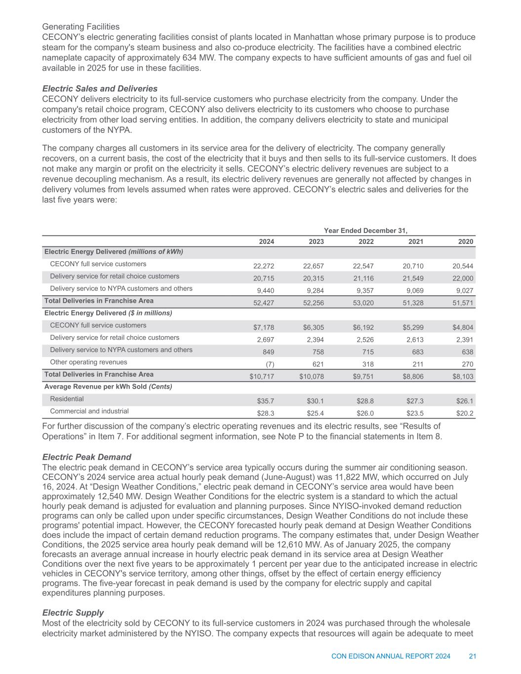 Generating Facilities CECONY’s electric generating facilities consist of plants located in Manhattan whose primary purpose is to produce steam for the company's steam business and also co-produce electricity. The facilities have a combined electric nameplate capacity of approximately 634 MW. The company expects to have sufficient amounts of gas and fuel oil available in 2025 for use in these facilities. Electric Sales and Deliveries CECONY delivers electricity to its full-service customers who purchase electricity from the company. Under the company's retail choice program, CECONY also delivers electricity to its customers who choose to purchase electricity from other load serving entities. In addition, the company delivers electricity to state and municipal customers of the NYPA. The company charges all customers in its service area for the delivery of electricity. The company generally recovers, on a current basis, the cost of the electricity that it buys and then sells to its full-service customers. It does not make any margin or profit on the electricity it sells. CECONY’s electric delivery revenues are subject to a revenue decoupling mechanism. As a result, its electric delivery revenues are generally not affected by changes in delivery volumes from levels assumed when rates were approved. CECONY’s electric sales and deliveries for the last five years were: Year Ended December 31, 2024 2023 2022 2021 2020 Electric Energy Delivered (millions of kWh) CECONY full service customers 22,272 22,657 22,547 20,710 20,544 Delivery service for retail choice customers 20,715 20,315 21,116 21,549 22,000 Delivery service to NYPA customers and others 9,440 9,284 9,357 9,069 9,027 Total Deliveries in Franchise Area 52,427 52,256 53,020 51,328 51,571 Electric Energy Delivered ($ in millions) CECONY full service customers $7,178 $6,305 $6,192 $5,299 $4,804 Delivery service for retail choice customers 2,697 2,394 2,526 2,613 2,391 Delivery service to NYPA customers and others 849 758 715 683 638 Other operating revenues (7) 621 318 211 270 Total Deliveries in Franchise Area $10,717 $10,078 $9,751 $8,806 $8,103 Average Revenue per kWh Sold (Cents) Residential $35.7 $30.1 $28.8 $27.3 $26.1 Commercial and industrial $28.3 $25.4 $26.0 $23.5 $20.2 For further discussion of the company’s electric operating revenues and its electric results, see “Results of Operations” in Item 7. For additional segment information, see Note P to the financial statements in Item 8. Electric Peak Demand The electric peak demand in CECONY’s service area typically occurs during the summer air conditioning season. CECONY’s 2024 service area actual hourly peak demand (June-August) was 11,822 MW, which occurred on July 16, 2024. At “Design Weather Conditions,” electric peak demand in CECONY’s service area would have been approximately 12,540 MW. Design Weather Conditions for the electric system is a standard to which the actual hourly peak demand is adjusted for evaluation and planning purposes. Since NYISO-invoked demand reduction programs can only be called upon under specific circumstances, Design Weather Conditions do not include these programs' potential impact. However, the CECONY forecasted hourly peak demand at Design Weather Conditions does include the impact of certain demand reduction programs. The company estimates that, under Design Weather Conditions, the 2025 service area hourly peak demand will be 12,610 MW. As of January 2025, the company forecasts an average annual increase in hourly electric peak demand in its service area at Design Weather Conditions over the next five years to be approximately 1 percent per year due to the anticipated increase in electric vehicles in CECONY's service territory, among other things, offset by the effect of certain energy efficiency programs. The five-year forecast in peak demand is used by the company for electric supply and capital expenditures planning purposes. Electric Supply Most of the electricity sold by CECONY to its full-service customers in 2024 was purchased through the wholesale electricity market administered by the NYISO. The company expects that resources will again be adequate to meet CON EDISON ANNUAL REPORT 2024 21