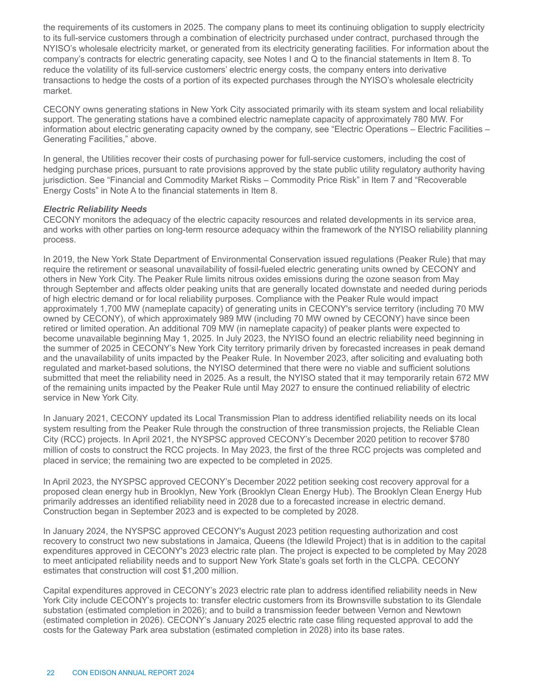 the requirements of its customers in 2025. The company plans to meet its continuing obligation to supply electricity to its full-service customers through a combination of electricity purchased under contract, purchased through the NYISO’s wholesale electricity market, or generated from its electricity generating facilities. For information about the company’s contracts for electric generating capacity, see Notes I and Q to the financial statements in Item 8. To reduce the volatility of its full-service customers’ electric energy costs, the company enters into derivative transactions to hedge the costs of a portion of its expected purchases through the NYISO’s wholesale electricity market. CECONY owns generating stations in New York City associated primarily with its steam system and local reliability support. The generating stations have a combined electric nameplate capacity of approximately 780 MW. For information about electric generating capacity owned by the company, see “Electric Operations – Electric Facilities – Generating Facilities,” above. In general, the Utilities recover their costs of purchasing power for full-service customers, including the cost of hedging purchase prices, pursuant to rate provisions approved by the state public utility regulatory authority having jurisdiction. See “Financial and Commodity Market Risks – Commodity Price Risk” in Item 7 and “Recoverable Energy Costs” in Note A to the financial statements in Item 8. Electric Reliability Needs CECONY monitors the adequacy of the electric capacity resources and related developments in its service area, and works with other parties on long-term resource adequacy within the framework of the NYISO reliability planning process. In 2019, the New York State Department of Environmental Conservation issued regulations (Peaker Rule) that may require the retirement or seasonal unavailability of fossil-fueled electric generating units owned by CECONY and others in New York City. The Peaker Rule limits nitrous oxides emissions during the ozone season from May through September and affects older peaking units that are generally located downstate and needed during periods of high electric demand or for local reliability purposes. Compliance with the Peaker Rule would impact approximately 1,700 MW (nameplate capacity) of generating units in CECONY's service territory (including 70 MW owned by CECONY), of which approximately 989 MW (including 70 MW owned by CECONY) have since been retired or limited operation. An additional 709 MW (in nameplate capacity) of peaker plants were expected to become unavailable beginning May 1, 2025. In July 2023, the NYISO found an electric reliability need beginning in the summer of 2025 in CECONY’s New York City territory primarily driven by forecasted increases in peak demand and the unavailability of units impacted by the Peaker Rule. In November 2023, after soliciting and evaluating both regulated and market-based solutions, the NYISO determined that there were no viable and sufficient solutions submitted that meet the reliability need in 2025. As a result, the NYISO stated that it may temporarily retain 672 MW of the remaining units impacted by the Peaker Rule until May 2027 to ensure the continued reliability of electric service in New York City. In January 2021, CECONY updated its Local Transmission Plan to address identified reliability needs on its local system resulting from the Peaker Rule through the construction of three transmission projects, the Reliable Clean City (RCC) projects. In April 2021, the NYSPSC approved CECONY’s December 2020 petition to recover $780 million of costs to construct the RCC projects. In May 2023, the first of the three RCC projects was completed and placed in service; the remaining two are expected to be completed in 2025. In April 2023, the NYSPSC approved CECONY’s December 2022 petition seeking cost recovery approval for a proposed clean energy hub in Brooklyn, New York (Brooklyn Clean Energy Hub). The Brooklyn Clean Energy Hub primarily addresses an identified reliability need in 2028 due to a forecasted increase in electric demand. Construction began in September 2023 and is expected to be completed by 2028. In January 2024, the NYSPSC approved CECONY's August 2023 petition requesting authorization and cost recovery to construct two new substations in Jamaica, Queens (the Idlewild Project) that is in addition to the capital expenditures approved in CECONY's 2023 electric rate plan. The project is expected to be completed by May 2028 to meet anticipated reliability needs and to support New York State’s goals set forth in the CLCPA. CECONY estimates that construction will cost $1,200 million. Capital expenditures approved in CECONY’s 2023 electric rate plan to address identified reliability needs in New York City include CECONY’s projects to: transfer electric customers from its Brownsville substation to its Glendale substation (estimated completion in 2026); and to build a transmission feeder between Vernon and Newtown (estimated completion in 2026). CECONY’s January 2025 electric rate case filing requested approval to add the costs for the Gateway Park area substation (estimated completion in 2028) into its base rates. 22 CON EDISON ANNUAL REPORT 2024