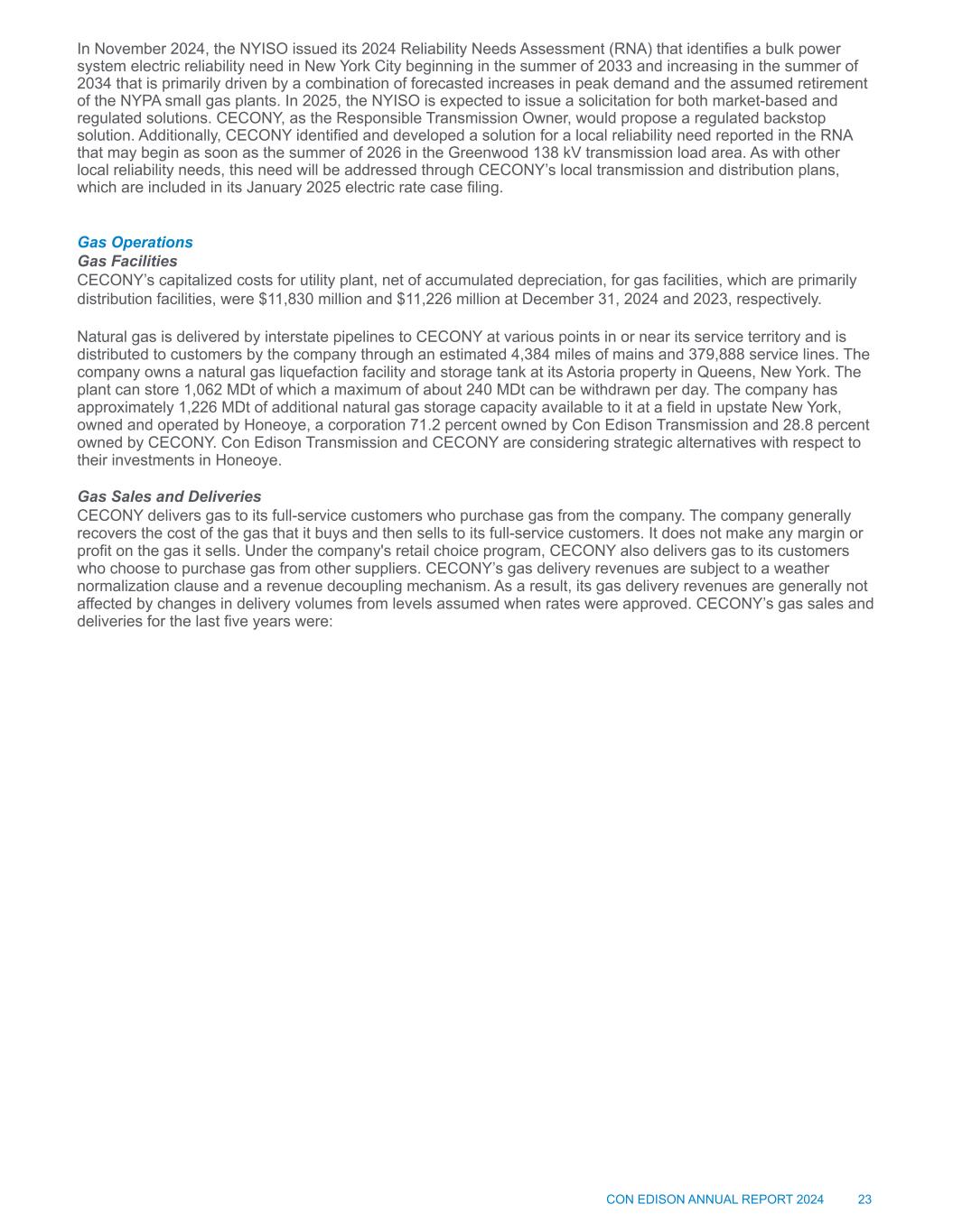 In November 2024, the NYISO issued its 2024 Reliability Needs Assessment (RNA) that identifies a bulk power system electric reliability need in New York City beginning in the summer of 2033 and increasing in the summer of 2034 that is primarily driven by a combination of forecasted increases in peak demand and the assumed retirement of the NYPA small gas plants. In 2025, the NYISO is expected to issue a solicitation for both market-based and regulated solutions. CECONY, as the Responsible Transmission Owner, would propose a regulated backstop solution. Additionally, CECONY identified and developed a solution for a local reliability need reported in the RNA that may begin as soon as the summer of 2026 in the Greenwood 138 kV transmission load area. As with other local reliability needs, this need will be addressed through CECONY’s local transmission and distribution plans, which are included in its January 2025 electric rate case filing. Gas Operations Gas Facilities CECONY’s capitalized costs for utility plant, net of accumulated depreciation, for gas facilities, which are primarily distribution facilities, were $11,830 million and $11,226 million at December 31, 2024 and 2023, respectively. Natural gas is delivered by interstate pipelines to CECONY at various points in or near its service territory and is distributed to customers by the company through an estimated 4,384 miles of mains and 379,888 service lines. The company owns a natural gas liquefaction facility and storage tank at its Astoria property in Queens, New York. The plant can store 1,062 MDt of which a maximum of about 240 MDt can be withdrawn per day. The company has approximately 1,226 MDt of additional natural gas storage capacity available to it at a field in upstate New York, owned and operated by Honeoye, a corporation 71.2 percent owned by Con Edison Transmission and 28.8 percent owned by CECONY. Con Edison Transmission and CECONY are considering strategic alternatives with respect to their investments in Honeoye. Gas Sales and Deliveries CECONY delivers gas to its full-service customers who purchase gas from the company. The company generally recovers the cost of the gas that it buys and then sells to its full-service customers. It does not make any margin or profit on the gas it sells. Under the company's retail choice program, CECONY also delivers gas to its customers who choose to purchase gas from other suppliers. CECONY’s gas delivery revenues are subject to a weather normalization clause and a revenue decoupling mechanism. As a result, its gas delivery revenues are generally not affected by changes in delivery volumes from levels assumed when rates were approved. CECONY’s gas sales and deliveries for the last five years were: CON EDISON ANNUAL REPORT 2024 23
