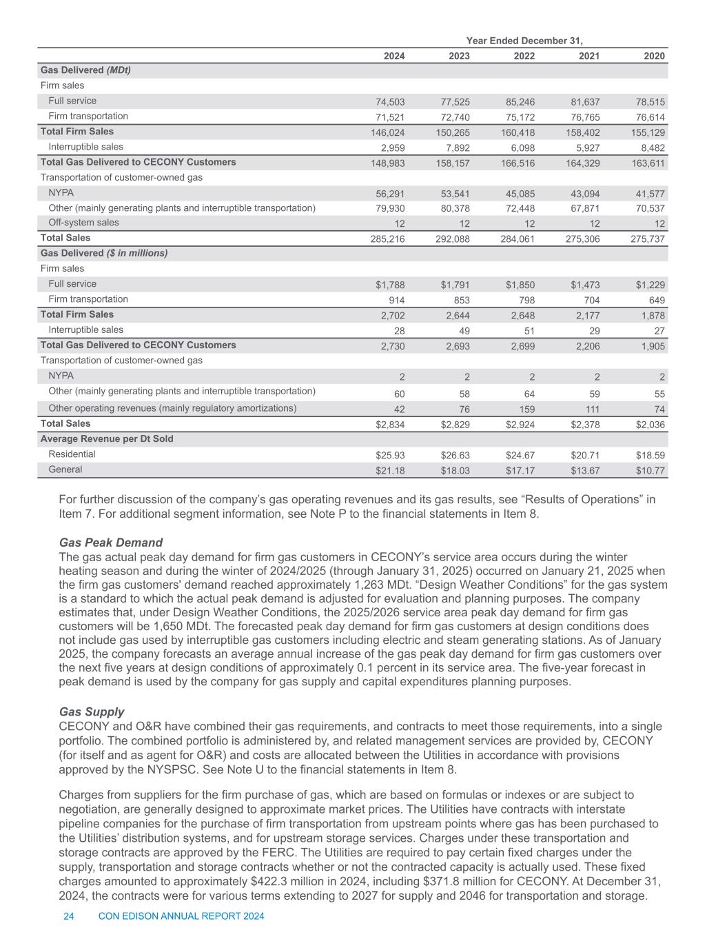 Year Ended December 31, 2024 2023 2022 2021 2020 Gas Delivered (MDt) Firm sales Full service 74,503 77,525 85,246 81,637 78,515 Firm transportation 71,521 72,740 75,172 76,765 76,614 Total Firm Sales 146,024 150,265 160,418 158,402 155,129 Interruptible sales 2,959 7,892 6,098 5,927 8,482 Total Gas Delivered to CECONY Customers 148,983 158,157 166,516 164,329 163,611 Transportation of customer-owned gas NYPA 56,291 53,541 45,085 43,094 41,577 Other (mainly generating plants and interruptible transportation) 79,930 80,378 72,448 67,871 70,537 Off-system sales 12 12 12 12 12 Total Sales 285,216 292,088 284,061 275,306 275,737 Gas Delivered ($ in millions) Firm sales Full service $1,788 $1,791 $1,850 $1,473 $1,229 Firm transportation 914 853 798 704 649 Total Firm Sales 2,702 2,644 2,648 2,177 1,878 Interruptible sales 28 49 51 29 27 Total Gas Delivered to CECONY Customers 2,730 2,693 2,699 2,206 1,905 Transportation of customer-owned gas NYPA 2 2 2 2 2 Other (mainly generating plants and interruptible transportation) 60 58 64 59 55 Other operating revenues (mainly regulatory amortizations) 42 76 159 111 74 Total Sales $2,834 $2,829 $2,924 $2,378 $2,036 Average Revenue per Dt Sold Residential $25.93 $26.63 $24.67 $20.71 $18.59 General $21.18 $18.03 $17.17 $13.67 $10.77 For further discussion of the company’s gas operating revenues and its gas results, see “Results of Operations” in Item 7. For additional segment information, see Note P to the financial statements in Item 8. Gas Peak Demand The gas actual peak day demand for firm gas customers in CECONY’s service area occurs during the winter heating season and during the winter of 2024/2025 (through January 31, 2025) occurred on January 21, 2025 when the firm gas customers' demand reached approximately 1,263 MDt. “Design Weather Conditions” for the gas system is a standard to which the actual peak demand is adjusted for evaluation and planning purposes. The company estimates that, under Design Weather Conditions, the 2025/2026 service area peak day demand for firm gas customers will be 1,650 MDt. The forecasted peak day demand for firm gas customers at design conditions does not include gas used by interruptible gas customers including electric and steam generating stations. As of January 2025, the company forecasts an average annual increase of the gas peak day demand for firm gas customers over the next five years at design conditions of approximately 0.1 percent in its service area. The five-year forecast in peak demand is used by the company for gas supply and capital expenditures planning purposes. Gas Supply CECONY and O&R have combined their gas requirements, and contracts to meet those requirements, into a single portfolio. The combined portfolio is administered by, and related management services are provided by, CECONY (for itself and as agent for O&R) and costs are allocated between the Utilities in accordance with provisions approved by the NYSPSC. See Note U to the financial statements in Item 8. Charges from suppliers for the firm purchase of gas, which are based on formulas or indexes or are subject to negotiation, are generally designed to approximate market prices. The Utilities have contracts with interstate pipeline companies for the purchase of firm transportation from upstream points where gas has been purchased to the Utilities’ distribution systems, and for upstream storage services. Charges under these transportation and storage contracts are approved by the FERC. The Utilities are required to pay certain fixed charges under the supply, transportation and storage contracts whether or not the contracted capacity is actually used. These fixed charges amounted to approximately $422.3 million in 2024, including $371.8 million for CECONY. At December 31, 2024, the contracts were for various terms extending to 2027 for supply and 2046 for transportation and storage. 24 CON EDISON ANNUAL REPORT 2024