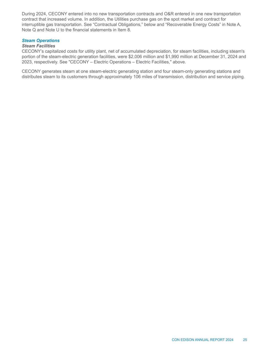 During 2024, CECONY entered into no new transportation contracts and O&R entered in one new transportation contract that increased volume. In addition, the Utilities purchase gas on the spot market and contract for interruptible gas transportation. See “Contractual Obligations,” below and “Recoverable Energy Costs” in Note A, Note Q and Note U to the financial statements in Item 8. Steam Operations Steam Facilities CECONY’s capitalized costs for utility plant, net of accumulated depreciation, for steam facilities, including steam's portion of the steam-electric generation facilities, were $2,006 million and $1,990 million at December 31, 2024 and 2023, respectively. See "CECONY – Electric Operations – Electric Facilities," above. CECONY generates steam at one steam-electric generating station and four steam-only generating stations and distributes steam to its customers through approximately 106 miles of transmission, distribution and service piping. CON EDISON ANNUAL REPORT 2024 25