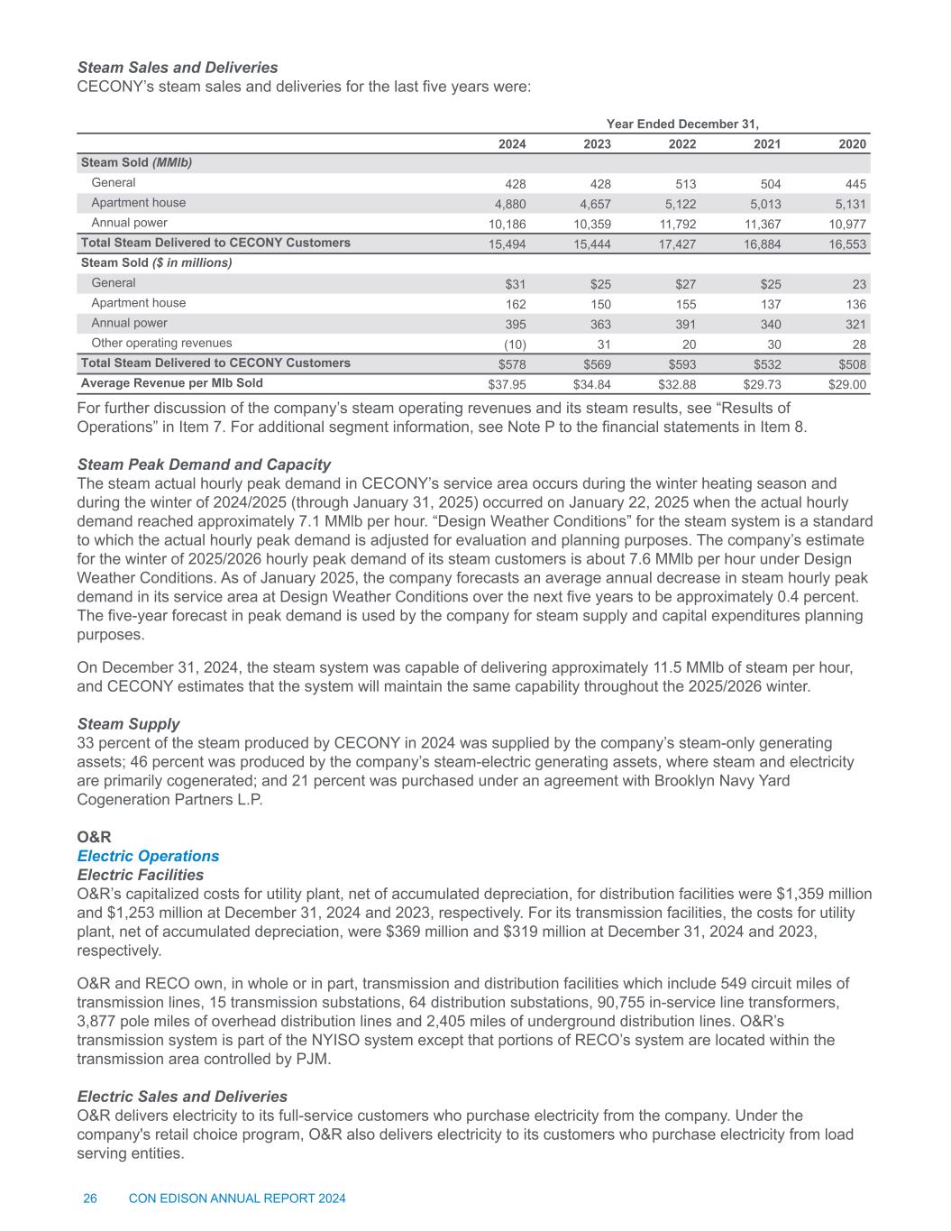 Steam Sales and Deliveries CECONY’s steam sales and deliveries for the last five years were: Year Ended December 31, 2024 2023 2022 2021 2020 Steam Sold (MMlb) General 428 428 513 504 445 Apartment house 4,880 4,657 5,122 5,013 5,131 Annual power 10,186 10,359 11,792 11,367 10,977 Total Steam Delivered to CECONY Customers 15,494 15,444 17,427 16,884 16,553 Steam Sold ($ in millions) General $31 $25 $27 $25 23 Apartment house 162 150 155 137 136 Annual power 395 363 391 340 321 Other operating revenues (10) 31 20 30 28 Total Steam Delivered to CECONY Customers $578 $569 $593 $532 $508 Average Revenue per Mlb Sold $37.95 $34.84 $32.88 $29.73 $29.00 For further discussion of the company’s steam operating revenues and its steam results, see “Results of Operations” in Item 7. For additional segment information, see Note P to the financial statements in Item 8. Steam Peak Demand and Capacity The steam actual hourly peak demand in CECONY’s service area occurs during the winter heating season and during the winter of 2024/2025 (through January 31, 2025) occurred on January 22, 2025 when the actual hourly demand reached approximately 7.1 MMlb per hour. “Design Weather Conditions” for the steam system is a standard to which the actual hourly peak demand is adjusted for evaluation and planning purposes. The company’s estimate for the winter of 2025/2026 hourly peak demand of its steam customers is about 7.6 MMlb per hour under Design Weather Conditions. As of January 2025, the company forecasts an average annual decrease in steam hourly peak demand in its service area at Design Weather Conditions over the next five years to be approximately 0.4 percent. The five-year forecast in peak demand is used by the company for steam supply and capital expenditures planning purposes. On December 31, 2024, the steam system was capable of delivering approximately 11.5 MMlb of steam per hour, and CECONY estimates that the system will maintain the same capability throughout the 2025/2026 winter. Steam Supply 33 percent of the steam produced by CECONY in 2024 was supplied by the company’s steam-only generating assets; 46 percent was produced by the company’s steam-electric generating assets, where steam and electricity are primarily cogenerated; and 21 percent was purchased under an agreement with Brooklyn Navy Yard Cogeneration Partners L.P. O&R Electric Operations Electric Facilities O&R’s capitalized costs for utility plant, net of accumulated depreciation, for distribution facilities were $1,359 million and $1,253 million at December 31, 2024 and 2023, respectively. For its transmission facilities, the costs for utility plant, net of accumulated depreciation, were $369 million and $319 million at December 31, 2024 and 2023, respectively. O&R and RECO own, in whole or in part, transmission and distribution facilities which include 549 circuit miles of transmission lines, 15 transmission substations, 64 distribution substations, 90,755 in-service line transformers, 3,877 pole miles of overhead distribution lines and 2,405 miles of underground distribution lines. O&R’s transmission system is part of the NYISO system except that portions of RECO’s system are located within the transmission area controlled by PJM. Electric Sales and Deliveries O&R delivers electricity to its full-service customers who purchase electricity from the company. Under the company's retail choice program, O&R also delivers electricity to its customers who purchase electricity from load serving entities. 26 CON EDISON ANNUAL REPORT 2024