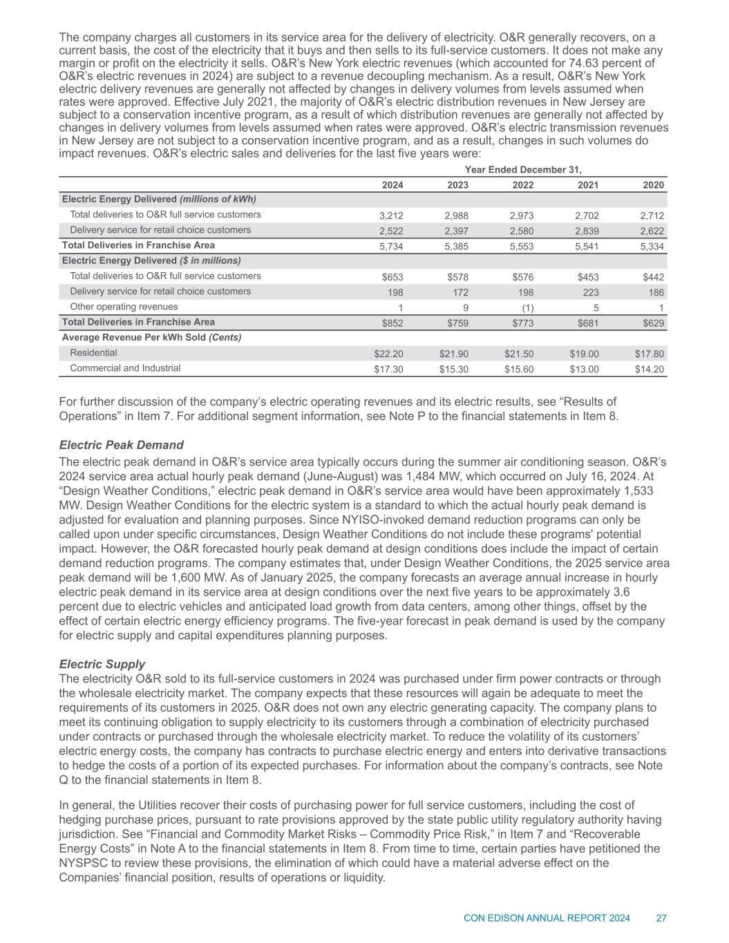The company charges all customers in its service area for the delivery of electricity. O&R generally recovers, on a current basis, the cost of the electricity that it buys and then sells to its full-service customers. It does not make any margin or profit on the electricity it sells. O&R’s New York electric revenues (which accounted for 74.63 percent of O&R’s electric revenues in 2024) are subject to a revenue decoupling mechanism. As a result, O&R’s New York electric delivery revenues are generally not affected by changes in delivery volumes from levels assumed when rates were approved. Effective July 2021, the majority of O&R’s electric distribution revenues in New Jersey are subject to a conservation incentive program, as a result of which distribution revenues are generally not affected by changes in delivery volumes from levels assumed when rates were approved. O&R’s electric transmission revenues in New Jersey are not subject to a conservation incentive program, and as a result, changes in such volumes do impact revenues. O&R’s electric sales and deliveries for the last five years were: Year Ended December 31, 2024 2023 2022 2021 2020 Electric Energy Delivered (millions of kWh) Total deliveries to O&R full service customers 3,212 2,988 2,973 2,702 2,712 Delivery service for retail choice customers 2,522 2,397 2,580 2,839 2,622 Total Deliveries in Franchise Area 5,734 5,385 5,553 5,541 5,334 Electric Energy Delivered ($ in millions) Total deliveries to O&R full service customers $653 $578 $576 $453 $442 Delivery service for retail choice customers 198 172 198 223 186 Other operating revenues 1 9 (1) 5 1 Total Deliveries in Franchise Area $852 $759 $773 $681 $629 Average Revenue Per kWh Sold (Cents) Residential $22.20 $21.90 $21.50 $19.00 $17.80 Commercial and Industrial $17.30 $15.30 $15.60 $13.00 $14.20 For further discussion of the company’s electric operating revenues and its electric results, see “Results of Operations” in Item 7. For additional segment information, see Note P to the financial statements in Item 8. Electric Peak Demand The electric peak demand in O&R’s service area typically occurs during the summer air conditioning season. O&R’s 2024 service area actual hourly peak demand (June-August) was 1,484 MW, which occurred on July 16, 2024. At “Design Weather Conditions,” electric peak demand in O&R’s service area would have been approximately 1,533 MW. Design Weather Conditions for the electric system is a standard to which the actual hourly peak demand is adjusted for evaluation and planning purposes. Since NYISO-invoked demand reduction programs can only be called upon under specific circumstances, Design Weather Conditions do not include these programs' potential impact. However, the O&R forecasted hourly peak demand at design conditions does include the impact of certain demand reduction programs. The company estimates that, under Design Weather Conditions, the 2025 service area peak demand will be 1,600 MW. As of January 2025, the company forecasts an average annual increase in hourly electric peak demand in its service area at design conditions over the next five years to be approximately 3.6 percent due to electric vehicles and anticipated load growth from data centers, among other things, offset by the effect of certain electric energy efficiency programs. The five-year forecast in peak demand is used by the company for electric supply and capital expenditures planning purposes. Electric Supply The electricity O&R sold to its full-service customers in 2024 was purchased under firm power contracts or through the wholesale electricity market. The company expects that these resources will again be adequate to meet the requirements of its customers in 2025. O&R does not own any electric generating capacity. The company plans to meet its continuing obligation to supply electricity to its customers through a combination of electricity purchased under contracts or purchased through the wholesale electricity market. To reduce the volatility of its customers’ electric energy costs, the company has contracts to purchase electric energy and enters into derivative transactions to hedge the costs of a portion of its expected purchases. For information about the company’s contracts, see Note Q to the financial statements in Item 8. In general, the Utilities recover their costs of purchasing power for full service customers, including the cost of hedging purchase prices, pursuant to rate provisions approved by the state public utility regulatory authority having jurisdiction. See “Financial and Commodity Market Risks – Commodity Price Risk,” in Item 7 and “Recoverable Energy Costs” in Note A to the financial statements in Item 8. From time to time, certain parties have petitioned the NYSPSC to review these provisions, the elimination of which could have a material adverse effect on the Companies’ financial position, results of operations or liquidity. CON EDISON ANNUAL REPORT 2024 27