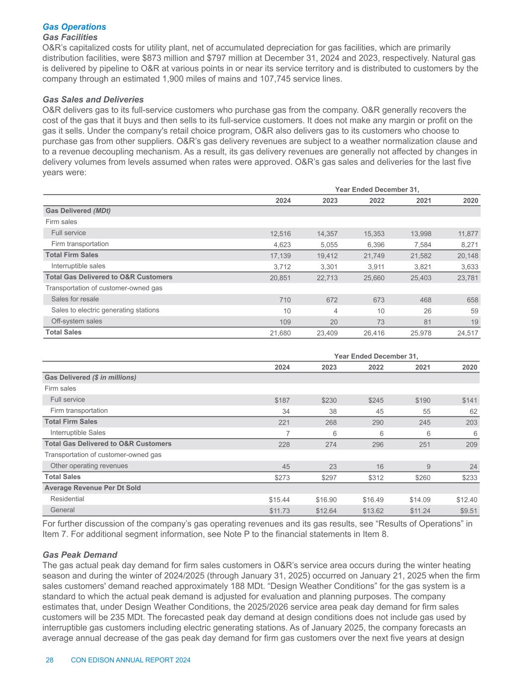 Gas Operations Gas Facilities O&R’s capitalized costs for utility plant, net of accumulated depreciation for gas facilities, which are primarily distribution facilities, were $873 million and $797 million at December 31, 2024 and 2023, respectively. Natural gas is delivered by pipeline to O&R at various points in or near its service territory and is distributed to customers by the company through an estimated 1,900 miles of mains and 107,745 service lines. Gas Sales and Deliveries O&R delivers gas to its full-service customers who purchase gas from the company. O&R generally recovers the cost of the gas that it buys and then sells to its full-service customers. It does not make any margin or profit on the gas it sells. Under the company's retail choice program, O&R also delivers gas to its customers who choose to purchase gas from other suppliers. O&R’s gas delivery revenues are subject to a weather normalization clause and to a revenue decoupling mechanism. As a result, its gas delivery revenues are generally not affected by changes in delivery volumes from levels assumed when rates were approved. O&R’s gas sales and deliveries for the last five years were: Year Ended December 31, 2024 2023 2022 2021 2020 Gas Delivered (MDt) Firm sales Full service 12,516 14,357 15,353 13,998 11,877 Firm transportation 4,623 5,055 6,396 7,584 8,271 Total Firm Sales 17,139 19,412 21,749 21,582 20,148 Interruptible sales 3,712 3,301 3,911 3,821 3,633 Total Gas Delivered to O&R Customers 20,851 22,713 25,660 25,403 23,781 Transportation of customer-owned gas Sales for resale 710 672 673 468 658 Sales to electric generating stations 10 4 10 26 59 Off-system sales 109 20 73 81 19 Total Sales 21,680 23,409 26,416 25,978 24,517 Year Ended December 31, 2024 2023 2022 2021 2020 Gas Delivered ($ in millions) Firm sales Full service $187 $230 $245 $190 $141 Firm transportation 34 38 45 55 62 Total Firm Sales 221 268 290 245 203 Interruptible Sales 7 6 6 6 6 Total Gas Delivered to O&R Customers 228 274 296 251 209 Transportation of customer-owned gas Other operating revenues 45 23 16 9 24 Total Sales $273 $297 $312 $260 $233 Average Revenue Per Dt Sold Residential $15.44 $16.90 $16.49 $14.09 $12.40 General $11.73 $12.64 $13.62 $11.24 $9.51 For further discussion of the company’s gas operating revenues and its gas results, see “Results of Operations” in Item 7. For additional segment information, see Note P to the financial statements in Item 8. Gas Peak Demand The gas actual peak day demand for firm sales customers in O&R’s service area occurs during the winter heating season and during the winter of 2024/2025 (through January 31, 2025) occurred on January 21, 2025 when the firm sales customers' demand reached approximately 188 MDt. “Design Weather Conditions” for the gas system is a standard to which the actual peak demand is adjusted for evaluation and planning purposes. The company estimates that, under Design Weather Conditions, the 2025/2026 service area peak day demand for firm sales customers will be 235 MDt. The forecasted peak day demand at design conditions does not include gas used by interruptible gas customers including electric generating stations. As of January 2025, the company forecasts an average annual decrease of the gas peak day demand for firm gas customers over the next five years at design 28 CON EDISON ANNUAL REPORT 2024