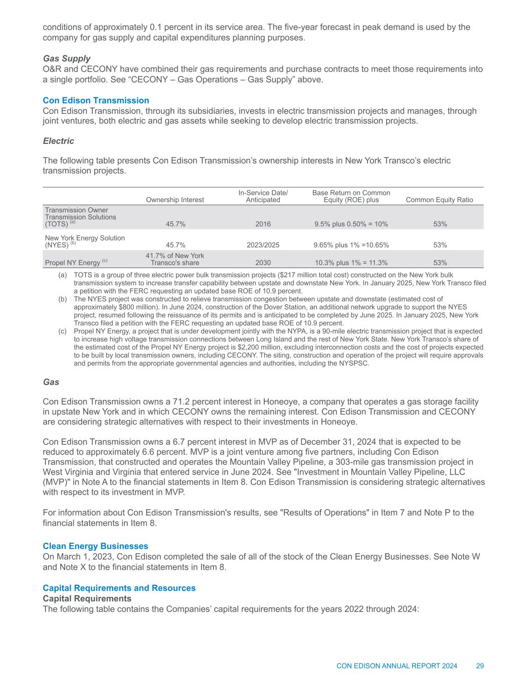 conditions of approximately 0.1 percent in its service area. The five-year forecast in peak demand is used by the company for gas supply and capital expenditures planning purposes. Gas Supply O&R and CECONY have combined their gas requirements and purchase contracts to meet those requirements into a single portfolio. See “CECONY – Gas Operations – Gas Supply” above. Con Edison Transmission Con Edison Transmission, through its subsidiaries, invests in electric transmission projects and manages, through joint ventures, both electric and gas assets while seeking to develop electric transmission projects. Electric The following table presents Con Edison Transmission’s ownership interests in New York Transco’s electric transmission projects. Ownership Interest In-Service Date/ Anticipated Base Return on Common Equity (ROE) plus Common Equity Ratio Transmission Owner Transmission Solutions (TOTS) (a) 45.7% 2016 9.5% plus 0.50% = 10% 53% New York Energy Solution (NYES) (b) 45.7% 2023/2025 9.65% plus 1% =10.65% 53% Propel NY Energy (c) 41.7% of New York Transco's share 2030 10.3% plus 1% = 11.3% 53% (a) TOTS is a group of three electric power bulk transmission projects ($217 million total cost) constructed on the New York bulk transmission system to increase transfer capability between upstate and downstate New York. In January 2025, New York Transco filed a petition with the FERC requesting an updated base ROE of 10.9 percent. (b) The NYES project was constructed to relieve transmission congestion between upstate and downstate (estimated cost of approximately $800 million). In June 2024, construction of the Dover Station, an additional network upgrade to support the NYES project, resumed following the reissuance of its permits and is anticipated to be completed by June 2025. In January 2025, New York Transco filed a petition with the FERC requesting an updated base ROE of 10.9 percent. (c) Propel NY Energy, a project that is under development jointly with the NYPA, is a 90-mile electric transmission project that is expected to increase high voltage transmission connections between Long Island and the rest of New York State. New York Transco’s share of the estimated cost of the Propel NY Energy project is $2,200 million, excluding interconnection costs and the cost of projects expected to be built by local transmission owners, including CECONY. The siting, construction and operation of the project will require approvals and permits from the appropriate governmental agencies and authorities, including the NYSPSC. Gas Con Edison Transmission owns a 71.2 percent interest in Honeoye, a company that operates a gas storage facility in upstate New York and in which CECONY owns the remaining interest. Con Edison Transmission and CECONY are considering strategic alternatives with respect to their investments in Honeoye. Con Edison Transmission owns a 6.7 percent interest in MVP as of December 31, 2024 that is expected to be reduced to approximately 6.6 percent. MVP is a joint venture among five partners, including Con Edison Transmission, that constructed and operates the Mountain Valley Pipeline, a 303-mile gas transmission project in West Virginia and Virginia that entered service in June 2024. See "Investment in Mountain Valley Pipeline, LLC (MVP)" in Note A to the financial statements in Item 8. Con Edison Transmission is considering strategic alternatives with respect to its investment in MVP. For information about Con Edison Transmission's results, see "Results of Operations" in Item 7 and Note P to the financial statements in Item 8. Clean Energy Businesses On March 1, 2023, Con Edison completed the sale of all of the stock of the Clean Energy Businesses. See Note W and Note X to the financial statements in Item 8. Capital Requirements and Resources Capital Requirements The following table contains the Companies’ capital requirements for the years 2022 through 2024: CON EDISON ANNUAL REPORT 2024 29