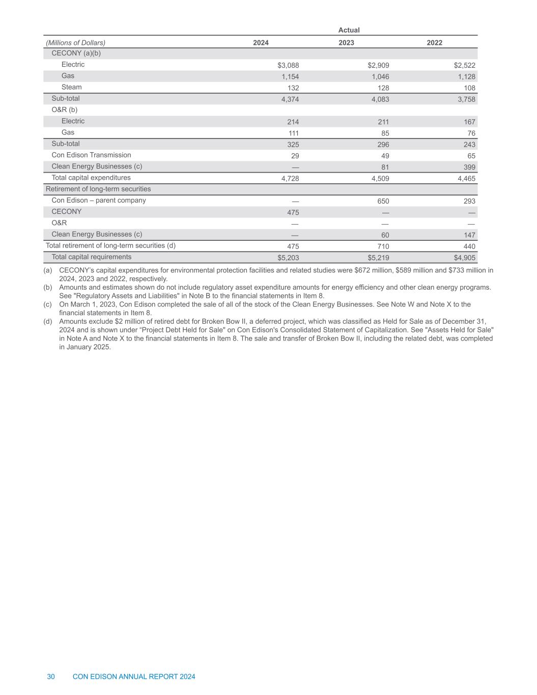 Actual (Millions of Dollars) 2024 2023 2022 CECONY (a)(b) Electric $3,088 $2,909 $2,522 Gas 1,154 1,046 1,128 Steam 132 128 108 Sub-total 4,374 4,083 3,758 O&R (b) Electric 214 211 167 Gas 111 85 76 Sub-total 325 296 243 Con Edison Transmission 29 49 65 Clean Energy Businesses (c) — 81 399 Total capital expenditures 4,728 4,509 4,465 Retirement of long-term securities Con Edison – parent company — 650 293 CECONY 475 — — O&R — — — Clean Energy Businesses (c) — 60 147 Total retirement of long-term securities (d) 475 710 440 Total capital requirements $5,203 $5,219 $4,905 (a) CECONY’s capital expenditures for environmental protection facilities and related studies were $672 million, $589 million and $733 million in 2024, 2023 and 2022, respectively. (b) Amounts and estimates shown do not include regulatory asset expenditure amounts for energy efficiency and other clean energy programs. See "Regulatory Assets and Liabilities" in Note B to the financial statements in Item 8. (c) On March 1, 2023, Con Edison completed the sale of all of the stock of the Clean Energy Businesses. See Note W and Note X to the financial statements in Item 8. (d) Amounts exclude $2 million of retired debt for Broken Bow II, a deferred project, which was classified as Held for Sale as of December 31, 2024 and is shown under “Project Debt Held for Sale" on Con Edison's Consolidated Statement of Capitalization. See "Assets Held for Sale" in Note A and Note X to the financial statements in Item 8. The sale and transfer of Broken Bow II, including the related debt, was completed in January 2025. 30 CON EDISON ANNUAL REPORT 2024