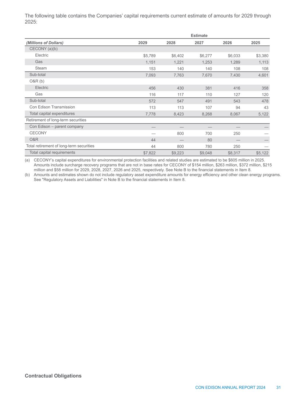 The following table contains the Companies’ capital requirements current estimate of amounts for 2029 through 2025: Estimate (Millions of Dollars) 2029 2028 2027 2026 2025 CECONY (a)(b) Electric $5,789 $6,402 $6,277 $6,033 $3,380 Gas 1,151 1,221 1,253 1,289 1,113 Steam 153 140 140 108 108 Sub-total 7,093 7,763 7,670 7,430 4,601 O&R (b) Electric 456 430 381 416 358 Gas 116 117 110 127 120 Sub-total 572 547 491 543 478 Con Edison Transmission 113 113 107 94 43 Total capital expenditures 7,778 8,423 8,268 8,067 5,122 Retirement of long-term securities Con Edison – parent company — — — — — CECONY — 800 700 250 — O&R 44 — 80 — — Total retirement of long-term securities 44 800 780 250 — Total capital requirements $7,822 $9,223 $9,048 $8,317 $5,122 (a) CECONY’s capital expenditures for environmental protection facilities and related studies are estimated to be $605 million in 2025. Amounts include surcharge recovery programs that are not in base rates for CECONY of $154 million, $263 million, $372 million, $215 million and $58 million for 2029, 2028, 2027, 2026 and 2025, respectively. See Note B to the financial statements in Item 8. (b) Amounts and estimates shown do not include regulatory asset expenditure amounts for energy efficiency and other clean energy programs. See "Regulatory Assets and Liabilities" in Note B to the financial statements in Item 8. Contractual Obligations CON EDISON ANNUAL REPORT 2024 31