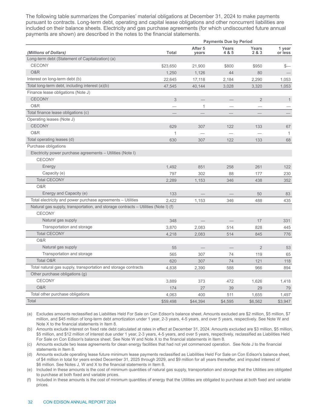 The following table summarizes the Companies’ material obligations at December 31, 2024 to make payments pursuant to contracts. Long-term debt, operating and capital lease obligations and other noncurrent liabilities are included on their balance sheets. Electricity and gas purchase agreements (for which undiscounted future annual payments are shown) are described in the notes to the financial statements. Payments Due by Period (Millions of Dollars) Total After 5 years Years 4 & 5 Years 2 & 3 1 year or less Long-term debt (Statement of Capitalization) (a) CECONY $23,650 21,900 $800 $950 $— O&R 1,250 1,126 44 80 — Interest on long-term debt (b) 22,645 17,118 2,184 2,290 1,053 Total long-term debt, including interest (a)(b) 47,545 40,144 3,028 3,320 1,053 Finance lease obligations (Note J) CECONY 3 — — 2 1 O&R — 1 — — — Total finance lease obligations (c) — — — — — Operating leases (Note J) CECONY 629 307 122 133 67 O&R 1 — — — 1 Total operating leases (d) 630 307 122 133 68 Purchase obligations Electricity power purchase agreements – Utilities (Note I) CECONY Energy 1,492 851 258 261 122 Capacity (e) 797 302 88 177 230 Total CECONY 2,289 1,153 346 438 352 O&R Energy and Capacity (e) 133 — — 50 83 Total electricity and power purchase agreements – Utilities 2,422 1,153 346 488 435 Natural gas supply, transportation, and storage contracts – Utilities (Note I) (f) CECONY Natural gas supply 348 — — 17 331 Transportation and storage 3,870 2,083 514 828 445 Total CECONY 4,218 2,083 514 845 776 O&R Natural gas supply 55 — — 2 53 Transportation and storage 565 307 74 119 65 Total O&R 620 307 74 121 118 Total natural gas supply, transportation and storage contracts 4,838 2,390 588 966 894 Other purchase obligations (g) CECONY 3,889 373 472 1,626 1,418 O&R 174 27 39 29 79 Total other purchase obligations 4,063 400 511 1,655 1,497 Total $59,498 $44,394 $4,595 $6,562 $3,947 (a) Excludes amounts reclassified as Liabilities Held For Sale on Con Edison's balance sheet. Amounts excluded are $2 million, $5 million, $7 million, and $45 million of long-term debt amortization under 1 year, 2-3 years, 4-5 years, and over 5 years, respectively. See Note W and Note X to the financial statements in Item 8. (b) Amounts exclude interest on fixed rate debt calculated at rates in effect at December 31, 2024. Amounts excluded are $3 million, $5 million, $5 million, and $12 million of interest due under 1 year, 2-3 years, 4-5 years, and over 5 years, respectively, reclassified as Liabilities Held For Sale on Con Edison's balance sheet. See Note W and Note X to the financial statements in Item 8. (c) Amounts exclude two lease agreements for clean energy facilities that had not yet commenced operation. See Note J to the financial statements in Item 8. (d) Amounts exclude operating lease future minimum lease payments reclassified as Liabilities Held For Sale on Con Edison's balance sheet, of $4 million in total for years ended December 31, 2025 through 2029, and $9 million for all years thereafter, and imputed interest of $6 million. See Notes J, W and X to the financial statements in Item 8. (e) Included in these amounts is the cost of minimum quantities of natural gas supply, transportation and storage that the Utilities are obligated to purchase at both fixed and variable prices. (f) Included in these amounts is the cost of minimum quantities of energy that the Utilities are obligated to purchase at both fixed and variable prices. 32 CON EDISON ANNUAL REPORT 2024