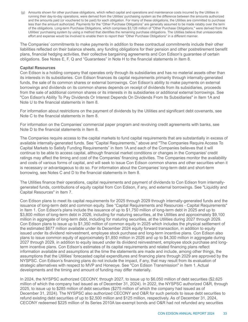 (g) Amounts shown for other purchase obligations, which reflect capital and operations and maintenance costs incurred by the Utilities in running their day-to-day operations, were derived from the Utilities’ purchasing system as the difference between the amounts authorized and the amounts paid (or vouchered to be paid) for each obligation. For many of these obligations, the Utilities are committed to purchase less than the amount authorized. Payments for the “Other Purchase Obligations” are generally assumed to be made ratably over the term of the obligations. Long-term Purchase Obligations, which comprises $3,126 million of "Other Purchase Obligations," were derived from the Utilities' purchasing system by using a method that identifies the remaining purchase obligations. The Utilities believe that unreasonable effort and expense would be involved to enable them to report their “Other Purchase Obligations” in a different manner. The Companies’ commitments to make payments in addition to these contractual commitments include their other liabilities reflected on their balance sheets, any funding obligations for their pension and other postretirement benefit plans, financial hedging activities, their collective bargaining agreements and Con Edison’s guarantee of certain obligations. See Notes E, F, Q and “Guarantees” in Note H to the financial statements in Item 8. Capital Resources Con Edison is a holding company that operates only through its subsidiaries and has no material assets other than its interests in its subsidiaries. Con Edison finances its capital requirements primarily through internally-generated funds, the sale of its common shares or external borrowings. Con Edison’s ability to make payments on external borrowings and dividends on its common shares depends on receipt of dividends from its subsidiaries, proceeds from the sale of additional common shares or its interests in its subsidiaries or additional external borrowings. See "Con Edison's Ability To Pay Dividends Or Interest Depends On Dividends From Its Subsidiaries" in Item 1A and Note U to the financial statements in Item 8. For information about restrictions on the payment of dividends by the Utilities and significant debt covenants, see Note C to the financial statements in Item 8. For information on the Companies’ commercial paper program and revolving credit agreements with banks, see Note D to the financial statements in Item 8. The Companies require access to the capital markets to fund capital requirements that are substantially in excess of available internally-generated funds. See “Capital Requirements,” above and "The Companies Require Access To Capital Markets to Satisfy Funding Requirements” in Item 1A and each of the Companies believes that it will continue to be able to access capital, although financial market conditions or changes in the Companies' credit ratings may affect the timing and cost of the Companies’ financing activities. The Companies monitor the availability and costs of various forms of capital, and will seek to issue Con Edison common shares and other securities when it is necessary or advantageous to do so. For information about the Companies’ long-term debt and short-term borrowing, see Notes C and D to the financial statements in Item 8. The Utilities finance their operations, capital requirements and payment of dividends to Con Edison from internally- generated funds, contributions of equity capital from Con Edison, if any, and external borrowings. See "Liquidity and Capital Resources" in Item 7. Con Edison plans to meet its capital requirements for 2025 through 2029 through internally-generated funds and the issuance of long-term debt and common equity. See “Capital Requirements and Resources - Capital Requirements" in Item 1. Con Edison's plans include the issuance of up to $1,750 million of long-term debt in 2025 and up to $3,800 million of long-term debt in 2026, including for maturing securities, at the Utilities and approximately $9,100 million in aggregate of long-term debt, including for maturing securities, at the Utilities during 2027 through 2029. Con Edison plans to issue up to $1,350 million of common equity in 2025 which includes the physical settlement of the estimated $677 million available under its December 2024 equity forward transaction, in addition to equity issued under its dividend reinvestment, employee stock purchase and long-term incentive plans. Con Edison also plans to issue common equity of approximately $1,850 million in 2026 and up to $4,300 million in aggregate during 2027 through 2029, in addition to equity issued under its dividend reinvestment, employee stock purchase and long- term incentive plans. Con Edison’s estimates of its capital requirements and related financing plans reflect information available and assumptions at the time the statements are made and include, among other things, the assumptions that the Utilities’ forecasted capital expenditures and financing plans through 2029 are approved by the NYSPSC. Con Edison’s financing plans do not include the impact, if any, that may result from its evaluation of strategic alternatives with respect to MVP and Honeoye. See "Con Edison Transmission" in Item 1. Actual developments and the timing and amount of funding may differ materially. In 2024, the NYSPSC authorized CECONY, through 2027, to issue up to $6,050 million of debt securities ($2,625 million of which the company had issued as of December 31, 2024). In 2022, the NYSPSC authorized O&R, through 2025, to issue up to $285 million of debt securities ($275 million of which the company had issued as of December 31, 2024). The NYSPSC also authorized CECONY and O&R for such periods to issue debt securities to refund existing debt securities of up to $2,500 million and $125 million, respectively. As of December 31, 2024, CECONY redeemed $225 million of its Series 2010A tax-exempt bonds and O&R had not ref