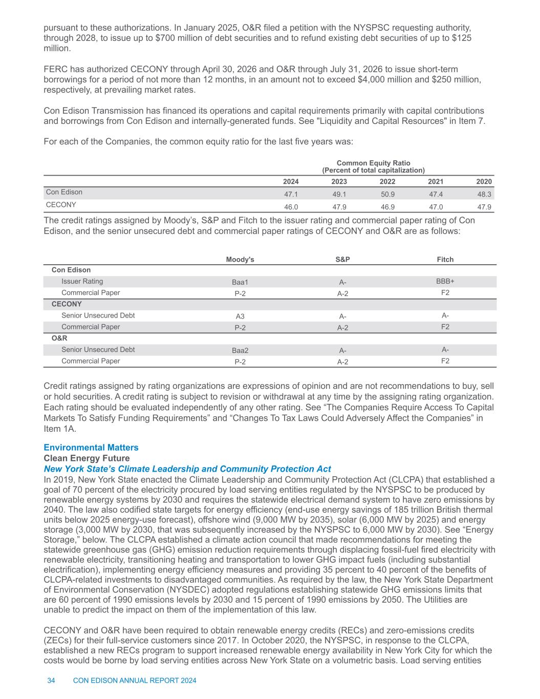 pursuant to these authorizations. In January 2025, O&R filed a petition with the NYSPSC requesting authority, through 2028, to issue up to $700 million of debt securities and to refund existing debt securities of up to $125 million. FERC has authorized CECONY through April 30, 2026 and O&R through July 31, 2026 to issue short-term borrowings for a period of not more than 12 months, in an amount not to exceed $4,000 million and $250 million, respectively, at prevailing market rates. Con Edison Transmission has financed its operations and capital requirements primarily with capital contributions and borrowings from Con Edison and internally-generated funds. See "Liquidity and Capital Resources" in Item 7. For each of the Companies, the common equity ratio for the last five years was: Common Equity Ratio (Percent of total capitalization) 2024 2023 2022 2021 2020 Con Edison 47.1 49.1 50.9 47.4 48.3 CECONY 46.0 47.9 46.9 47.0 47.9 The credit ratings assigned by Moody’s, S&P and Fitch to the issuer rating and commercial paper rating of Con Edison, and the senior unsecured debt and commercial paper ratings of CECONY and O&R are as follows: Moody's S&P Fitch Con Edison Issuer Rating Baa1 A- BBB+ Commercial Paper P-2 A-2 F2 CECONY Senior Unsecured Debt A3 A- A- Commercial Paper P-2 A-2 F2 O&R Senior Unsecured Debt Baa2 A- A- Commercial Paper P-2 A-2 F2 Credit ratings assigned by rating organizations are expressions of opinion and are not recommendations to buy, sell or hold securities. A credit rating is subject to revision or withdrawal at any time by the assigning rating organization. Each rating should be evaluated independently of any other rating. See “The Companies Require Access To Capital Markets To Satisfy Funding Requirements” and “Changes To Tax Laws Could Adversely Affect the Companies” in Item 1A. Environmental Matters Clean Energy Future New York State’s Climate Leadership and Community Protection Act In 2019, New York State enacted the Climate Leadership and Community Protection Act (CLCPA) that established a goal of 70 percent of the electricity procured by load serving entities regulated by the NYSPSC to be produced by renewable energy systems by 2030 and requires the statewide electrical demand system to have zero emissions by 2040. The law also codified state targets for energy efficiency (end-use energy savings of 185 trillion British thermal units below 2025 energy-use forecast), offshore wind (9,000 MW by 2035), solar (6,000 MW by 2025) and energy storage (3,000 MW by 2030, that was subsequently increased by the NYSPSC to 6,000 MW by 2030). See “Energy Storage,” below. The CLCPA established a climate action council that made recommendations for meeting the statewide greenhouse gas (GHG) emission reduction requirements through displacing fossil-fuel fired electricity with renewable electricity, transitioning heating and transportation to lower GHG impact fuels (including substantial electrification), implementing energy efficiency measures and providing 35 percent to 40 percent of the benefits of CLCPA-related investments to disadvantaged communities. As required by the law, the New York State Department of Environmental Conservation (NYSDEC) adopted regulations establishing statewide GHG emissions limits that are 60 percent of 1990 emissions levels by 2030 and 15 percent of 1990 emissions by 2050. The Utilities are unable to predict the impact on them of the implementation of this law. CECONY and O&R have been required to obtain renewable energy credits (RECs) and zero-emissions credits (ZECs) for their full-service customers since 2017. In October 2020, the NYSPSC, in response to the CLCPA, established a new RECs program to support increased renewable energy availability in New York City for which the costs would be borne by load serving entities across New York State on a volumetric basis. Load serving entities 34 CON EDISON ANNUAL REPORT 2024