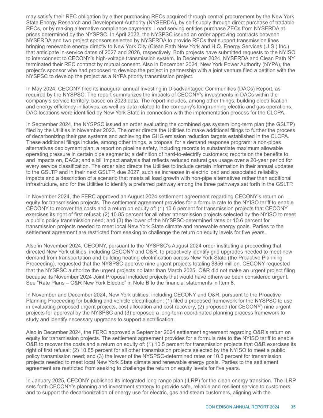 may satisfy their REC obligation by either purchasing RECs acquired through central procurement by the New York State Energy Research and Development Authority (NYSERDA), by self-supply through direct purchase of tradable RECs, or by making alternative compliance payments. Load serving entities purchase ZECs from NYSERDA at prices determined by the NYSPSC. In April 2022, the NYSPSC issued an order approving contracts between NYSERDA and two project sponsors selected by NYSERDA to provide RECs that support transmission lines bringing renewable energy directly to New York City (Clean Path New York and H.Q. Energy Services (U.S.) Inc.) that anticipate in-service dates of 2027 and 2026, respectively. Both projects have submitted requests to the NYISO to interconnect to CECONY’s high-voltage transmission system. In December 2024, NYSERDA and Clean Path NY terminated their REC contract by mutual consent. Also in December 2024, New York Power Authority (NYPA), the project’s sponsor who had proposed to develop the project in partnership with a joint venture filed a petition with the NYSPSC to develop the project as a NYPA priority transmission project. In May 2024, CECONY filed its inaugural annual Investing in Disadvantaged Communities (DACs) Report, as required by the NYSPSC. The report summarizes the impacts of CECONY's investments in DACs within the company’s service territory, based on 2023 data. The report includes, among other things, building electrification and energy efficiency initiatives, as well as data related to the company’s long-running electric and gas operations. DAC locations were identified by New York State in connection with the implementation process for the CLCPA. In September 2024, the NYSPSC issued an order evaluating the combined gas system long-term plan (the GSLTP) filed by the Utilities in November 2023. The order directs the Utilities to make additional filings to further the process of decarbonizing their gas systems and achieving the GHG emission reduction targets established in the CLCPA. These additional filings include, among other things, a proposal for a demand response program; a non-pipes alternatives deployment plan; a report on pipeline safety, including records to substantiate maximum allowable operating pressure in certain pipe segments; a definition of hard-to-electrify customers; reports on the benefits to, and impacts on, DACs; and a bill impact analysis that reflects reduced natural gas usage over a 20-year period for every service classification. The order also directs the Utilities to include certain information in their annual updates to the GSLTP and in their next GSLTP, due 2027, such as increases in electric load and associated reliability impacts and a description of a scenario that meets all load growth with non-pipe alternatives rather than additional infrastructure, and for the Utilities to identify a preferred pathway among the three pathways set forth in the GSLTP. In November 2024, the FERC approved an August 2024 settlement agreement regarding CECONY’s return on equity for transmission projects. The settlement agreement provides for a formula rate to the NYISO tariff to enable CECONY to recover the costs and a return on equity of: (1) 10.6 percent for transmission projects that CECONY exercises its right of first refusal; (2) 10.85 percent for all other transmission projects selected by the NYISO to meet a public policy transmission need; and (3) the lower of the NYSPSC-determined rates or 10.6 percent for transmission projects needed to meet local New York State climate and renewable energy goals. Parties to the settlement agreement are restricted from seeking to challenge the return on equity levels for five years. Also in November 2024, CECONY, pursuant to the NYSPSC’s August 2024 order instituting a proceeding that directed New York utilities, including CECONY and O&R, to proactively identify grid upgrades needed to meet new demand from transportation and building heating electrification across New York State (the Proactive Planning Proceeding), requested that the NYSPSC approve nine urgent projects totaling $856 million. CECONY requested that the NYSPSC authorize the urgent projects no later than March 2025. O&R did not make an urgent project filing because its November 2024 Joint Proposal included projects that would have otherwise been considered urgent. See “Rate Plans – O&R New York Electric” in Note B to the financial statements in Item 8. In November and December 2024, New York utilities, including CECONY and O&R, pursuant to the Proactive Planning Proceeding for building and vehicle electrification: (1) filed a proposed framework for the NYSPSC to use in evaluating proposed urgent projects, cost allocation and cost recovery, (2) proposed (for CECONY) nine urgent projects for approval by the NYSPSC and (3) proposed a long-term coordinated planning process framework to study and identify necessary upgrades to support electrification. Also in December 2024, the FERC approved a September 2024 settlement agreement regarding O&R’s return on equity for transmission projects. The settlement agreement provides for a formula rate to the NYISO tariff to enable O&R to recover the costs and a return on equity of: (1) 10.5 percent for transmission projects that O&R exercises its right of first refusal; (2) 10.85 percent for all other transmission projects selected by the NYISO to meet a public policy transmission need; and (3) the lower of the NYSPSC-determined rates or 10.6 percent for transmission projects needed to meet local New York State climate and renewable energy goals. Parties to the settlement agreement are restricted from seeking to challenge the return on equity levels for five years. In January 2025, CECONY published its integrated long-range plan (ILRP) for the clean energy transition. The ILRP sets forth CECONY’s planning and investment strategy to provide safe, reliable and resilient service to cu