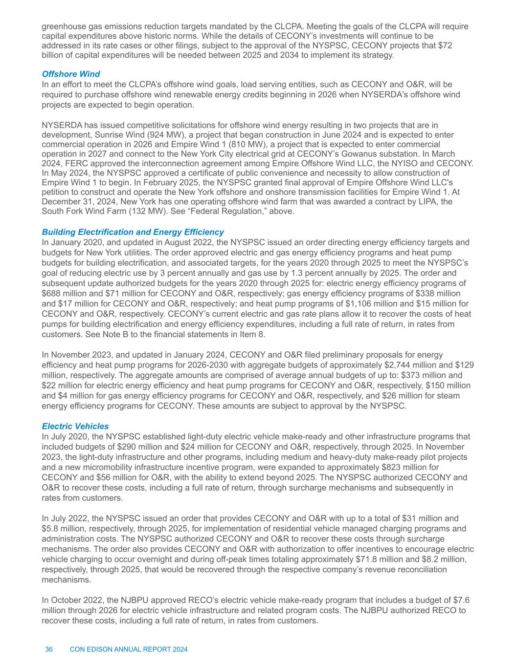 greenhouse gas emissions reduction targets mandated by the CLCPA. Meeting the goals of the CLCPA will require capital expenditures above historic norms. While the details of CECONY’s investments will continue to be addressed in its rate cases or other filings, subject to the approval of the NYSPSC, CECONY projects that $72 billion of capital expenditures will be needed between 2025 and 2034 to implement its strategy. Offshore Wind In an effort to meet the CLCPA’s offshore wind goals, load serving entities, such as CECONY and O&R, will be required to purchase offshore wind renewable energy credits beginning in 2026 when NYSERDA's offshore wind projects are expected to begin operation. NYSERDA has issued competitive solicitations for offshore wind energy resulting in two projects that are in development, Sunrise Wind (924 MW), a project that began construction in June 2024 and is expected to enter commercial operation in 2026 and Empire Wind 1 (810 MW), a project that is expected to enter commercial operation in 2027 and connect to the New York City electrical grid at CECONY’s Gowanus substation. In March 2024, FERC approved the interconnection agreement among Empire Offshore Wind LLC, the NYISO and CECONY. In May 2024, the NYSPSC approved a certificate of public convenience and necessity to allow construction of Empire Wind 1 to begin. In February 2025, the NYSPSC granted final approval of Empire Offshore Wind LLC's petition to construct and operate the New York offshore and onshore transmission facilities for Empire Wind 1. At December 31, 2024, New York has one operating offshore wind farm that was awarded a contract by LIPA, the South Fork Wind Farm (132 MW). See “Federal Regulation,” above. Building Electrification and Energy Efficiency In January 2020, and updated in August 2022, the NYSPSC issued an order directing energy efficiency targets and budgets for New York utilities. The order approved electric and gas energy efficiency programs and heat pump budgets for building electrification, and associated targets, for the years 2020 through 2025 to meet the NYSPSC’s goal of reducing electric use by 3 percent annually and gas use by 1.3 percent annually by 2025. The order and subsequent update authorized budgets for the years 2020 through 2025 for: electric energy efficiency programs of $688 million and $71 million for CECONY and O&R, respectively; gas energy efficiency programs of $338 million and $17 million for CECONY and O&R, respectively; and heat pump programs of $1,106 million and $15 million for CECONY and O&R, respectively. CECONY’s current electric and gas rate plans allow it to recover the costs of heat pumps for building electrification and energy efficiency expenditures, including a full rate of return, in rates from customers. See Note B to the financial statements in Item 8. In November 2023, and updated in January 2024, CECONY and O&R filed preliminary proposals for energy efficiency and heat pump programs for 2026-2030 with aggregate budgets of approximately $2,744 million and $129 million, respectively. The aggregate amounts are comprised of average annual budgets of up to: $373 million and $22 million for electric energy efficiency and heat pump programs for CECONY and O&R, respectively, $150 million and $4 million for gas energy efficiency programs for CECONY and O&R, respectively, and $26 million for steam energy efficiency programs for CECONY. These amounts are subject to approval by the NYSPSC. Electric Vehicles In July 2020, the NYSPSC established light-duty electric vehicle make-ready and other infrastructure programs that included budgets of $290 million and $24 million for CECONY and O&R, respectively, through 2025. In November 2023, the light-duty infrastructure and other programs, including medium and heavy-duty make-ready pilot projects and a new micromobility infrastructure incentive program, were expanded to approximately $823 million for CECONY and $56 million for O&R, with the ability to extend beyond 2025. The NYSPSC authorized CECONY and O&R to recover these costs, including a full rate of return, through surcharge mechanisms and subsequently in rates from customers. In July 2022, the NYSPSC issued an order that provides CECONY and O&R with up to a total of $31 million and $5.8 million, respectively, through 2025, for implementation of residential vehicle managed charging programs and administration costs. The NYSPSC authorized CECONY and O&R to recover these costs through surcharge mechanisms. The order also provides CECONY and O&R with authorization to offer incentives to encourage electric vehicle charging to occur overnight and during off-peak times totaling approximately $71.8 million and $8.2 million, respectively, through 2025, that would be recovered through the respective company’s revenue reconciliation mechanisms. In October 2022, the NJBPU approved RECO’s electric vehicle make-ready program that includes a budget of $7.6 million through 2026 for electric vehicle infrastructure and related program costs. The NJBPU authorized RECO to recover these costs, including a full rate of return, in rates from customers. 36 CON EDISON ANNUAL REPORT 2024