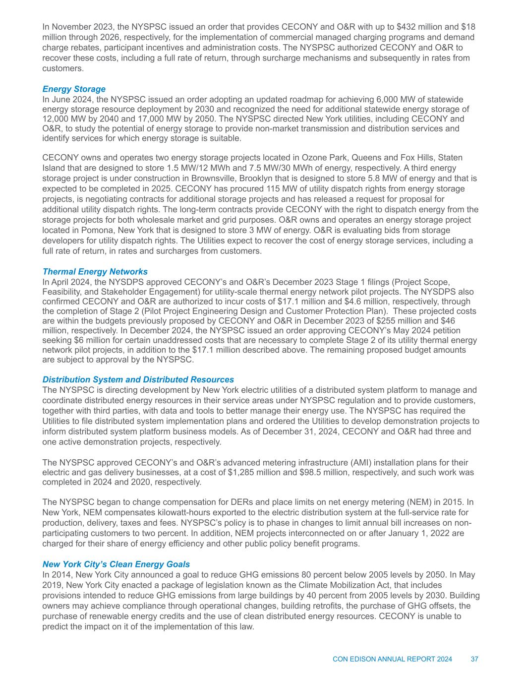 In November 2023, the NYSPSC issued an order that provides CECONY and O&R with up to $432 million and $18 million through 2026, respectively, for the implementation of commercial managed charging programs and demand charge rebates, participant incentives and administration costs. The NYSPSC authorized CECONY and O&R to recover these costs, including a full rate of return, through surcharge mechanisms and subsequently in rates from customers. Energy Storage In June 2024, the NYSPSC issued an order adopting an updated roadmap for achieving 6,000 MW of statewide energy storage resource deployment by 2030 and recognized the need for additional statewide energy storage of 12,000 MW by 2040 and 17,000 MW by 2050. The NYSPSC directed New York utilities, including CECONY and O&R, to study the potential of energy storage to provide non-market transmission and distribution services and identify services for which energy storage is suitable. CECONY owns and operates two energy storage projects located in Ozone Park, Queens and Fox Hills, Staten Island that are designed to store 1.5 MW/12 MWh and 7.5 MW/30 MWh of energy, respectively. A third energy storage project is under construction in Brownsville, Brooklyn that is designed to store 5.8 MW of energy and that is expected to be completed in 2025. CECONY has procured 115 MW of utility dispatch rights from energy storage projects, is negotiating contracts for additional storage projects and has released a request for proposal for additional utility dispatch rights. The long-term contracts provide CECONY with the right to dispatch energy from the storage projects for both wholesale market and grid purposes. O&R owns and operates an energy storage project located in Pomona, New York that is designed to store 3 MW of energy. O&R is evaluating bids from storage developers for utility dispatch rights. The Utilities expect to recover the cost of energy storage services, including a full rate of return, in rates and surcharges from customers. Thermal Energy Networks In April 2024, the NYSDPS approved CECONY’s and O&R’s December 2023 Stage 1 filings (Project Scope, Feasibility, and Stakeholder Engagement) for utility-scale thermal energy network pilot projects. The NYSDPS also confirmed CECONY and O&R are authorized to incur costs of $17.1 million and $4.6 million, respectively, through the completion of Stage 2 (Pilot Project Engineering Design and Customer Protection Plan). These projected costs are within the budgets previously proposed by CECONY and O&R in December 2023 of $255 million and $46 million, respectively. In December 2024, the NYSPSC issued an order approving CECONY’s May 2024 petition seeking $6 million for certain unaddressed costs that are necessary to complete Stage 2 of its utility thermal energy network pilot projects, in addition to the $17.1 million described above. The remaining proposed budget amounts are subject to approval by the NYSPSC. Distribution System and Distributed Resources The NYSPSC is directing development by New York electric utilities of a distributed system platform to manage and coordinate distributed energy resources in their service areas under NYSPSC regulation and to provide customers, together with third parties, with data and tools to better manage their energy use. The NYSPSC has required the Utilities to file distributed system implementation plans and ordered the Utilities to develop demonstration projects to inform distributed system platform business models. As of December 31, 2024, CECONY and O&R had three and one active demonstration projects, respectively. The NYSPSC approved CECONY’s and O&R’s advanced metering infrastructure (AMI) installation plans for their electric and gas delivery businesses, at a cost of $1,285 million and $98.5 million, respectively, and such work was completed in 2024 and 2020, respectively. The NYSPSC began to change compensation for DERs and place limits on net energy metering (NEM) in 2015. In New York, NEM compensates kilowatt-hours exported to the electric distribution system at the full-service rate for production, delivery, taxes and fees. NYSPSC’s policy is to phase in changes to limit annual bill increases on non- participating customers to two percent. In addition, NEM projects interconnected on or after January 1, 2022 are charged for their share of energy efficiency and other public policy benefit programs. New York City’s Clean Energy Goals In 2014, New York City announced a goal to reduce GHG emissions 80 percent below 2005 levels by 2050. In May 2019, New York City enacted a package of legislation known as the Climate Mobilization Act, that includes provisions intended to reduce GHG emissions from large buildings by 40 percent from 2005 levels by 2030. Building owners may achieve compliance through operational changes, building retrofits, the purchase of GHG offsets, the purchase of renewable energy credits and the use of clean distributed energy resources. CECONY is unable to predict the impact on it of the implementation of this law. CON EDISON ANNUAL REPORT 2024 37