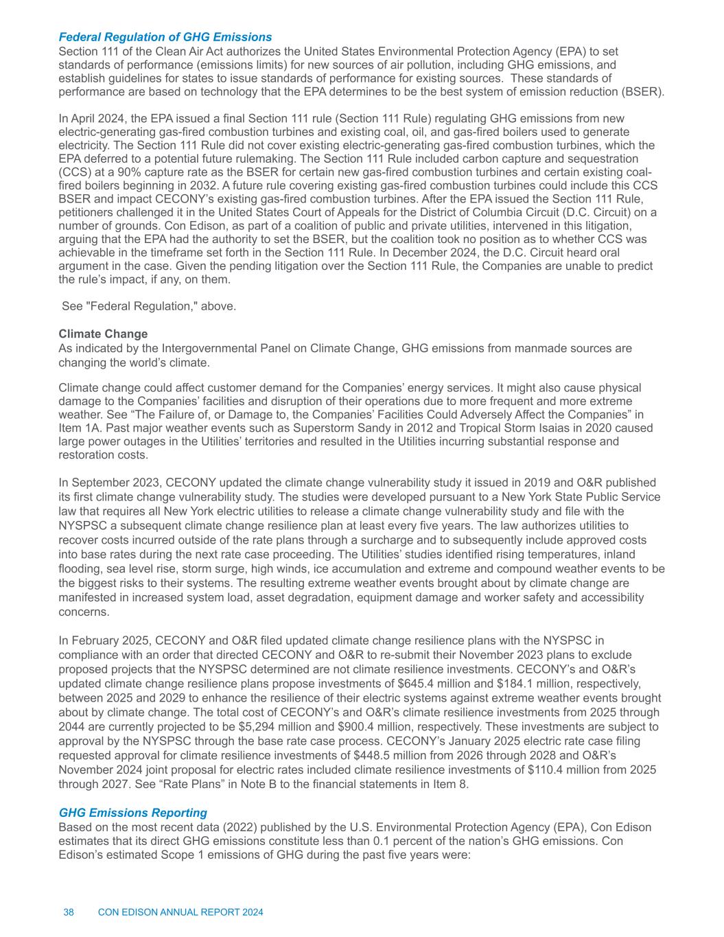 Federal Regulation of GHG Emissions Section 111 of the Clean Air Act authorizes the United States Environmental Protection Agency (EPA) to set standards of performance (emissions limits) for new sources of air pollution, including GHG emissions, and establish guidelines for states to issue standards of performance for existing sources. These standards of performance are based on technology that the EPA determines to be the best system of emission reduction (BSER). In April 2024, the EPA issued a final Section 111 rule (Section 111 Rule) regulating GHG emissions from new electric-generating gas-fired combustion turbines and existing coal, oil, and gas-fired boilers used to generate electricity. The Section 111 Rule did not cover existing electric-generating gas-fired combustion turbines, which the EPA deferred to a potential future rulemaking. The Section 111 Rule included carbon capture and sequestration (CCS) at a 90% capture rate as the BSER for certain new gas-fired combustion turbines and certain existing coal- fired boilers beginning in 2032. A future rule covering existing gas-fired combustion turbines could include this CCS BSER and impact CECONY’s existing gas-fired combustion turbines. After the EPA issued the Section 111 Rule, petitioners challenged it in the United States Court of Appeals for the District of Columbia Circuit (D.C. Circuit) on a number of grounds. Con Edison, as part of a coalition of public and private utilities, intervened in this litigation, arguing that the EPA had the authority to set the BSER, but the coalition took no position as to whether CCS was achievable in the timeframe set forth in the Section 111 Rule. In December 2024, the D.C. Circuit heard oral argument in the case. Given the pending litigation over the Section 111 Rule, the Companies are unable to predict the rule’s impact, if any, on them. See "Federal Regulation," above. Climate Change As indicated by the Intergovernmental Panel on Climate Change, GHG emissions from manmade sources are changing the world’s climate. Climate change could affect customer demand for the Companies’ energy services. It might also cause physical damage to the Companies’ facilities and disruption of their operations due to more frequent and more extreme weather. See “The Failure of, or Damage to, the Companies’ Facilities Could Adversely Affect the Companies” in Item 1A. Past major weather events such as Superstorm Sandy in 2012 and Tropical Storm Isaias in 2020 caused large power outages in the Utilities’ territories and resulted in the Utilities incurring substantial response and restoration costs. In September 2023, CECONY updated the climate change vulnerability study it issued in 2019 and O&R published its first climate change vulnerability study. The studies were developed pursuant to a New York State Public Service law that requires all New York electric utilities to release a climate change vulnerability study and file with the NYSPSC a subsequent climate change resilience plan at least every five years. The law authorizes utilities to recover costs incurred outside of the rate plans through a surcharge and to subsequently include approved costs into base rates during the next rate case proceeding. The Utilities’ studies identified rising temperatures, inland flooding, sea level rise, storm surge, high winds, ice accumulation and extreme and compound weather events to be the biggest risks to their systems. The resulting extreme weather events brought about by climate change are manifested in increased system load, asset degradation, equipment damage and worker safety and accessibility concerns. In February 2025, CECONY and O&R filed updated climate change resilience plans with the NYSPSC in compliance with an order that directed CECONY and O&R to re-submit their November 2023 plans to exclude proposed projects that the NYSPSC determined are not climate resilience investments. CECONY’s and O&R’s updated climate change resilience plans propose investments of $645.4 million and $184.1 million, respectively, between 2025 and 2029 to enhance the resilience of their electric systems against extreme weather events brought about by climate change. The total cost of CECONY’s and O&R’s climate resilience investments from 2025 through 2044 are currently projected to be $5,294 million and $900.4 million, respectively. These investments are subject to approval by the NYSPSC through the base rate case process. CECONY’s January 2025 electric rate case filing requested approval for climate resilience investments of $448.5 million from 2026 through 2028 and O&R’s November 2024 joint proposal for electric rates included climate resilience investments of $110.4 million from 2025 through 2027. See “Rate Plans” in Note B to the financial statements in Item 8. GHG Emissions Reporting Based on the most recent data (2022) published by the U.S. Environmental Protection Agency (EPA), Con Edison estimates that its direct GHG emissions constitute less than 0.1 percent of the nation’s GHG emissions. Con Edison’s estimated Scope 1 emissions of GHG during the past five years were: 38 CON EDISON ANNUAL REPORT 2024