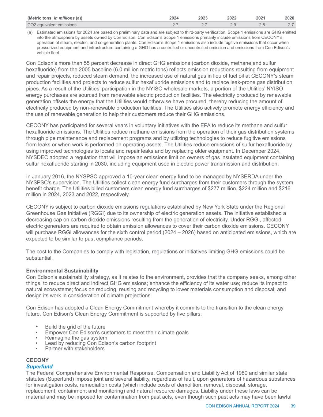 (Metric tons, in millions (a)) 2024 2023 2022 2021 2020 CO2 equivalent emissions 2.7 2.7 2.9 2.8 2.7 (a) Estimated emissions for 2024 are based on preliminary data and are subject to third-party verification. Scope 1 emissions are GHG emitted into the atmosphere by assets owned by Con Edison. Con Edison’s Scope 1 emissions primarily include emissions from CECONY’s operation of steam, electric, and co-generation plants. Con Edison’s Scope 1 emissions also include fugitive emissions that occur when pressurized equipment and infrastructure containing a GHG has a controlled or uncontrolled emission and emissions from Con Edison’s vehicle fleet. Con Edison’s more than 55 percent decrease in direct GHG emissions (carbon dioxide, methane and sulfur hexafluoride) from the 2005 baseline (6.0 million metric tons) reflects emission reductions resulting from equipment and repair projects, reduced steam demand, the increased use of natural gas in lieu of fuel oil at CECONY’s steam production facilities and projects to reduce sulfur hexafluoride emissions and to replace leak-prone gas distribution pipes. As a result of the Utilities’ participation in the NYISO wholesale markets, a portion of the Utilities’ NYISO energy purchases are sourced from renewable electric production facilities. The electricity produced by renewable generation offsets the energy that the Utilities would otherwise have procured, thereby reducing the amount of electricity produced by non-renewable production facilities. The Utilities also actively promote energy efficiency and the use of renewable generation to help their customers reduce their GHG emissions. CECONY has participated for several years in voluntary initiatives with the EPA to reduce its methane and sulfur hexafluoride emissions. The Utilities reduce methane emissions from the operation of their gas distribution systems through pipe maintenance and replacement programs and by utilizing technologies to reduce fugitive emissions from leaks or when work is performed on operating assets. The Utilities reduce emissions of sulfur hexafluoride by using improved technologies to locate and repair leaks and by replacing older equipment. In December 2024, NYSDEC adopted a regulation that will impose an emissions limit on owners of gas insulated equipment containing sulfur hexafluoride starting in 2030, including equipment used in electric power transmission and distribution. In January 2016, the NYSPSC approved a 10-year clean energy fund to be managed by NYSERDA under the NYSPSC's supervision. The Utilities collect clean energy fund surcharges from their customers through the system benefit charge. The Utilities billed customers clean energy fund surcharges of $277 million, $224 million and $216 million in 2024, 2023 and 2022, respectively. CECONY is subject to carbon dioxide emissions regulations established by New York State under the Regional Greenhouse Gas Initiative (RGGI) due to its ownership of electric generation assets. The initiative established a decreasing cap on carbon dioxide emissions resulting from the generation of electricity. Under RGGI, affected electric generators are required to obtain emission allowances to cover their carbon dioxide emissions. CECONY will purchase RGGI allowances for the sixth control period (2024 – 2026) based on anticipated emissions, which are expected to be similar to past compliance periods. The cost to the Companies to comply with legislation, regulations or initiatives limiting GHG emissions could be substantial. Environmental Sustainability Con Edison’s sustainability strategy, as it relates to the environment, provides that the company seeks, among other things, to reduce direct and indirect GHG emissions; enhance the efficiency of its water use; reduce its impact to natural ecosystems; focus on reducing, reusing and recycling to lower materials consumption and disposal; and design its work in consideration of climate projections. Con Edison has adopted a Clean Energy Commitment whereby it commits to the transition to the clean energy future. Con Edison's Clean Energy Commitment is supported by five pillars: • Build the grid of the future • Empower Con Edison's customers to meet their climate goals • Reimagine the gas system • Lead by reducing Con Edison's carbon footprint • Partner with stakeholders CECONY Superfund The Federal Comprehensive Environmental Response, Compensation and Liability Act of 1980 and similar state statutes (Superfund) impose joint and several liability, regardless of fault, upon generators of hazardous substances for investigation costs, remediation costs (which include costs of demolition, removal, disposal, storage, replacement, containment and monitoring) and natural resource damages. Liability under these laws can be material and may be imposed for contamination from past acts, even though such past acts may have been lawful CON EDISON ANNUAL REPORT 2024 39