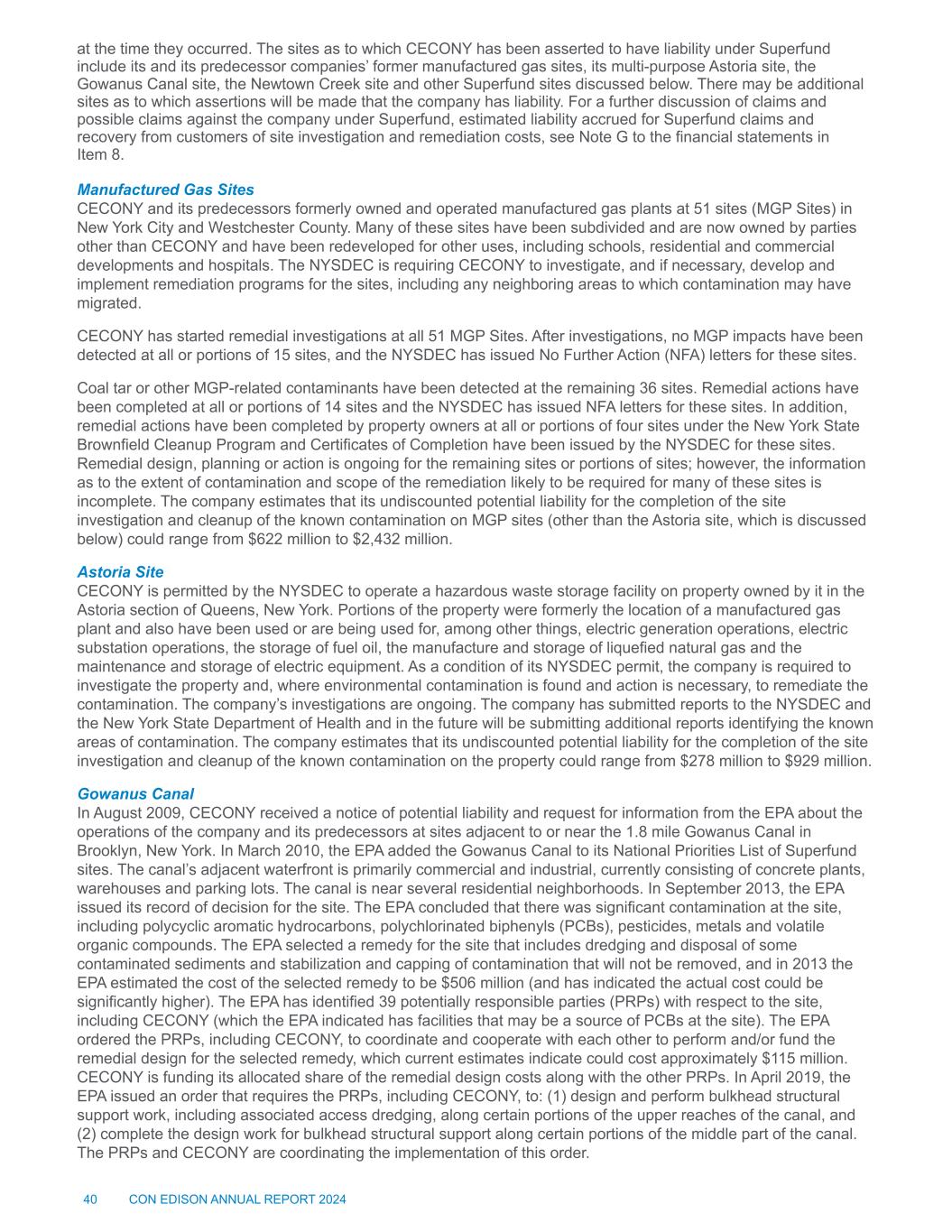at the time they occurred. The sites as to which CECONY has been asserted to have liability under Superfund include its and its predecessor companies’ former manufactured gas sites, its multi-purpose Astoria site, the Gowanus Canal site, the Newtown Creek site and other Superfund sites discussed below. There may be additional sites as to which assertions will be made that the company has liability. For a further discussion of claims and possible claims against the company under Superfund, estimated liability accrued for Superfund claims and recovery from customers of site investigation and remediation costs, see Note G to the financial statements in Item 8. Manufactured Gas Sites CECONY and its predecessors formerly owned and operated manufactured gas plants at 51 sites (MGP Sites) in New York City and Westchester County. Many of these sites have been subdivided and are now owned by parties other than CECONY and have been redeveloped for other uses, including schools, residential and commercial developments and hospitals. The NYSDEC is requiring CECONY to investigate, and if necessary, develop and implement remediation programs for the sites, including any neighboring areas to which contamination may have migrated. CECONY has started remedial investigations at all 51 MGP Sites. After investigations, no MGP impacts have been detected at all or portions of 15 sites, and the NYSDEC has issued No Further Action (NFA) letters for these sites. Coal tar or other MGP-related contaminants have been detected at the remaining 36 sites. Remedial actions have been completed at all or portions of 14 sites and the NYSDEC has issued NFA letters for these sites. In addition, remedial actions have been completed by property owners at all or portions of four sites under the New York State Brownfield Cleanup Program and Certificates of Completion have been issued by the NYSDEC for these sites. Remedial design, planning or action is ongoing for the remaining sites or portions of sites; however, the information as to the extent of contamination and scope of the remediation likely to be required for many of these sites is incomplete. The company estimates that its undiscounted potential liability for the completion of the site investigation and cleanup of the known contamination on MGP sites (other than the Astoria site, which is discussed below) could range from $622 million to $2,432 million. Astoria Site CECONY is permitted by the NYSDEC to operate a hazardous waste storage facility on property owned by it in the Astoria section of Queens, New York. Portions of the property were formerly the location of a manufactured gas plant and also have been used or are being used for, among other things, electric generation operations, electric substation operations, the storage of fuel oil, the manufacture and storage of liquefied natural gas and the maintenance and storage of electric equipment. As a condition of its NYSDEC permit, the company is required to investigate the property and, where environmental contamination is found and action is necessary, to remediate the contamination. The company’s investigations are ongoing. The company has submitted reports to the NYSDEC and the New York State Department of Health and in the future will be submitting additional reports identifying the known areas of contamination. The company estimates that its undiscounted potential liability for the completion of the site investigation and cleanup of the known contamination on the property could range from $278 million to $929 million. Gowanus Canal In August 2009, CECONY received a notice of potential liability and request for information from the EPA about the operations of the company and its predecessors at sites adjacent to or near the 1.8 mile Gowanus Canal in Brooklyn, New York. In March 2010, the EPA added the Gowanus Canal to its National Priorities List of Superfund sites. The canal’s adjacent waterfront is primarily commercial and industrial, currently consisting of concrete plants, warehouses and parking lots. The canal is near several residential neighborhoods. In September 2013, the EPA issued its record of decision for the site. The EPA concluded that there was significant contamination at the site, including polycyclic aromatic hydrocarbons, polychlorinated biphenyls (PCBs), pesticides, metals and volatile organic compounds. The EPA selected a remedy for the site that includes dredging and disposal of some contaminated sediments and stabilization and capping of contamination that will not be removed, and in 2013 the EPA estimated the cost of the selected remedy to be $506 million (and has indicated the actual cost could be significantly higher). The EPA has identified 39 potentially responsible parties (PRPs) with respect to the site, including CECONY (which the EPA indicated has facilities that may be a source of PCBs at the site). The EPA ordered the PRPs, including CECONY, to coordinate and cooperate with each other to perform and/or fund the remedial design for the selected remedy, which current estimates indicate could cost approximately $115 million. CECONY is funding its allocated share of the remedial design costs along with the other PRPs. In April 2019, the EPA issued an order that requires the PRPs, including CECONY, to: (1) design and perform bulkhead structural support work, including associated access dredging, along certain portions of the upper reaches of the canal, and (2) complete the design work for bulkhead structural support along certain portions of the middle part of the canal. The PRPs and CECONY are coordinating the implementation of this order. 40 CON EDISON ANNUAL REPORT 2024