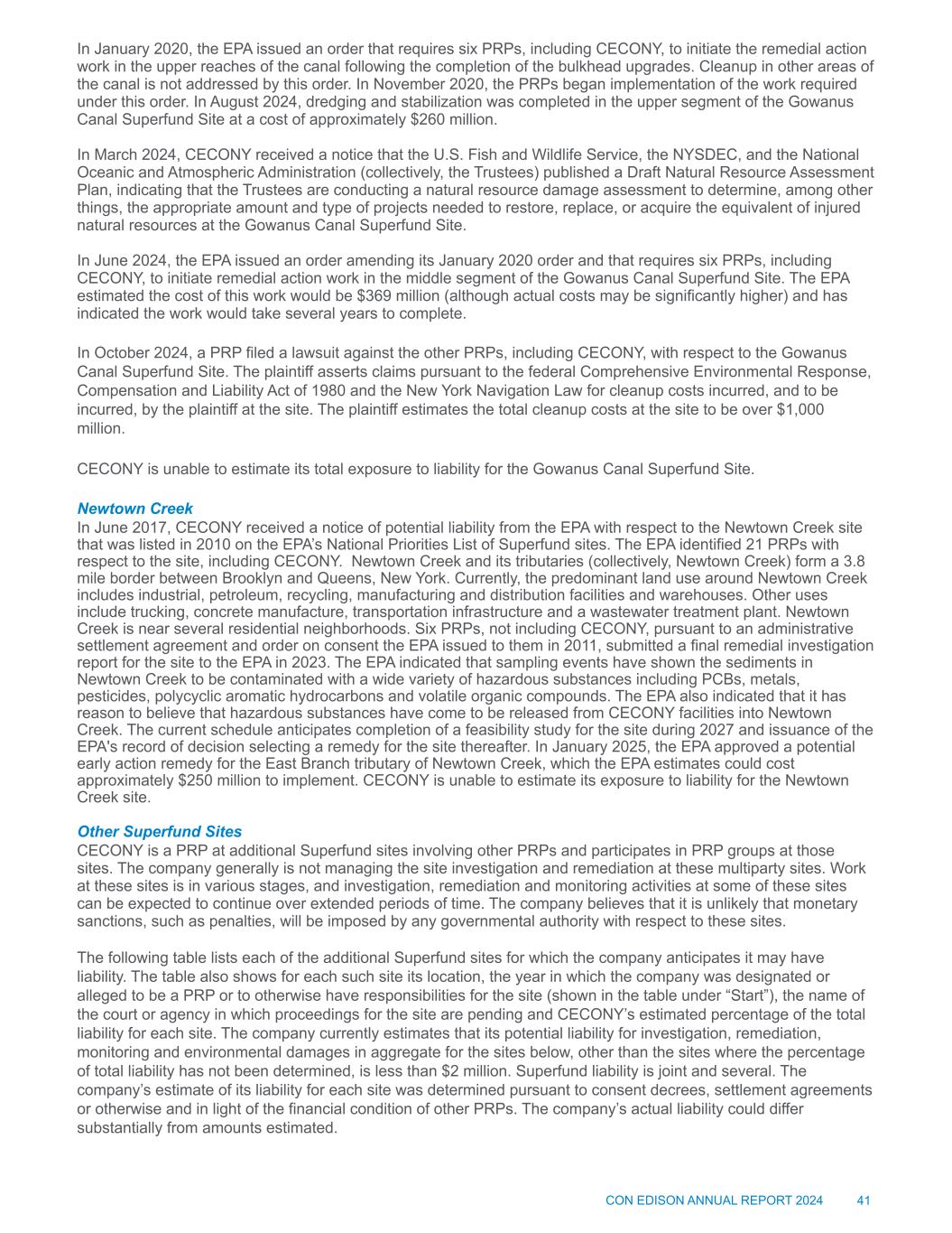 In January 2020, the EPA issued an order that requires six PRPs, including CECONY, to initiate the remedial action work in the upper reaches of the canal following the completion of the bulkhead upgrades. Cleanup in other areas of the canal is not addressed by this order. In November 2020, the PRPs began implementation of the work required under this order. In August 2024, dredging and stabilization was completed in the upper segment of the Gowanus Canal Superfund Site at a cost of approximately $260 million. In March 2024, CECONY received a notice that the U.S. Fish and Wildlife Service, the NYSDEC, and the National Oceanic and Atmospheric Administration (collectively, the Trustees) published a Draft Natural Resource Assessment Plan, indicating that the Trustees are conducting a natural resource damage assessment to determine, among other things, the appropriate amount and type of projects needed to restore, replace, or acquire the equivalent of injured natural resources at the Gowanus Canal Superfund Site. In June 2024, the EPA issued an order amending its January 2020 order and that requires six PRPs, including CECONY, to initiate remedial action work in the middle segment of the Gowanus Canal Superfund Site. The EPA estimated the cost of this work would be $369 million (although actual costs may be significantly higher) and has indicated the work would take several years to complete. In October 2024, a PRP filed a lawsuit against the other PRPs, including CECONY, with respect to the Gowanus Canal Superfund Site. The plaintiff asserts claims pursuant to the federal Comprehensive Environmental Response, Compensation and Liability Act of 1980 and the New York Navigation Law for cleanup costs incurred, and to be incurred, by the plaintiff at the site. The plaintiff estimates the total cleanup costs at the site to be over $1,000 million. CECONY is unable to estimate its total exposure to liability for the Gowanus Canal Superfund Site. Newtown Creek In June 2017, CECONY received a notice of potential liability from the EPA with respect to the Newtown Creek site that was listed in 2010 on the EPA’s National Priorities List of Superfund sites. The EPA identified 21 PRPs with respect to the site, including CECONY. Newtown Creek and its tributaries (collectively, Newtown Creek) form a 3.8 mile border between Brooklyn and Queens, New York. Currently, the predominant land use around Newtown Creek includes industrial, petroleum, recycling, manufacturing and distribution facilities and warehouses. Other uses include trucking, concrete manufacture, transportation infrastructure and a wastewater treatment plant. Newtown Creek is near several residential neighborhoods. Six PRPs, not including CECONY, pursuant to an administrative settlement agreement and order on consent the EPA issued to them in 2011, submitted a final remedial investigation report for the site to the EPA in 2023. The EPA indicated that sampling events have shown the sediments in Newtown Creek to be contaminated with a wide variety of hazardous substances including PCBs, metals, pesticides, polycyclic aromatic hydrocarbons and volatile organic compounds. The EPA also indicated that it has reason to believe that hazardous substances have come to be released from CECONY facilities into Newtown Creek. The current schedule anticipates completion of a feasibility study for the site during 2027 and issuance of the EPA's record of decision selecting a remedy for the site thereafter. In January 2025, the EPA approved a potential early action remedy for the East Branch tributary of Newtown Creek, which the EPA estimates could cost approximately $250 million to implement. CECONY is unable to estimate its exposure to liability for the Newtown Creek site. Other Superfund Sites CECONY is a PRP at additional Superfund sites involving other PRPs and participates in PRP groups at those sites. The company generally is not managing the site investigation and remediation at these multiparty sites. Work at these sites is in various stages, and investigation, remediation and monitoring activities at some of these sites can be expected to continue over extended periods of time. The company believes that it is unlikely that monetary sanctions, such as penalties, will be imposed by any governmental authority with respect to these sites. The following table lists each of the additional Superfund sites for which the company anticipates it may have liability. The table also shows for each such site its location, the year in which the company was designated or alleged to be a PRP or to otherwise have responsibilities for the site (shown in the table under “Start”), the name of the court or agency in which proceedings for the site are pending and CECONY’s estimated percentage of the total liability for each site. The company currently estimates that its potential liability for investigation, remediation, monitoring and environmental damages in aggregate for the sites below, other than the sites where the percentage of total liability has not been determined, is less than $2 million. Superfund liability is joint and several. The company’s estimate of its liability for each site was determined pursuant to consent decrees, settlement agreements or otherwise and in light of the financial condition of other PRPs. The company’s actual liability could differ substantially from amounts estimated. CON EDISON ANNUAL REPORT 2024 41