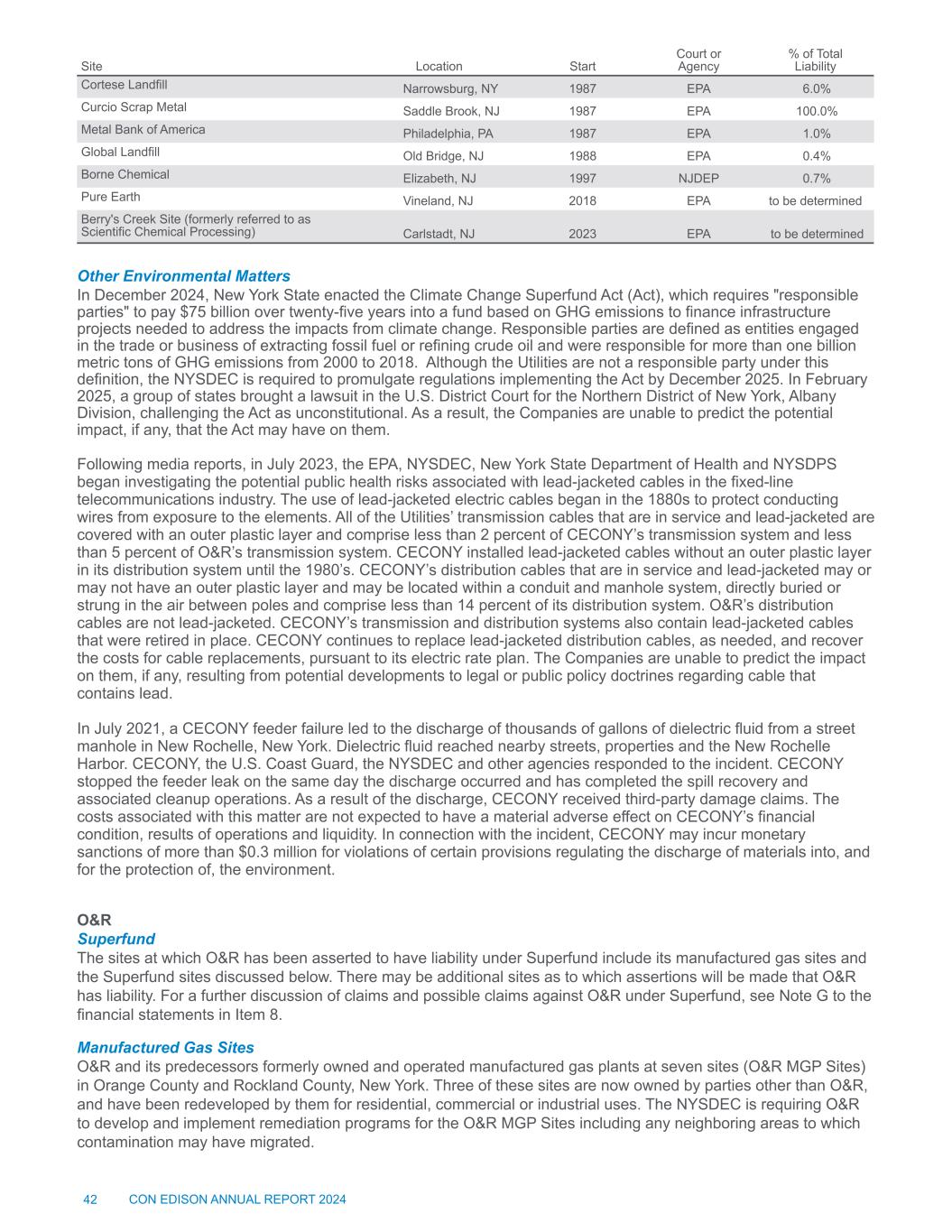 Site Location Start Court or Agency % of Total Liability Cortese Landfill Narrowsburg, NY 1987 EPA 6.0% Curcio Scrap Metal Saddle Brook, NJ 1987 EPA 100.0% Metal Bank of America Philadelphia, PA 1987 EPA 1.0% Global Landfill Old Bridge, NJ 1988 EPA 0.4% Borne Chemical Elizabeth, NJ 1997 NJDEP 0.7% Pure Earth Vineland, NJ 2018 EPA to be determined Berry's Creek Site (formerly referred to as Scientific Chemical Processing) Carlstadt, NJ 2023 EPA to be determined Other Environmental Matters In December 2024, New York State enacted the Climate Change Superfund Act (Act), which requires "responsible parties" to pay $75 billion over twenty-five years into a fund based on GHG emissions to finance infrastructure projects needed to address the impacts from climate change. Responsible parties are defined as entities engaged in the trade or business of extracting fossil fuel or refining crude oil and were responsible for more than one billion metric tons of GHG emissions from 2000 to 2018. Although the Utilities are not a responsible party under this definition, the NYSDEC is required to promulgate regulations implementing the Act by December 2025. In February 2025, a group of states brought a lawsuit in the U.S. District Court for the Northern District of New York, Albany Division, challenging the Act as unconstitutional. As a result, the Companies are unable to predict the potential impact, if any, that the Act may have on them. Following media reports, in July 2023, the EPA, NYSDEC, New York State Department of Health and NYSDPS began investigating the potential public health risks associated with lead-jacketed cables in the fixed-line telecommunications industry. The use of lead-jacketed electric cables began in the 1880s to protect conducting wires from exposure to the elements. All of the Utilities’ transmission cables that are in service and lead-jacketed are covered with an outer plastic layer and comprise less than 2 percent of CECONY’s transmission system and less than 5 percent of O&R’s transmission system. CECONY installed lead-jacketed cables without an outer plastic layer in its distribution system until the 1980’s. CECONY’s distribution cables that are in service and lead-jacketed may or may not have an outer plastic layer and may be located within a conduit and manhole system, directly buried or strung in the air between poles and comprise less than 14 percent of its distribution system. O&R’s distribution cables are not lead-jacketed. CECONY’s transmission and distribution systems also contain lead-jacketed cables that were retired in place. CECONY continues to replace lead-jacketed distribution cables, as needed, and recover the costs for cable replacements, pursuant to its electric rate plan. The Companies are unable to predict the impact on them, if any, resulting from potential developments to legal or public policy doctrines regarding cable that contains lead. In July 2021, a CECONY feeder failure led to the discharge of thousands of gallons of dielectric fluid from a street manhole in New Rochelle, New York. Dielectric fluid reached nearby streets, properties and the New Rochelle Harbor. CECONY, the U.S. Coast Guard, the NYSDEC and other agencies responded to the incident. CECONY stopped the feeder leak on the same day the discharge occurred and has completed the spill recovery and associated cleanup operations. As a result of the discharge, CECONY received third-party damage claims. The costs associated with this matter are not expected to have a material adverse effect on CECONY’s financial condition, results of operations and liquidity. In connection with the incident, CECONY may incur monetary sanctions of more than $0.3 million for violations of certain provisions regulating the discharge of materials into, and for the protection of, the environment. O&R Superfund The sites at which O&R has been asserted to have liability under Superfund include its manufactured gas sites and the Superfund sites discussed below. There may be additional sites as to which assertions will be made that O&R has liability. For a further discussion of claims and possible claims against O&R under Superfund, see Note G to the financial statements in Item 8. Manufactured Gas Sites O&R and its predecessors formerly owned and operated manufactured gas plants at seven sites (O&R MGP Sites) in Orange County and Rockland County, New York. Three of these sites are now owned by parties other than O&R, and have been redeveloped by them for residential, commercial or industrial uses. The NYSDEC is requiring O&R to develop and implement remediation programs for the O&R MGP Sites including any neighboring areas to which contamination may have migrated. 42 CON EDISON ANNUAL REPORT 2024